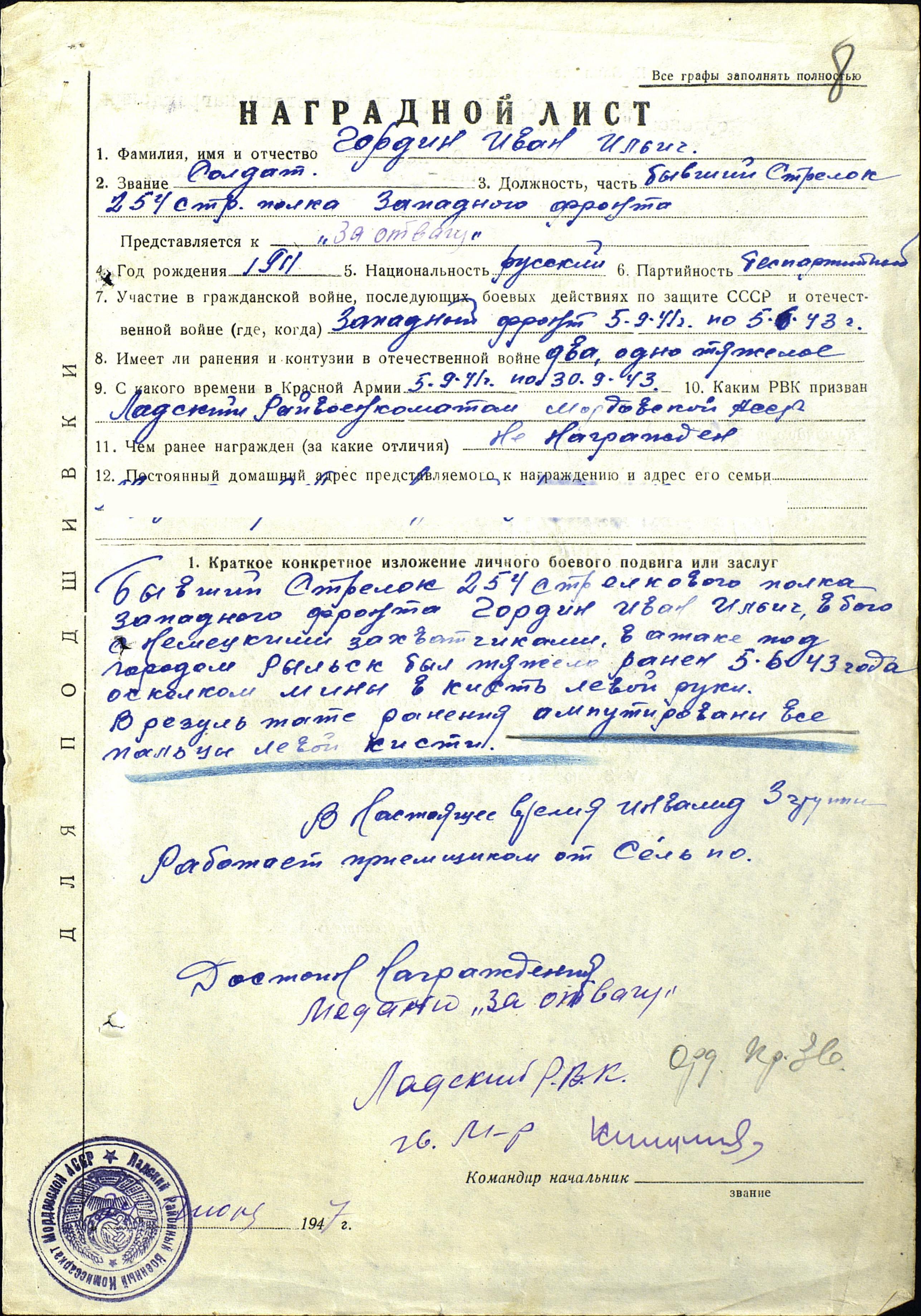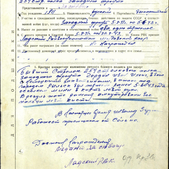 Ладским Райвоенкоматом МАССР в июне 1941 года. Являлся Стрелком 254-го