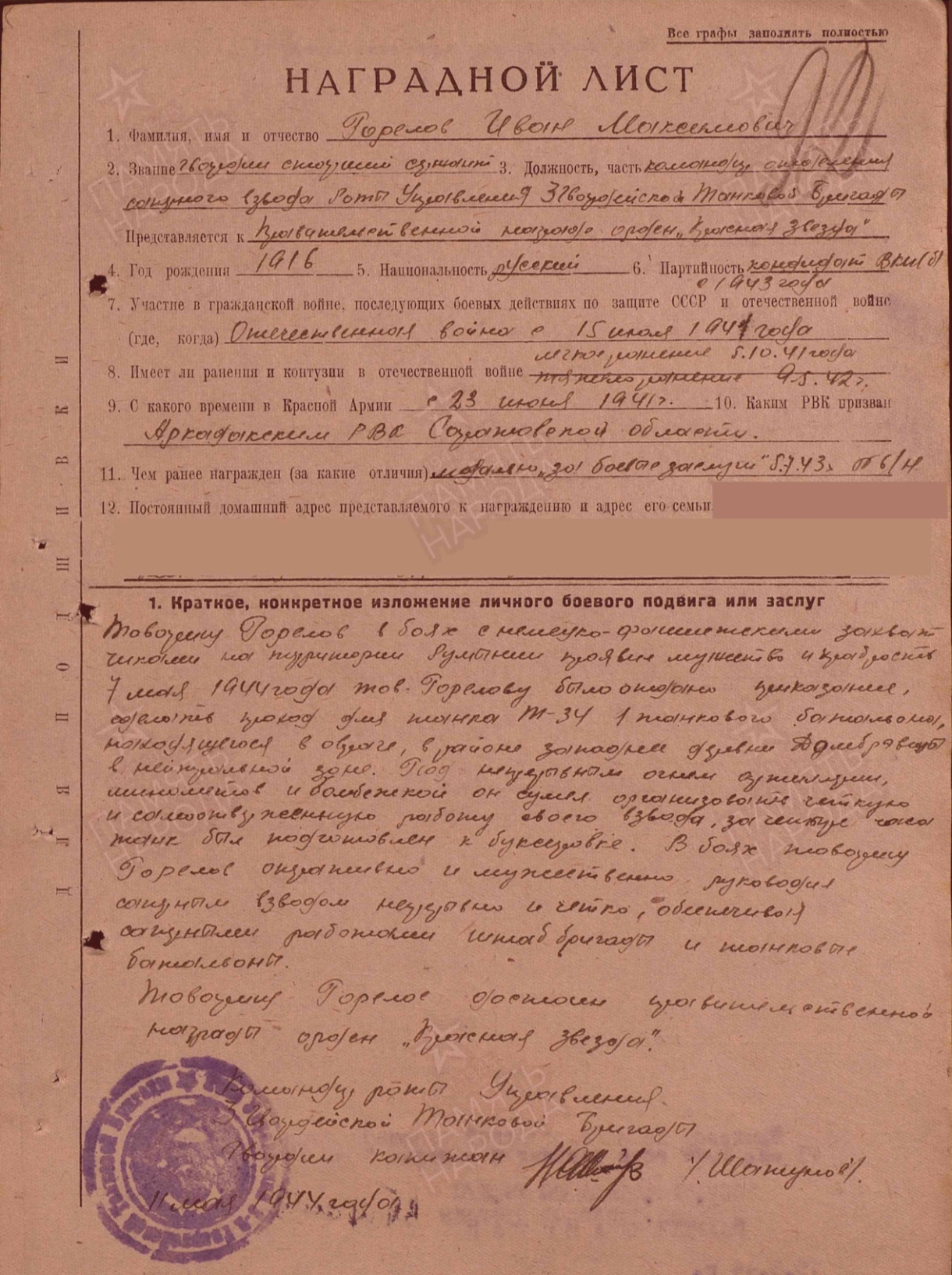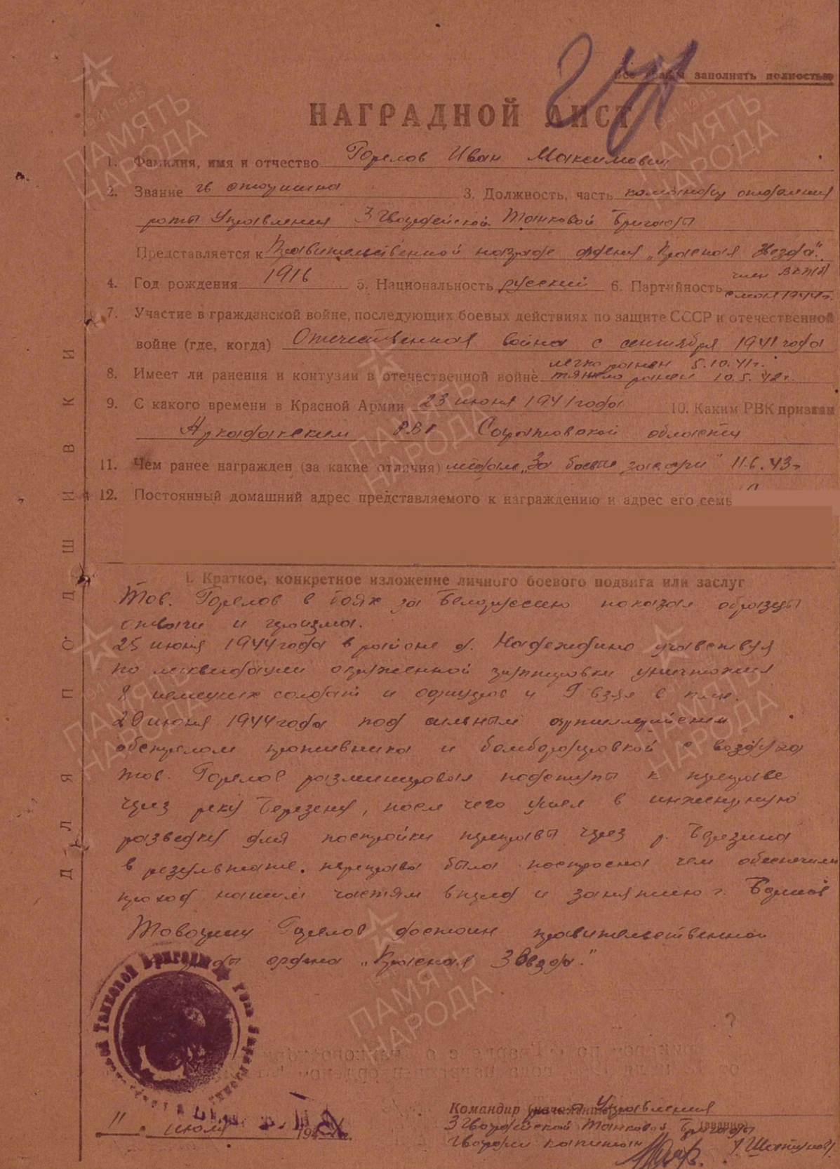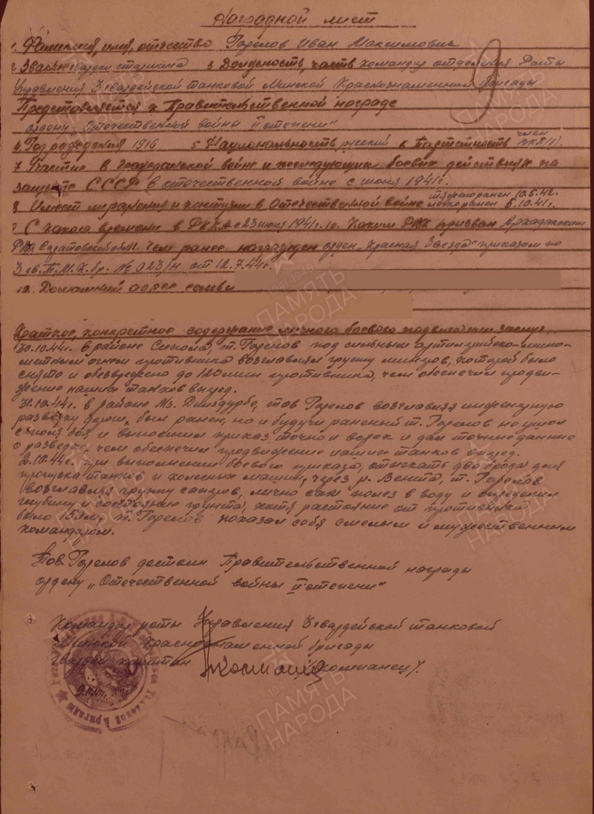 Товарищь Горелов в боях с немецко- фашистскими захват чиками на территории Румынии проявил мужество и храбрость в мае 1944 года тов. Горелову было отдано приказание, сделать проход для танка Т-34 1 танкового батальона, находящегося в овраге, в районе Западной деревни Дамбрявицы в нейтральной зоне. Под непрерывным огнем артиллерии, миномета и бомбежкой он сумел организовать четкую и самоотважную, работу своего взвода за четыре часа танк был подготовлен к буксировке. В боях Горелов оперативно и мужест венно руководил десантным взводом непрерывно и четко, обеспечивал) слажными работами штаб бригады и танковые войска Тов. Горелов в боях за Белоруссию показал образцы отваги и героизма 25 июня 1944 года в районе 9. Надеждино учавствуя по ликвидации окруженной группировки уничтожил 8 немецких солдат и офицеров и 9 взял в плен. 20 июня 1944 года под сильным артиллерийским обстрелом противника и бомбордировкой с воздуха тов. Горелов разминировал подступы к переправе через реку Березену, после чего ушел в инженерную разведку для постройки переправы через 1 Березина в результате. переправа была построено чем обеспечили проход нашим частям в г. Бались Десествуя в составе бригады на Бряиском, Сталинградском 4 Ворошенском Фронтах проявил себя смелым и решительным саперам В боях отечественной войны имеет одно тяжелое одно легкое ранения С Декабря 1942 года в районе Верхие чирская Дычковский сталинградский фронт/ под сильным обстрелам бомбардировной с воздуха противника тов. Горелов разминировал минные поля 28. 12.42 года в районе Генераловка, котельниково т. Горелов под сильным огнем проти вника снимал противотанковые мины противника и на водил переправу для проезда наших танков чем помог выполнть обще боевую задачу бригады. Тов. Горелов достои Правительственной награде краткое, конкрешное содержание смелость 30.10.44г. в) районе Сипола, т. Горелов под сильным артиллийско- минометным огнем противника возглавлял группу минеров, которой было снято и обезврежено до 120 мин противника, чем обеспечил продвижение наших танков вперед. 31.10.44г. в районе МЗ. Динздурбе, тов. Гарелов возглавляя инженерную разведку дороги, был ранен, но и будучи раненый т. Горелов не ушол с поля боя и выполнил приказ точно и всрок и дал точные данные о разведке, чем обеспечил продвижение наших танко в вперед. 2.10.44г. при выполнении боевого приказа, отыскать два борта для пропуска танков и колесных машин, через р. Вента, т. Гарелов возглавляя группу саперов, лично сам полез в воду и определил глубину и состояние грунта, хотя растояние от противника было 150 м, т. Горелов показал себя смелым и мужест венным командиром.