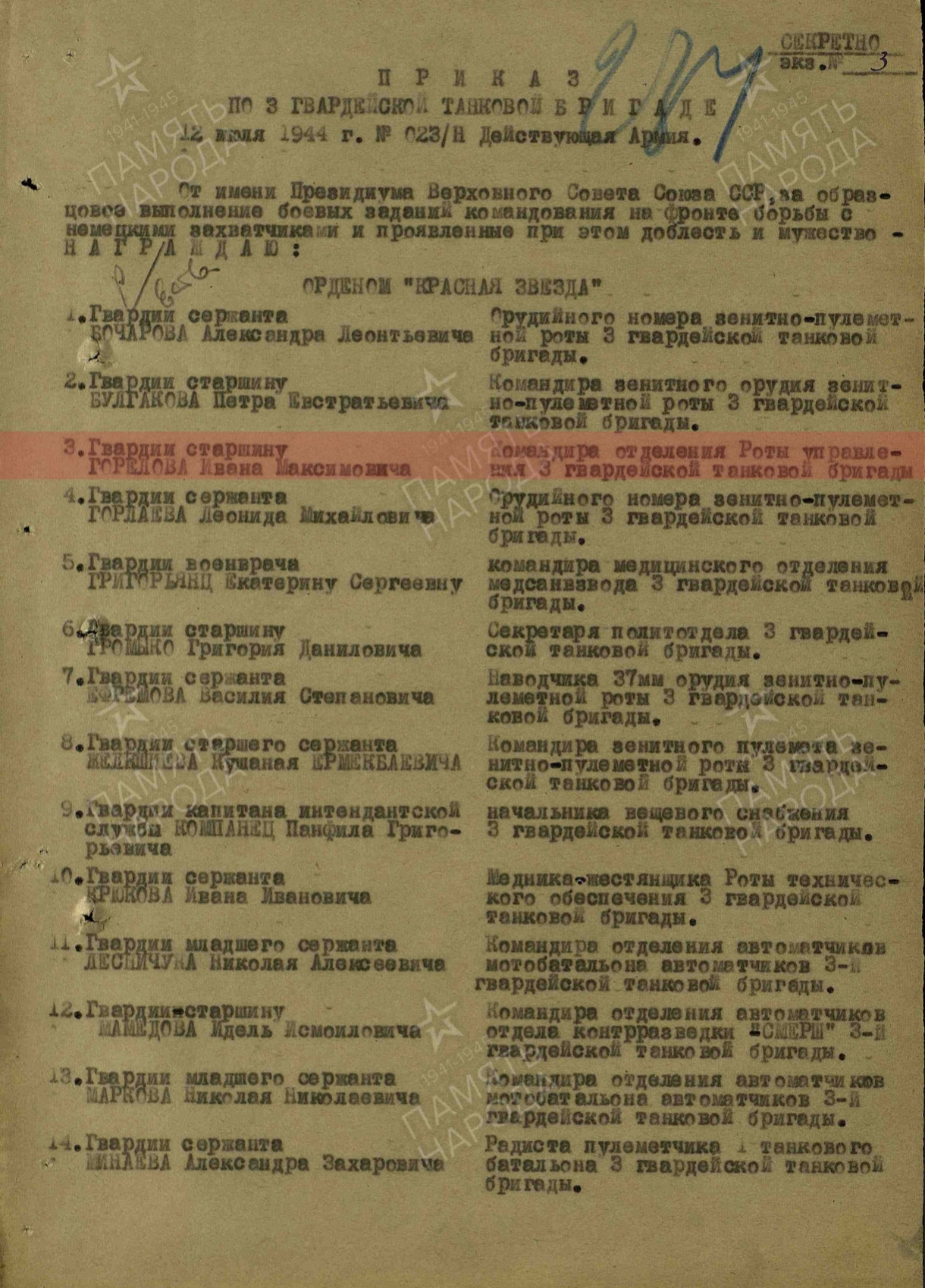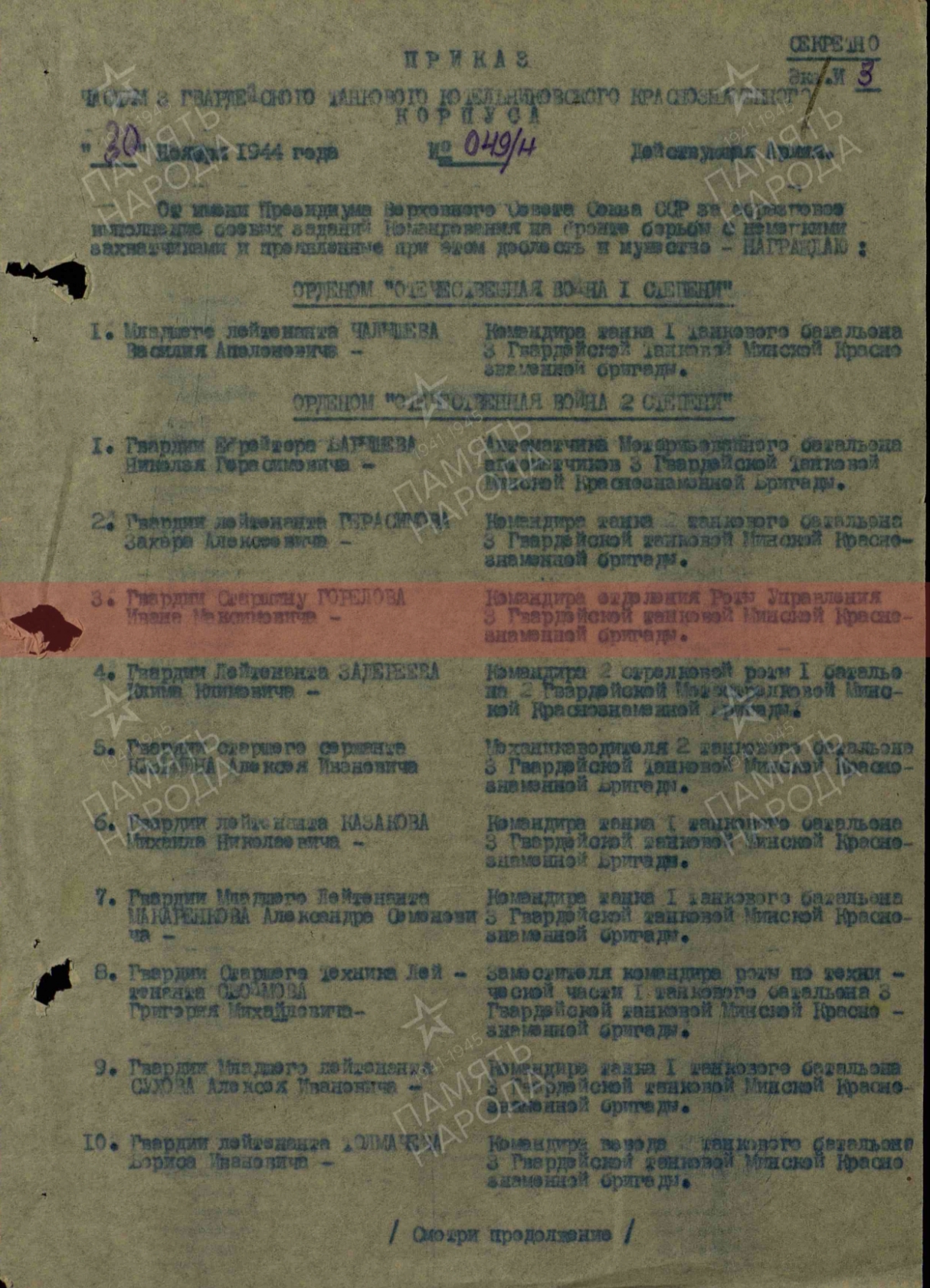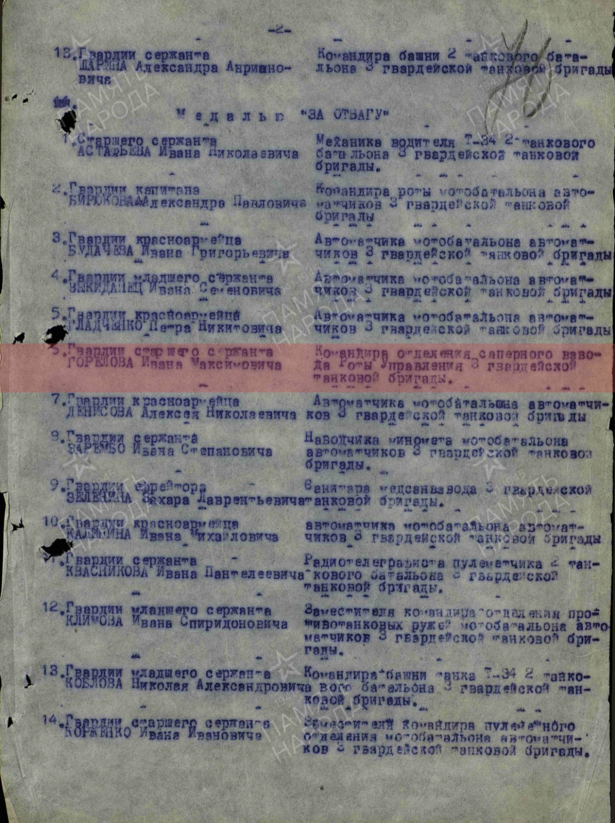 Товарищь Горелов в боях с немецко- фашистскими захват чиками на территории Румынии проявил мужество и храбрость в мае 1944 года тов. Горелову было отдано приказание, сделать проход для танка Т-34 1 танкового батальона, находящегося в овраге, в районе Западной деревни Дамбрявицы в нейтральной зоне. Под непрерывным огнем артиллерии, миномета и бомбежкой он сумел организовать четкую и самоотважную, работу своего взвода за четыре часа танк был подготовлен к буксировке. В боях Горелов оперативно и мужест венно руководил десантным взводом непрерывно и четко, обеспечивал) слажными работами штаб бригады и танковые войска Тов. Горелов в боях за Белоруссию показал образцы отваги и героизма 25 июня 1944 года в районе 9. Надеждино учавствуя по ликвидации окруженной группировки уничтожил 8 немецких солдат и офицеров и 9 взял в плен. 20 июня 1944 года под сильным артиллерийским обстрелом противника и бомбордировкой с воздуха тов. Горелов разминировал подступы к переправе через реку Березену, после чего ушел в инженерную разведку для постройки переправы через 1 Березина в результате. переправа была построено чем обеспечили проход нашим частям в г. Бались Десествуя в составе бригады на Бряиском, Сталинградском 4 Ворошенском Фронтах проявил себя смелым и решительным саперам В боях отечественной войны имеет одно тяжелое одно легкое ранения С Декабря 1942 года в районе Верхие чирская Дычковский сталинградский фронт/ под сильным обстрелам бомбардировной с воздуха противника тов. Горелов разминировал минные поля 28. 12.42 года в районе Генераловка, котельниково т. Горелов под сильным огнем проти вника снимал противотанковые мины противника и на водил переправу для проезда наших танков чем помог выполнть обще боевую задачу бригады. Тов. Горелов достои Правительственной награде краткое, конкрешное содержание смелость 30.10.44г. в) районе Сипола, т. Горелов под сильным артиллийско- минометным огнем противника возглавлял группу минеров, которой было снято и обезврежено до 120 мин противника, чем обеспечил продвижение наших танков вперед. 31.10.44г. в районе МЗ. Динздурбе, тов. Гарелов возглавляя инженерную разведку дороги, был ранен, но и будучи раненый т. Горелов не ушол с поля боя и выполнил приказ точно и всрок и дал точные данные о разведке, чем обеспечил продвижение наших танко в вперед. 2.10.44г. при выполнении боевого приказа, отыскать два борта для пропуска танков и колесных машин, через р. Вента, т. Гарелов возглавляя группу саперов, лично сам полез в воду и определил глубину и состояние грунта, хотя растояние от противника было 150 м, т. Горелов показал себя смелым и мужест венным командиром.