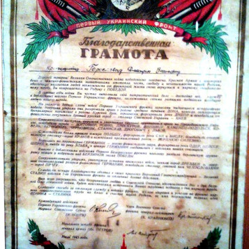 На третий день войны для защиты Отечества, в июне 1941 года слесарь-универсал местного МТС, отец двоих детей, Гореславец Дмитрий Васильевич, был мобилизован Приишимским РВК Северо-Казахстанской Области в Рабоче-Крестьянскую Красную Армию .В учебном лагере прошел ускоренный курс подготовки артиллеристов-минометчиков. На фронте с июля 1941 года, в составе 162 стрелковой дивизии 501 полка, в звании сержанта командовал минометным расчетом. С 1941 года по 09.01.1943 года полк участвовал в боях в составе Юго-Западного фронта на Харьковском направлении, Изюм, Барвенково, Ново-Михайловск, вел бои на Северном Кавказе.В первые месяцы войны, обеспечивая отход наших подразделений, минометная батарея по приказу выдвигалась к переднему краю обороны, при угрозе окружения своим огнем сдерживала наступление фашистов. Выполнив приказ, минометчики оказались на "временно оккупированной территории" и им предстояло самостоятельно выходить к дислокациям своих войск. Вышедших из окружения ,после обязательной проверки, направляли на переформирование. С лета 1943 года, после проверок и переформирования личного состава "окруженцев", продолжил воевать в составе 155 Армейской Пушечной Артиллерийской Новороссийско-Севастопольской Краснознаменной ордена Суворова 2-й степени Бригаде, разведчиком-мотоциклистом. 24 октября 1944 года командиром 155 АПАБР , Дмитрию Васильевичу была вручена медаль "За Оборону Кавказа". В 1944 году, в составе 1-го Украинского фронта, за период боев, по уничтожению окруженной группировки противника в районе г.Золочев, на территории Украины, в боях по расширению и удержанию плацдарма у реки Висла на территории Польши, Приказом командира от 12 октября 1944 года, награжден орденом "Красной Звезды". 155 АПАБР в составе 1-го Украинского фронта с боями прошла путь по освобождению Европы: Польши, немецкой Силезии, Дрездена, Праги и закончила войну в австрийском г.Амштеттене. В июле 1945 года Дмитрию Васильевичу была вручена "Благодарственная Грамота" от командующего войсками 1-го Украинского фронта маршала Советского Союза Ивана Степановича Конева, медали "За освобождение Праги", " За победу над Германией". Демобилизован в ноябре 1945 года.