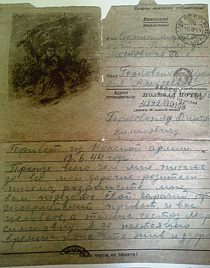 Боевой путь ветерана  У меня осталось только письмо с фронта, которое написал мой дед Горковенко Дмитрий Семенович. Спасибо ему за мирное небо над головой!