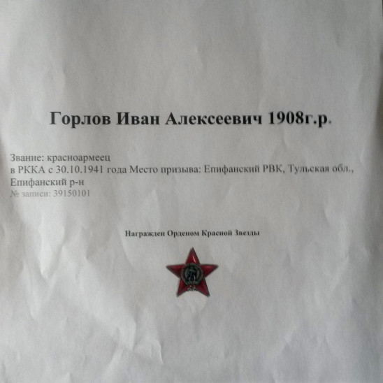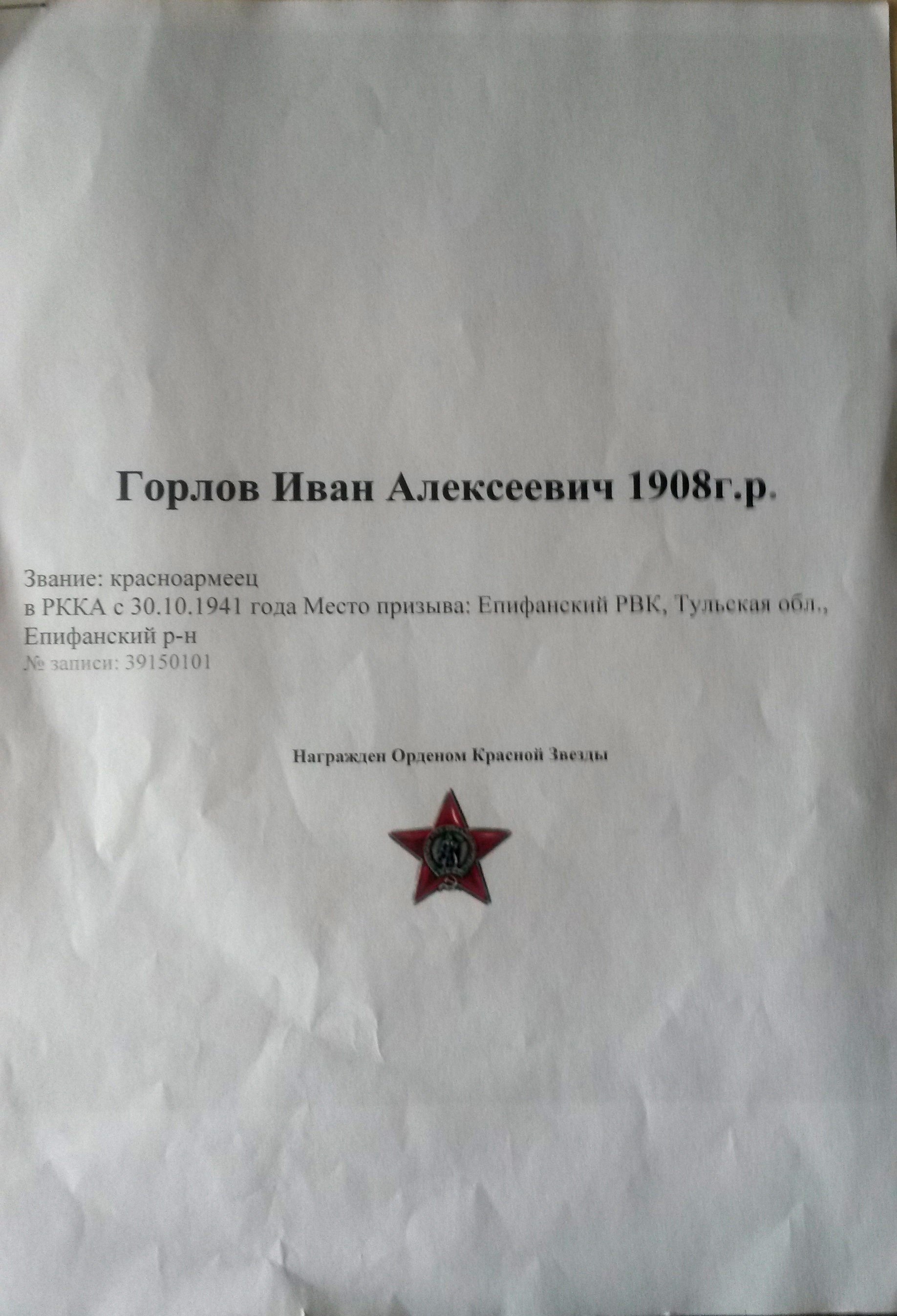 Горлов Иван Алексеевич.Красноармеец в должности Линейный надсмотрщик Телеграфно-Кабельной роты 13 Гв.отд.б-на связи.В Красной Армии с 30.10.1941года.Был призван Епифанским РВК Тульской области.