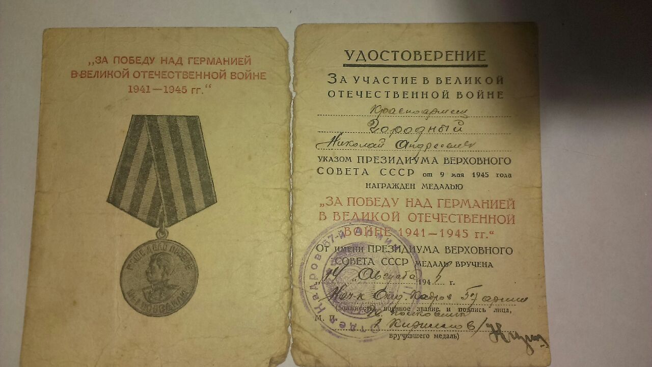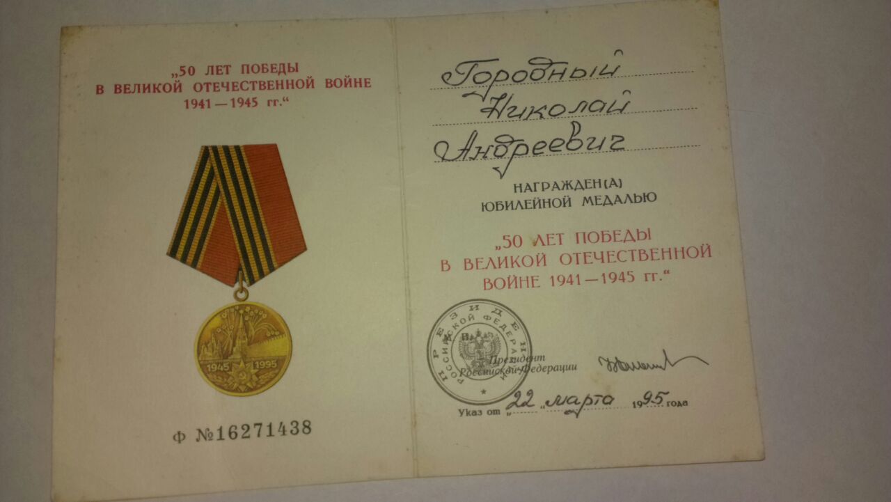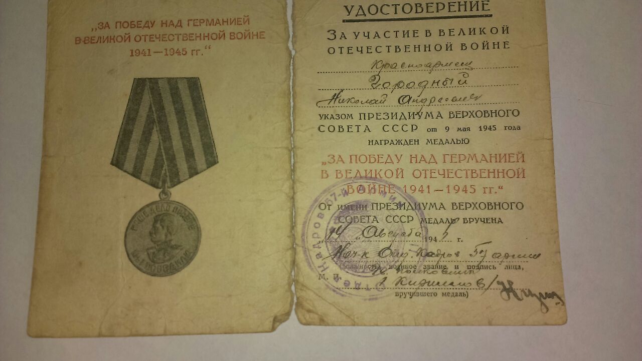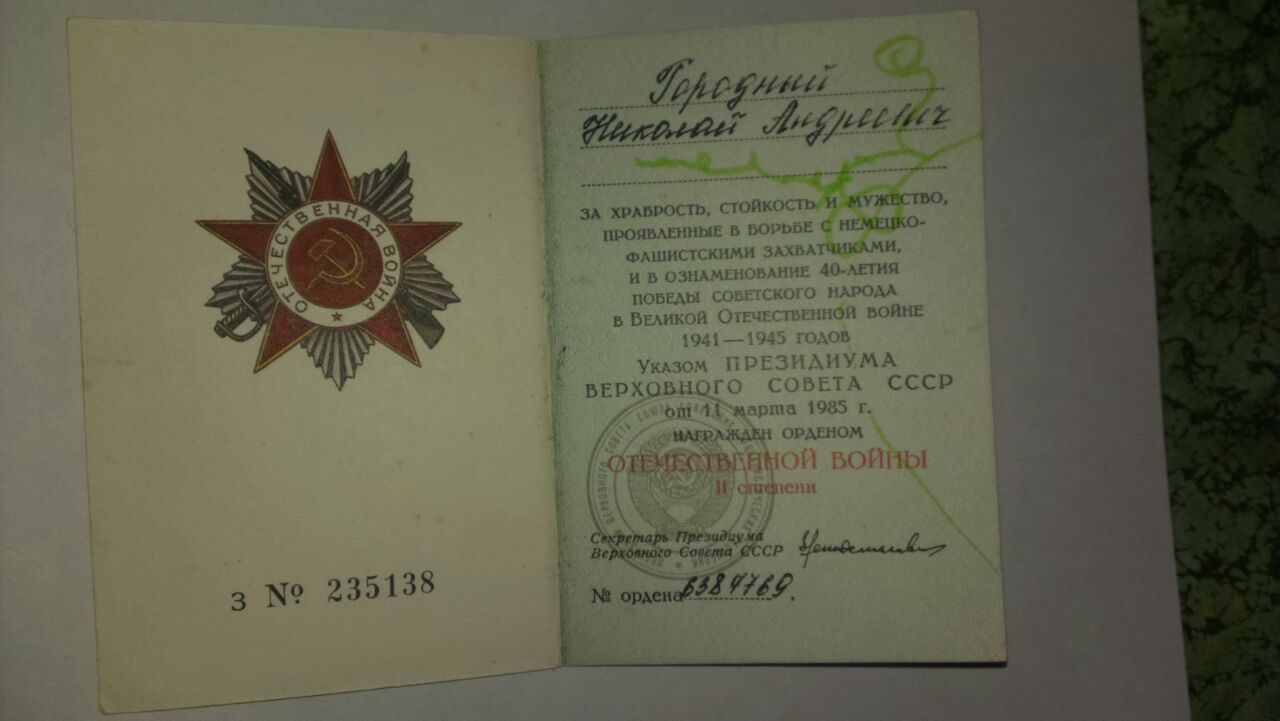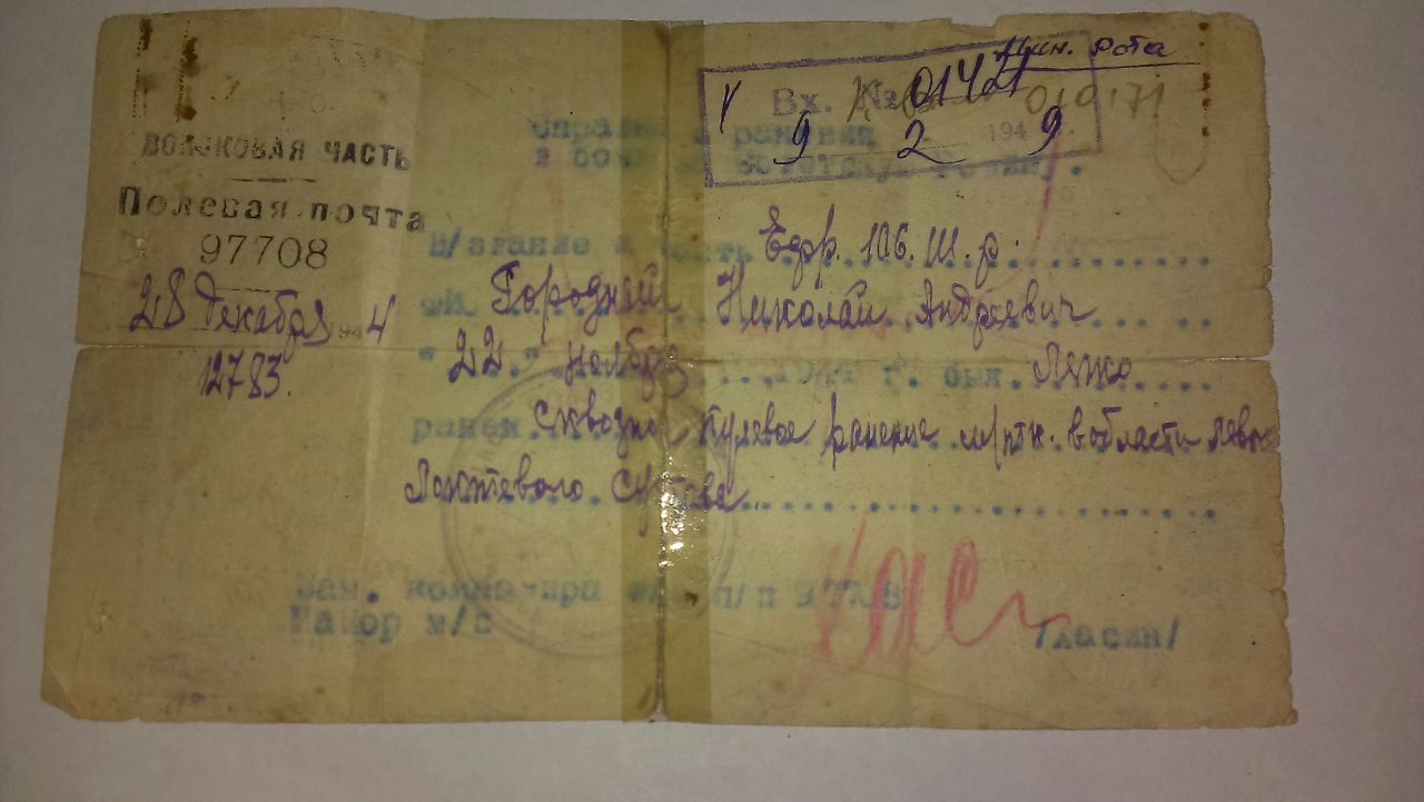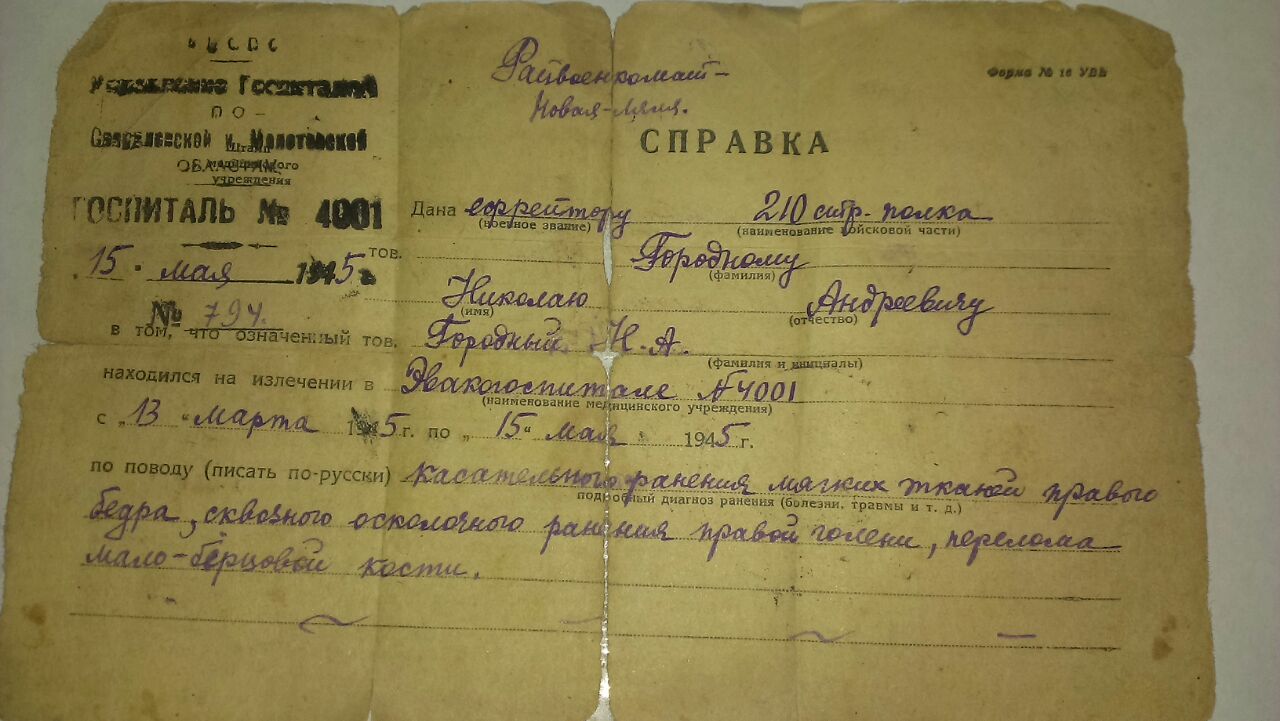 краснознамённого полка 71-й гвардейской стрелковой Витебской Ордена Ленина Краснознамённой дивизии, о чём свидетельствуют записи в военном билете. Гвардии ефрейтор Городный Н.А. 15 января 1945 года в районе латвийской деревни Яинспайли, выполняя боевую задачу, вступил в рукопашный бой с фашистами, уничтожил 2-х немецких солдат, получил тяжёлое осколочное ранение обеих ног. Ранение было тяжёлым, прадед два месяца находился на лечении в эвакогоспитале № 4001, где и встретил известие об окончании войны. За этот подвиг указом Президиума Верховного Совета СССР от 25 января 1945 года был награждён медалью «За Отвагу» и уже после войны - Орденом Отечественной войны II степени. После выписки из госпиталя окончания Николай Андреевич прослужил 7 лет в