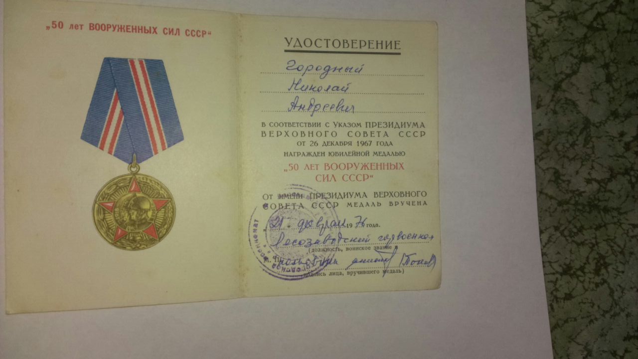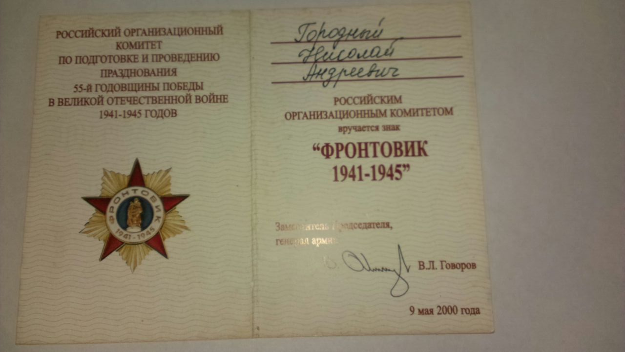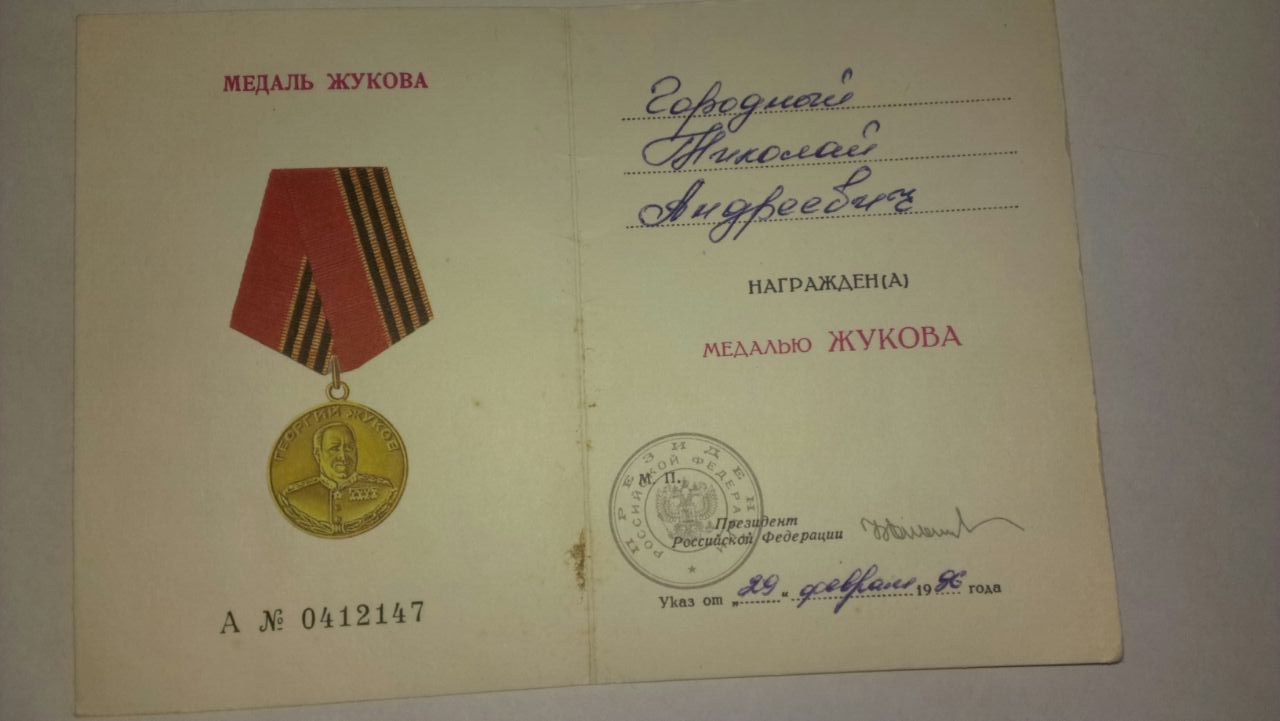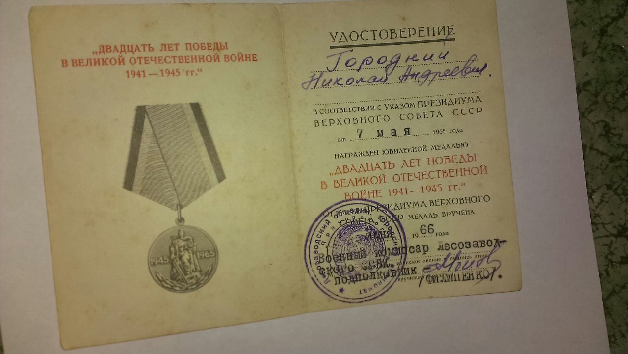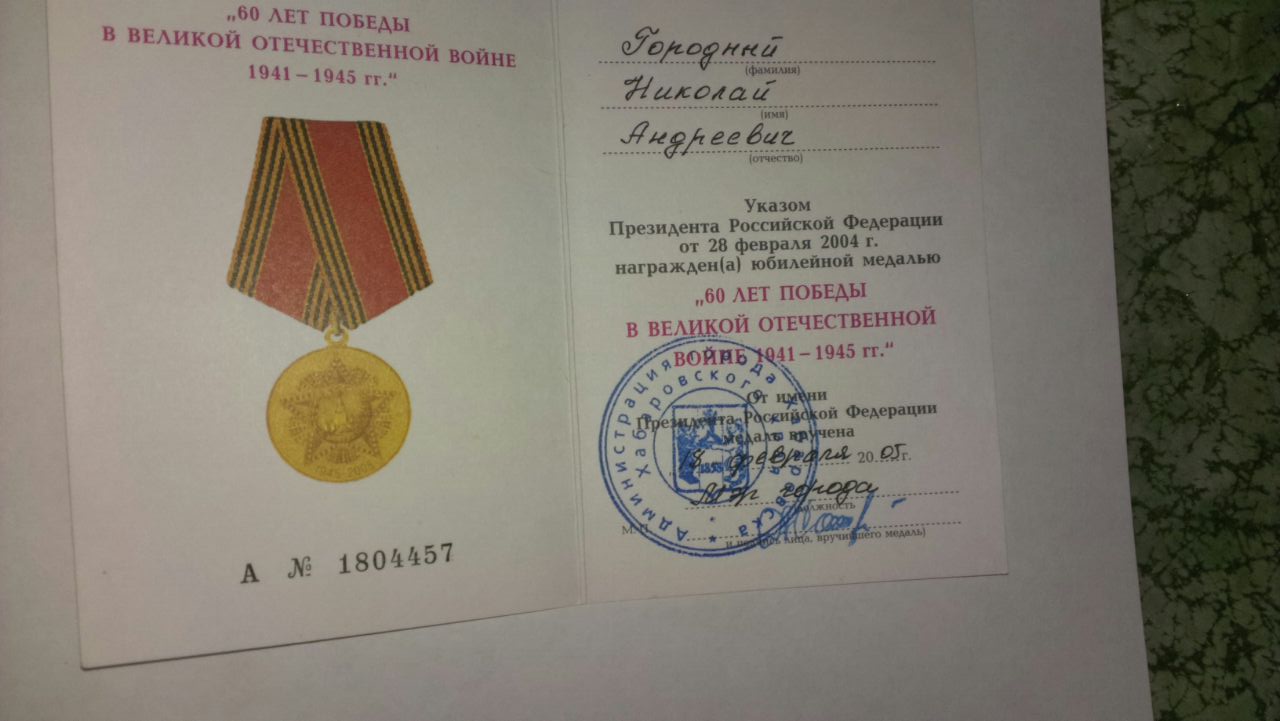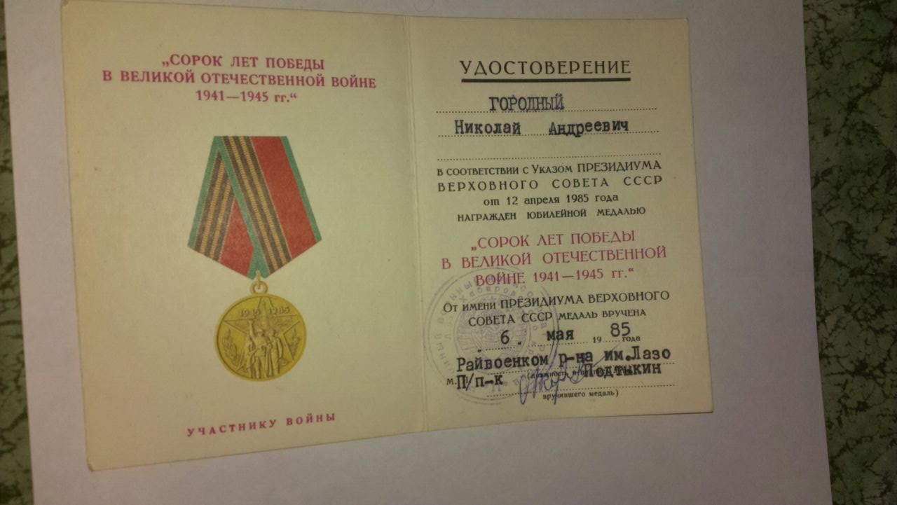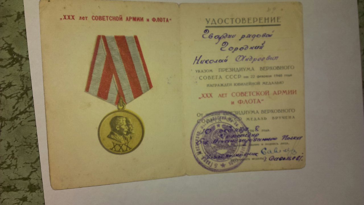 краснознамённого полка 71-й гвардейской стрелковой Витебской Ордена Ленина Краснознамённой дивизии, о чём свидетельствуют записи в военном билете. Гвардии ефрейтор Городный Н.А. 15 января 1945 года в районе латвийской деревни Яинспайли, выполняя боевую задачу, вступил в рукопашный бой с фашистами, уничтожил 2-х немецких солдат, получил тяжёлое осколочное ранение обеих ног. Ранение было тяжёлым, прадед два месяца находился на лечении в эвакогоспитале № 4001, где и встретил известие об окончании войны. За этот подвиг указом Президиума Верховного Совета СССР от 25 января 1945 года был награждён медалью «За Отвагу» и уже после войны - Орденом Отечественной войны II степени. После выписки из госпиталя окончания Николай Андреевич прослужил 7 лет в