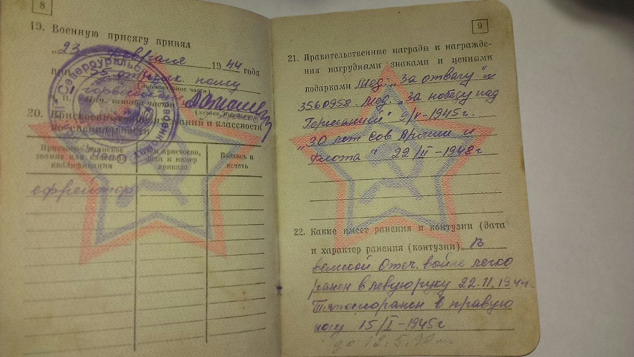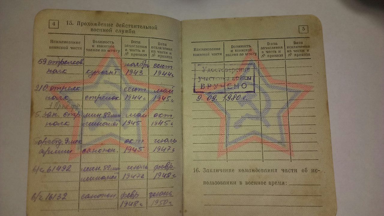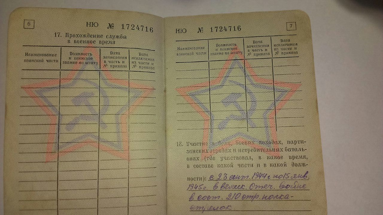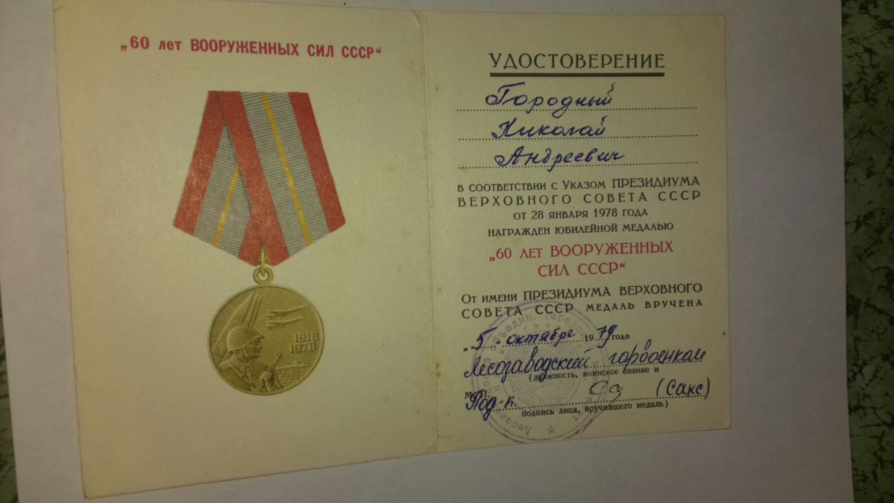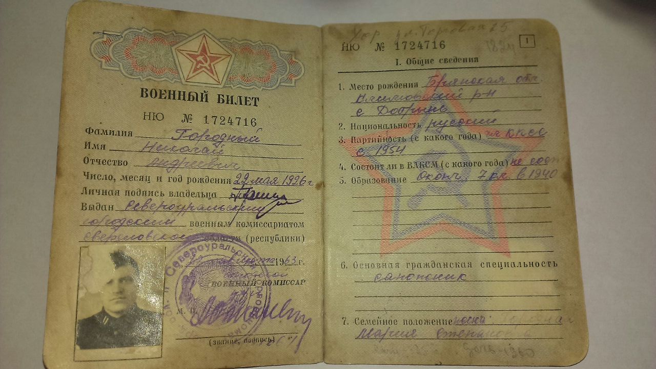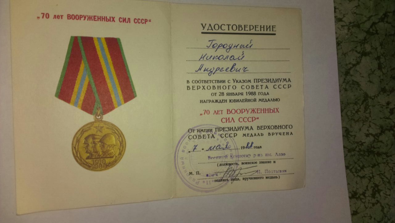 краснознамённого полка 71-й гвардейской стрелковой Витебской Ордена Ленина Краснознамённой дивизии, о чём свидетельствуют записи в военном билете. Гвардии ефрейтор Городный Н.А. 15 января 1945 года в районе латвийской деревни Яинспайли, выполняя боевую задачу, вступил в рукопашный бой с фашистами, уничтожил 2-х немецких солдат, получил тяжёлое осколочное ранение обеих ног. Ранение было тяжёлым, прадед два месяца находился на лечении в эвакогоспитале № 4001, где и встретил известие об окончании войны. За этот подвиг указом Президиума Верховного Совета СССР от 25 января 1945 года был награждён медалью «За Отвагу» и уже после войны - Орденом Отечественной войны II степени. После выписки из госпиталя окончания Николай Андреевич прослужил 7 лет в