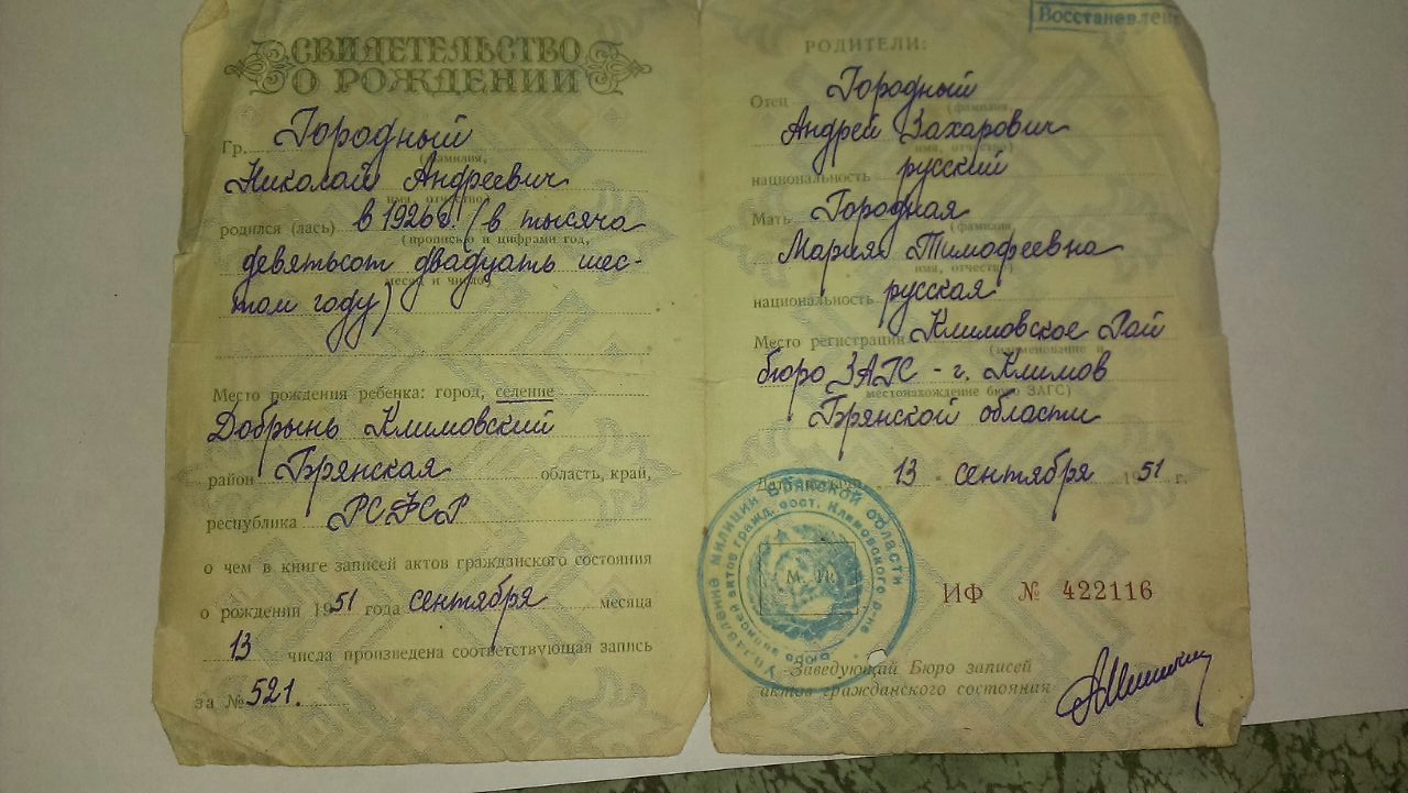 Мой прадед, Городный Николай Андреевич, родился 22 мая 1926 года в селе Добрынь Климовского района Брянской области. На фронт Николай Андреевич попал, когда был ещё почти мальчишкой – в 18 лет. Начал военную службу 23 сентября 1944 года в составе 210-го гвардейского стрелкового Полоцкого