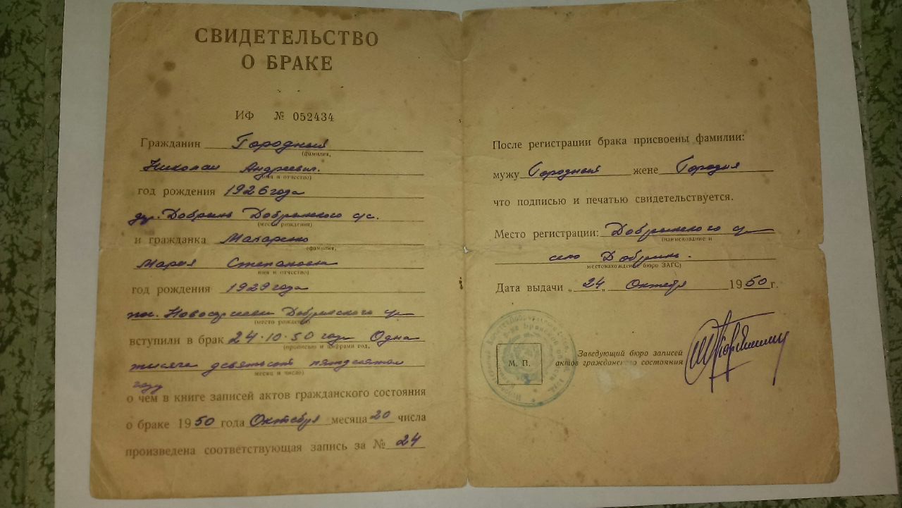 Молодые поженились 20 октября 1950 года в родной деревне моего прадеда - селе Добрынь Климовского района Брянской области. По воспоминаниям моей прабабушки, Марии Степановны, это были тяжёлые, нищие времена. Затем Николай и Мария приехали на Дальний Восток, в посёлок Хор Хабаровского края. Уволившись из рядов армии, мой прадед Городный Николай Андреевич стал работать мастером на Лесозаготовительном заводе. Семья Городных получила от завода отдельную комнату. Купили железную кровать (в то время в магазинах мебели не было), и это тогда было огромным