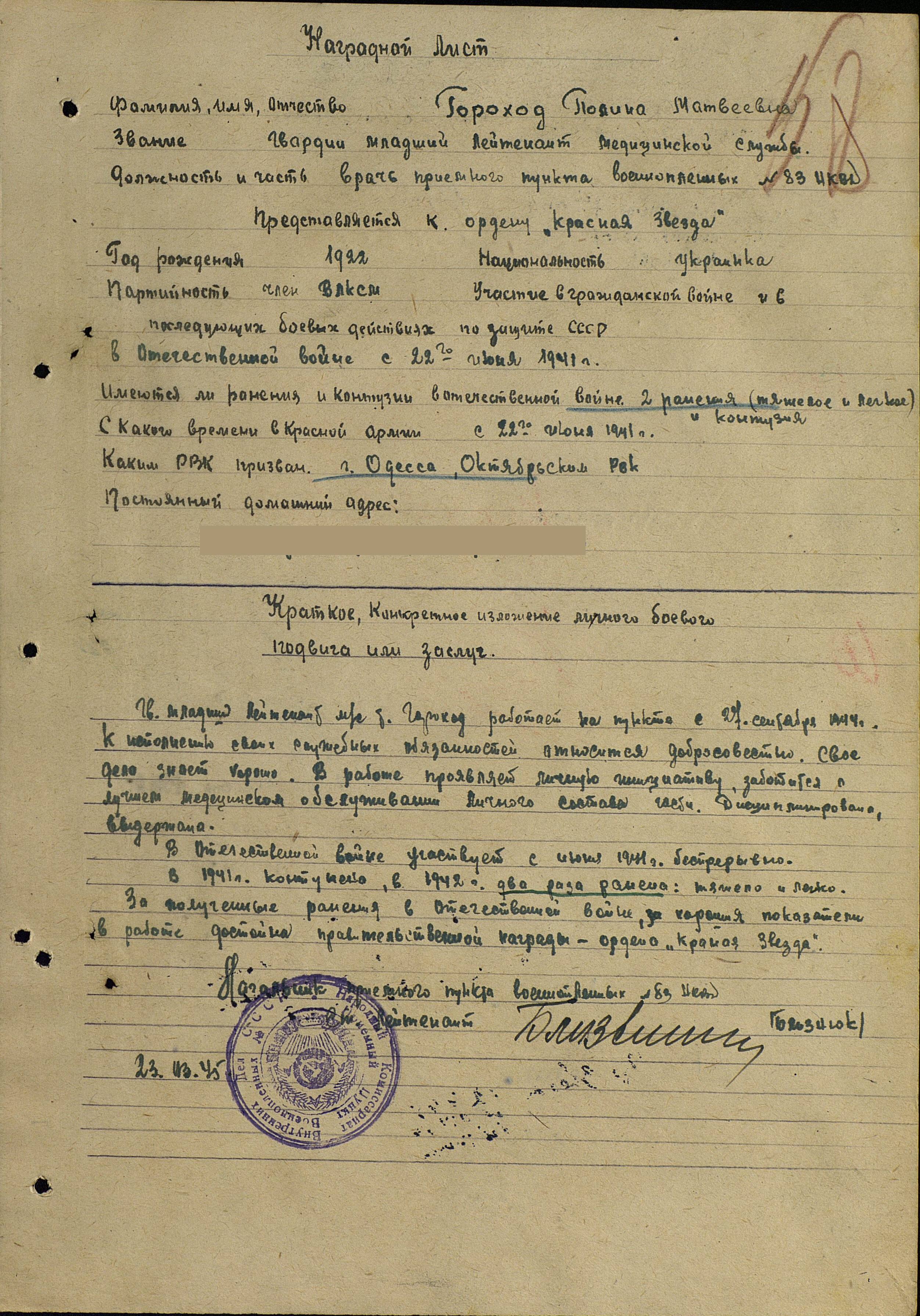 Полина Матвеевна Гороход ушла на фронт 19 летней девушкой 22 июня 1941 года. Будучи медсестрой спасала жизни раненным. Однажды вынесла с поля боя раненого офицера Лигостаева Дмитрия Дмитриевича( в последствии создали семью, воспитали двоих детей). Далее служила в звании гвардии младшего лейтенанта медицинской службы, врачем приемного пункта военнопленных N83 НКВД, 1 Гвардейской Танковой Армии.