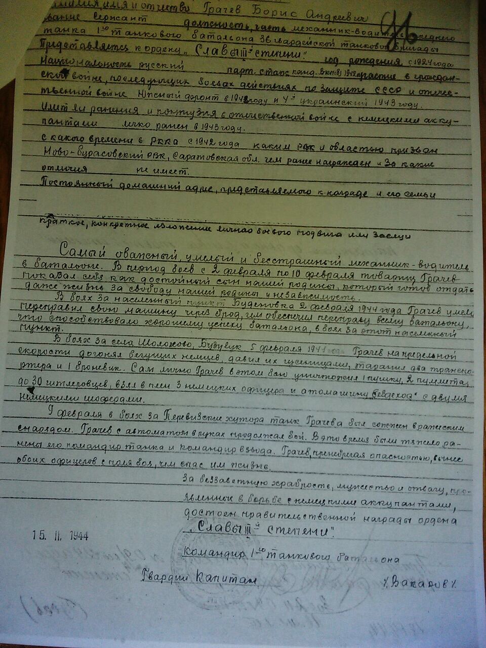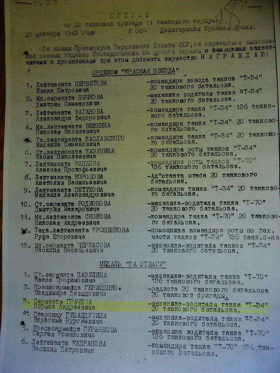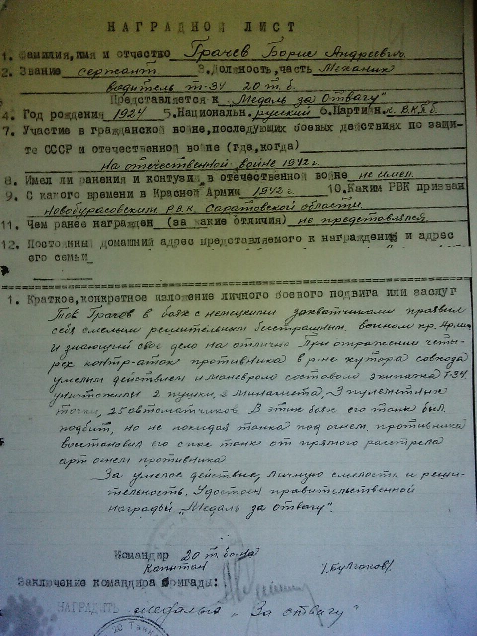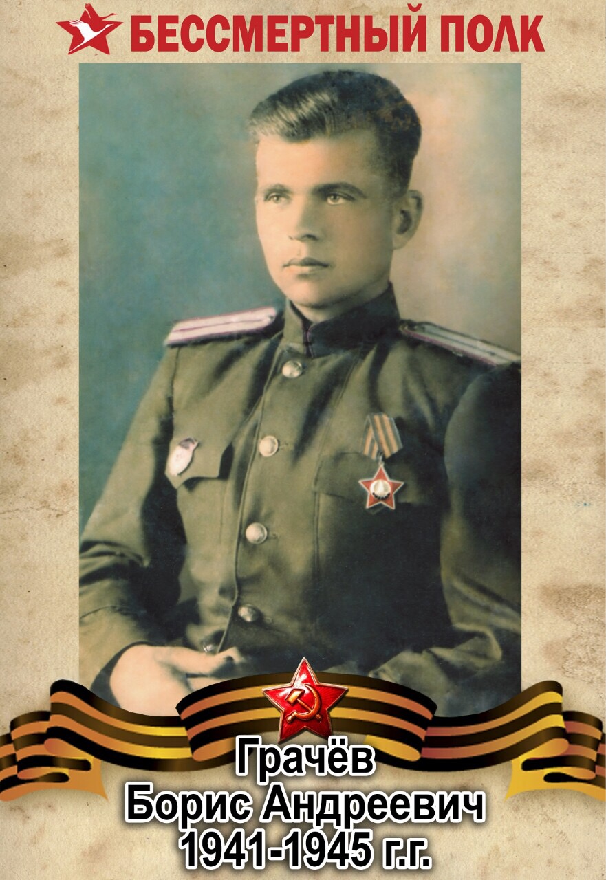 Как только началась война молодой курсант (Саратовского танкового училища) Грачёв Борис пошёл на фронт механиком танка Т-34, дедушка прошёл всю войну, отличился в танковых сражениях, в 1943 году под деревней Прохоровка на Курской дуге, за боевые заслуги был награждён орденом Славы I степени, командование наградило его тремя сутками отпуска, а заодно поручено было ему доставить танк в капитальный ремонт в город Волгоград. Так что по дороге танкист Борис Грачёв на боевом танке приехал в деревню Чернышевка Новобурасского района, там жила его семья. Вот где людей – то собралось! Одно дело – слышать о войне, а тут вот тебе – настоящий танк и настоящий солдат. В мае 1945 года дедушка дошёл до стен Берлина, принимал участие в первом параде на Красной площади. Для русского офицера Грачёва война закончилась не скоро. С 1945 года по 1949 год вместе с семьёй дедушка успел побывать ещё и в Северной Корее. Русская армия помогала урегулировать отношения между Северной и Южной Кореей. В 1957 году в числе первых мой дедушка открыл нефть в селе Урицкое Лысогорского района, работал на буровых.