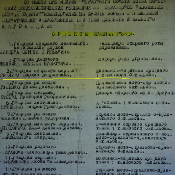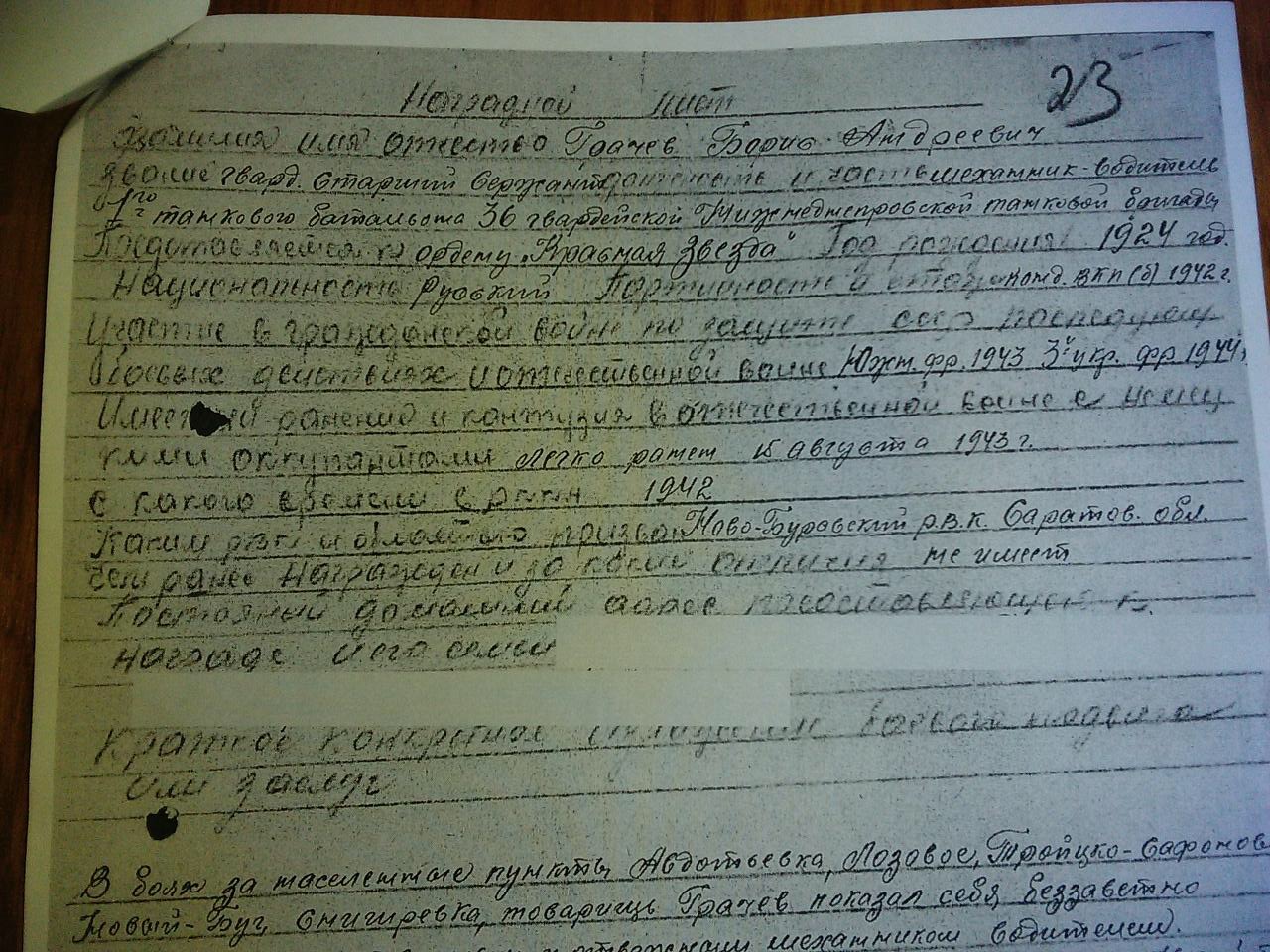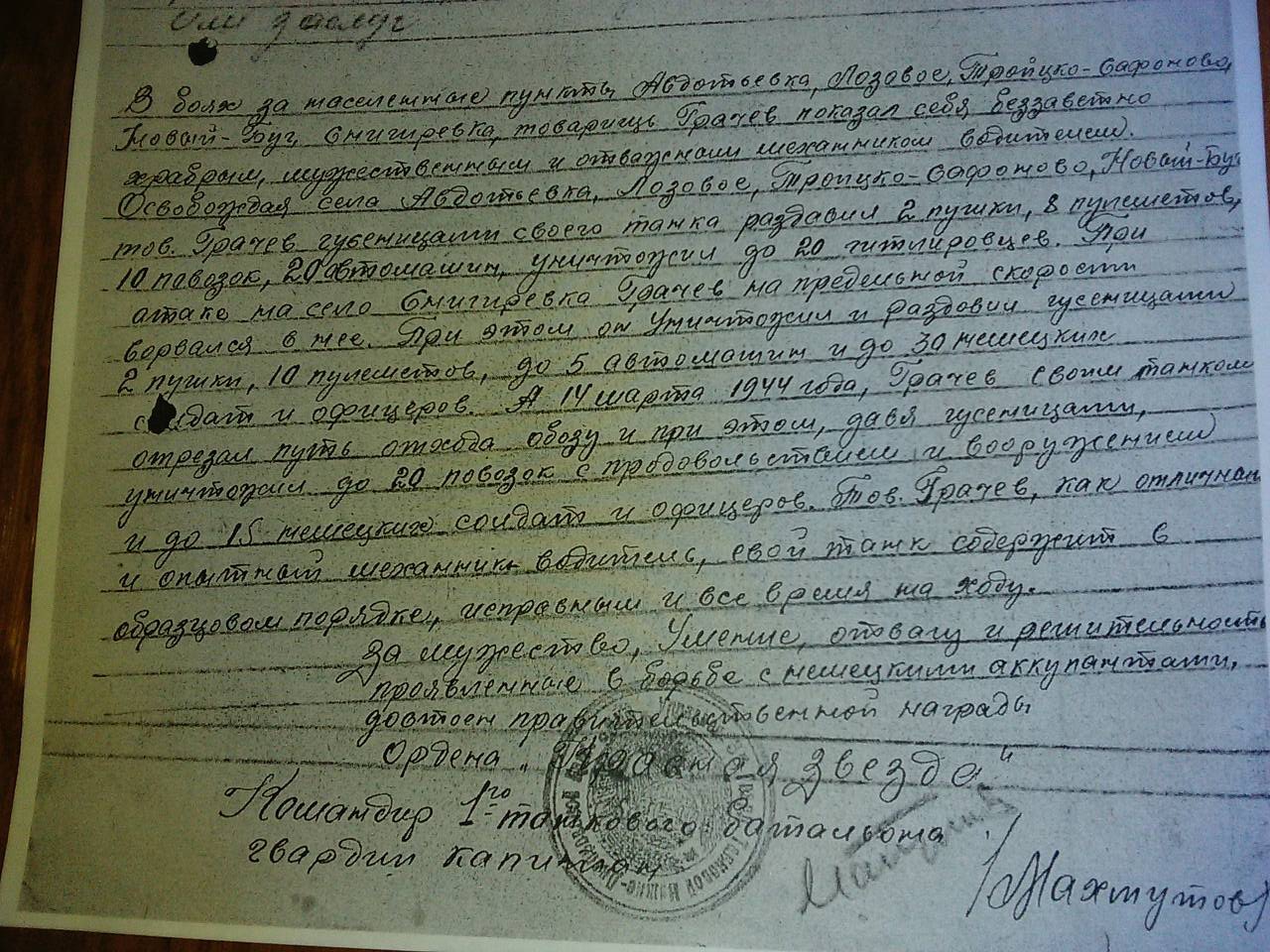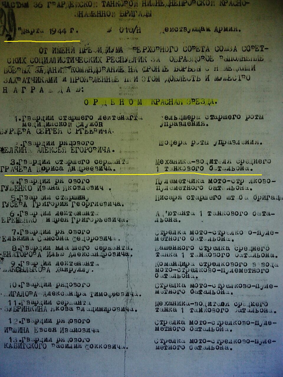 Как только началась война молодой курсант (Саратовского танкового училища) Грачёв Борис пошёл на фронт механиком танка Т-34, дедушка прошёл всю войну, отличился в танковых сражениях, в 1943 году под деревней Прохоровка на Курской дуге, за боевые заслуги был награждён орденом Славы I степени, командование наградило его тремя сутками отпуска, а заодно поручено было ему доставить танк в капитальный ремонт в город Волгоград. Так что по дороге танкист Борис Грачёв на боевом танке приехал в деревню Чернышевка Новобурасского района, там жила его семья. Вот где людей – то собралось! Одно дело – слышать о войне, а тут вот тебе – настоящий танк и настоящий солдат. В мае 1945 года дедушка дошёл до стен Берлина, принимал участие в первом параде на Красной площади. Для русского офицера Грачёва война закончилась не скоро. С 1945 года по 1949 год вместе с семьёй дедушка успел побывать ещё и в Северной Корее. Русская армия помогала урегулировать отношения между Северной и Южной Кореей. В 1957 году в числе первых мой дедушка открыл нефть в селе Урицкое Лысогорского района, работал на буровых.