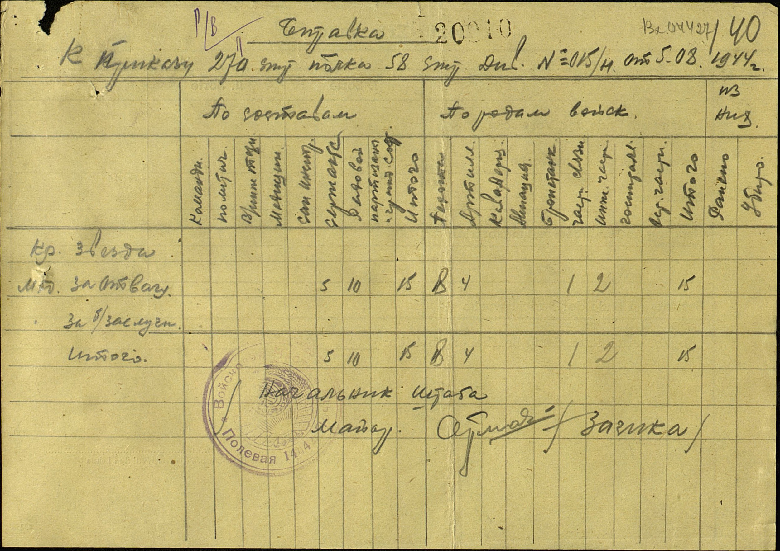 медалью "За Отвагу" (приказ №15/н от 05.08.1944 г.). Основание для