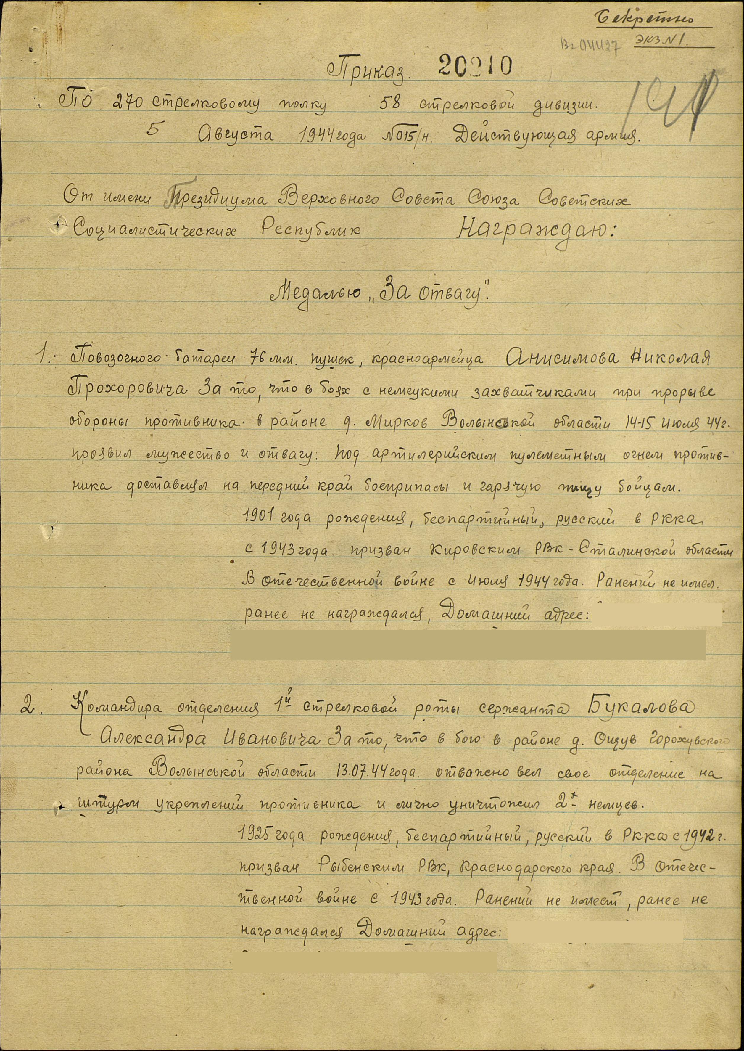 270 стрелковом полку 58 стрелковой дивизии. 5.08.1944 был награждён