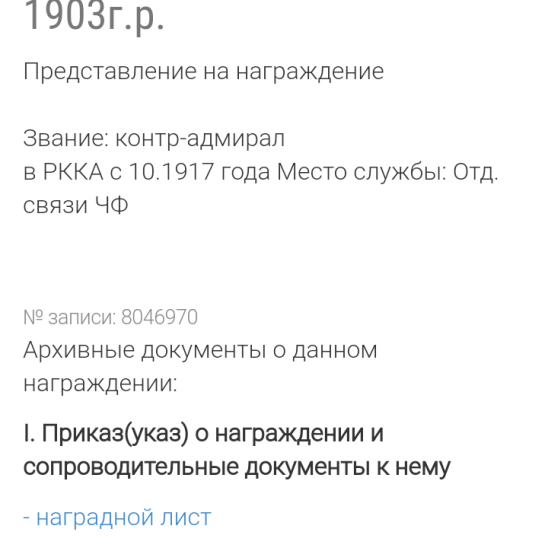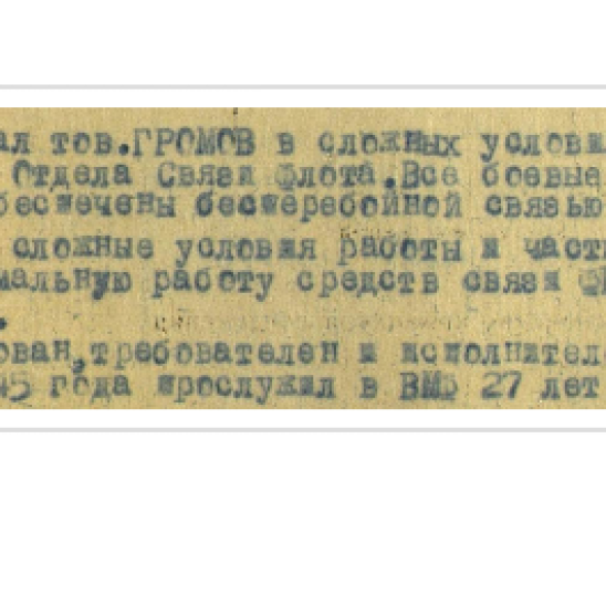 Громов Георгий Гаврилович, контр-адмирал, 18.04.1903 г.р. В годы войны руководил связью на всем Черноморском флоте. На момент мая 1945 г. Его стаж в войсках ВМФ составлял 27 лет!
