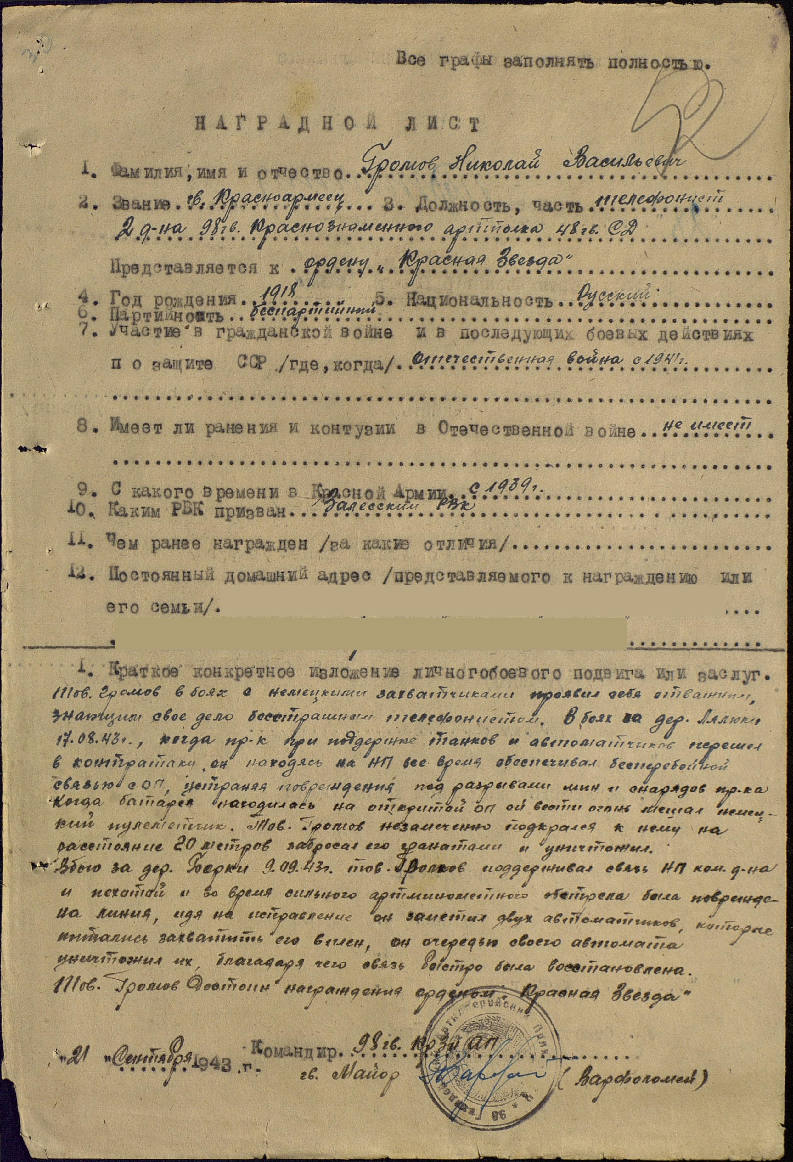 Громов Николай Васильевич родился в 1918 году в крестьянской семье в д. Доенкино, Залесного района ( ныне Семёновский район ), Нижегородской губернии ( ныне Нижегородская обл.). Работал в колхозе " Красное Знамя". В 1939 году призван в РККА. С первых дней начала ВОВ на защите рубежей Родины.К сожалению где служил до 1943 года неизвестно т.к. все письма и документы сгорели в пожаре в 1954 году. В 1943 г.,Громов Николай Васильевич телефонист 2-го дивизиона,98-го гвардейского Краснознамённого артполка,48-й гвардейской стрелковой дивизии. 21 сентября 1943 года представлен командованием артполка к Ордену "Красная Звезда", награждён Медалью "За Отвагу". Выписка из наградного листа: "Товарищ Громов в боях с немецкими захватчиками проявил себя отважным,знающим своё дело бесстрашным телефонистом. В боях за д.Лялюки 17.08.43 г.,когда противник при поддержке танков и автоматчиков перешёл в контратаку, он находясь на НП ( наблюдательный пункт ) всё время обеспечивал бесперебойной связью с ОП ( огневая позиция ),устраняя повреждения под разрывами мин и снарядов противника. Когда батарея находилась на открытой ОП ( огневой позиции ), ей вести огонь мешал немецкий пулемётчик. Тов. Громов незамеченно подкрался к нему на расстояние 20 метров забросал гранатами и уничтожил. В бою за д. Борки 9.09.43 г., тов. Громов поддерживал связь НП ( наблюдательный пункт ) командира дивизиона и пехотой и во время сильного артминомётного обстрела была повреждена линия связи, идя на исправление он заметил двух автоматчиков, которые пытались захватить его в плен, он очередью своего автомата уничтожил их, благодаря чему связь быстро была восстановлена ...".