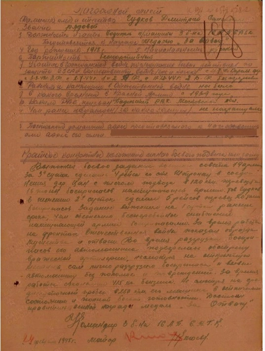 Мой дедушка , он умер до моего рождения. Но моя бабушка и мама свято хранят память о нем , в фотографиях, наградах, документах и историях. Они часто рассказывают о дедушке. Как он воевал, как был контужен, как его парализовало уже после войны, но из за военных травм.... Дедушка был водителем, перевозил на грузовой машине снаряды. Согласно архивным документам, которые мне удалось найти, медаль "За боевые заслуги" дедушка получил за то, что выполнил порученное задание на сутки раньше срока и в большем объеме, чем обеспечил бесперебойное снабжение наступающей армии боеприпасами. Во время разгрузки боеприпасов его машина подверглась обстрелу. Несмотря на открытую местность, дедушка сам лично разгрузил боеприпасы и вывел машину без поломок и повреждений. Походы, в которых участвовал дедушка: - Западный фронт с 1941г по 1944 г - 1 и 2 Прибалтийский фронт декабрь 1944г - 2ой Белорусский фронт декабрь 1944г - май 1945г - 1ый Дальневосточный фронт сентябрь 1945г Демобилизован на основании Указа Президиума Верховного Совета СССР от 20 марта 1946 года. Помимо медали "За боевые заслуги" дедушка имел и другие награды: "За победу над Германией в Великой Отечественной Войне 1941-1945гг* и "За победу над Японией". Боевой путь Место призыва Подольский РВК, Московской обл Боевое подразделение 16 автп СВГК 19 А Дата призыва 1939 Принимал участие - Западный фронт с 1941г по 1944 г - 1 и 2 Прибалтийский фронт декабрь 1944г - 2ой Белорусский фронт декабрь 1944г - май 1945г - 1ый Дальневосточный фронт сентябрь