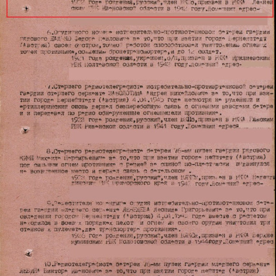 "В боях за высоту 568 (Южнее города Вильгельмсбург) 26.04.45 шел впереди стрелковой роты, разведывал огневые точки противника и отыскивал путь для проезда батареи. Впереди услышал стоны раненых. Товарищ Гусев быстро подполз к ним, оказав первую помощь и вынес с поля боя 3-х раненых офицеров