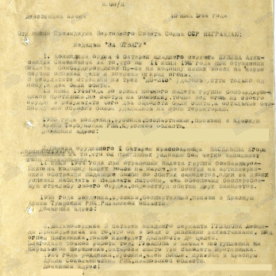 отвагу» 13.06.1944. Приказ подразделения: №: 8/н от: 15.06.1944 Издан: 1393