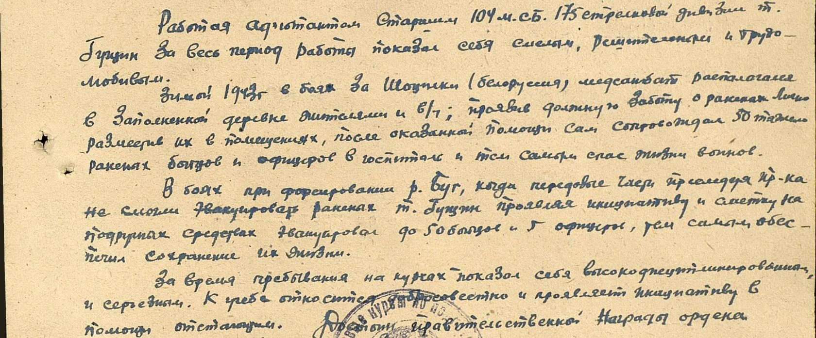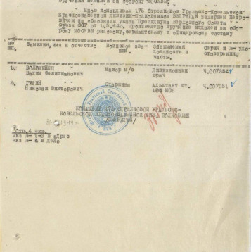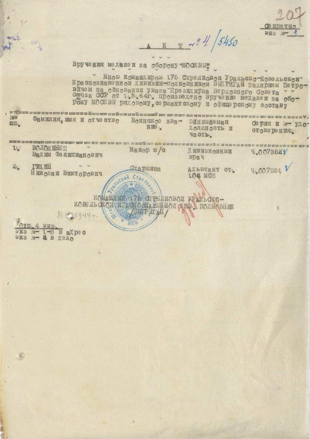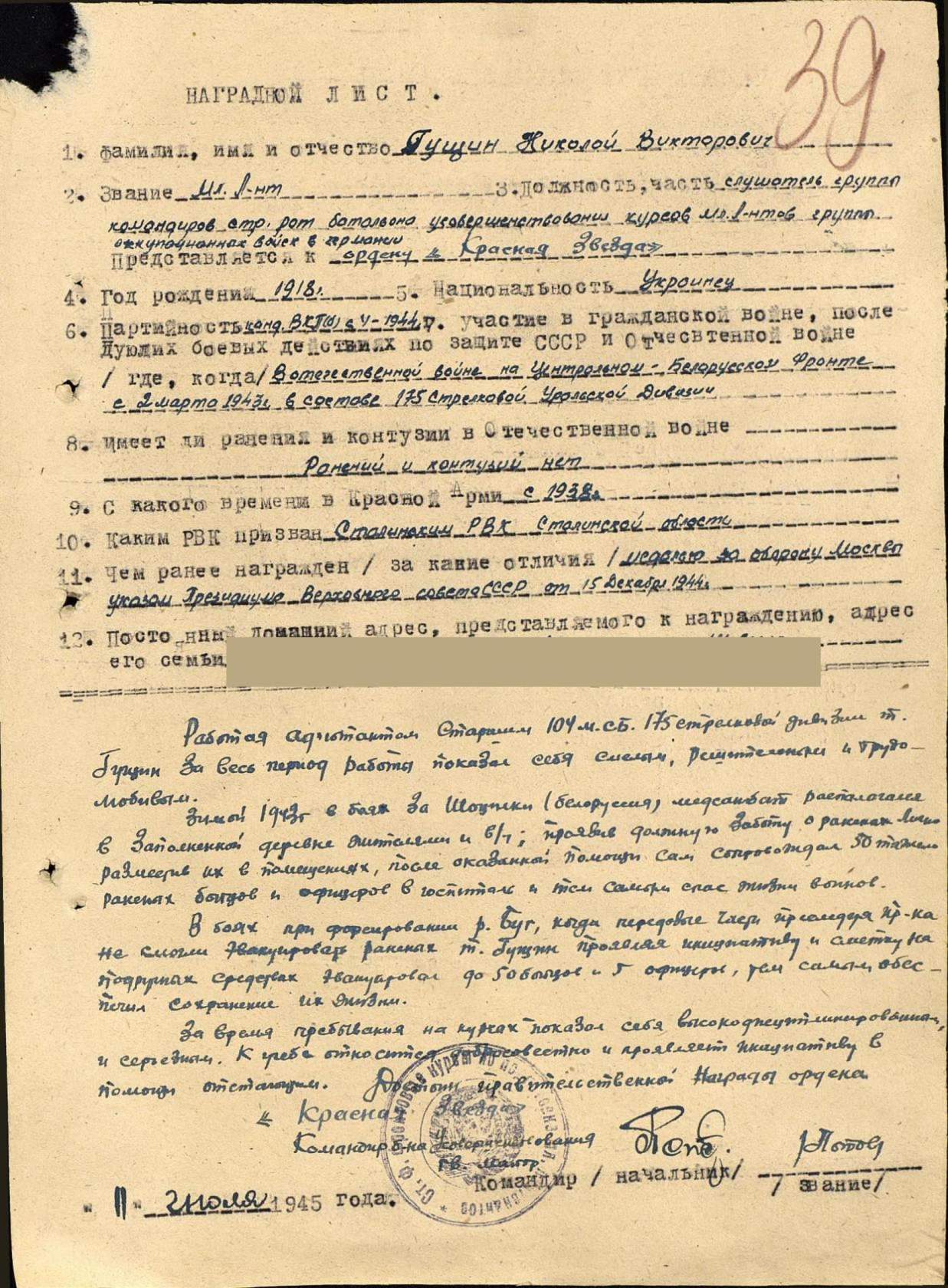 Гущин Николай Викторович – с 1938-го года красноармеец 81-го погранотряда Средне-Азиатского военного округа. Участник Парада 1941-го года на Красной Площади в Москве. Участвовал в обороне Москвы (награжден медалью «За оборону Москвы»). Также награжден: двумя орденами «Красная Звезда», орденом Отечественной войны II степени, медалями: «За боевые заслуги», «За освобождение Варшавы», «За взятие Берлина», «За победу над Германией» и другими юбилейными медалями. С мая 1945 по 1950 гг. – служба в Советской армии в составе группы Советских войск в Германии. Гвардии майор запаса.