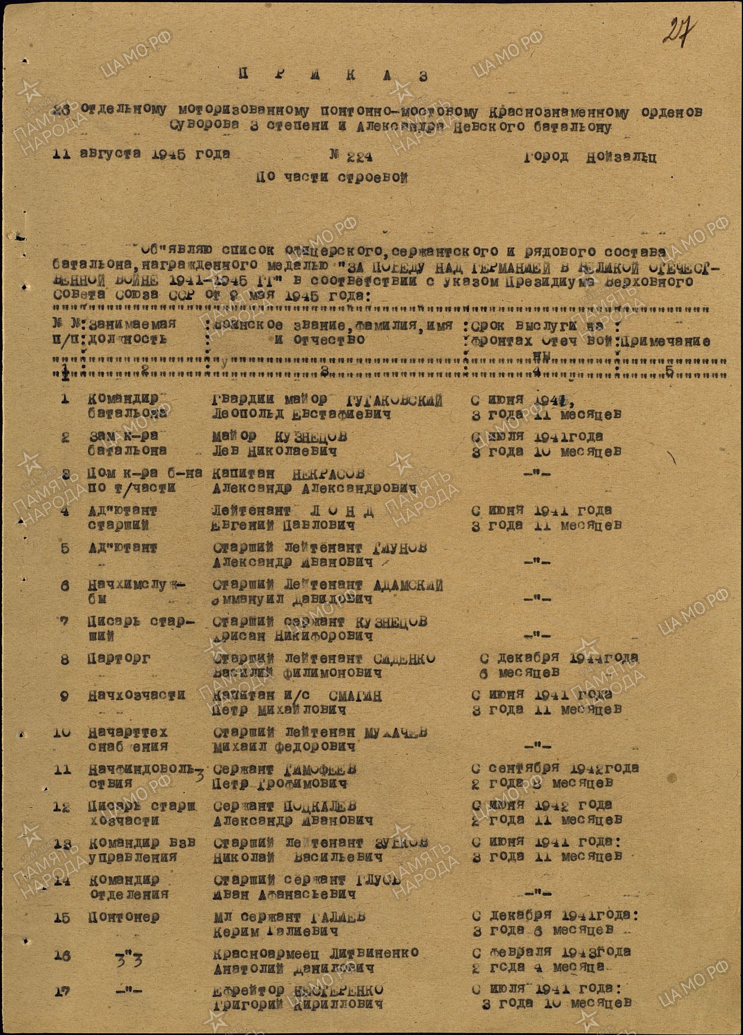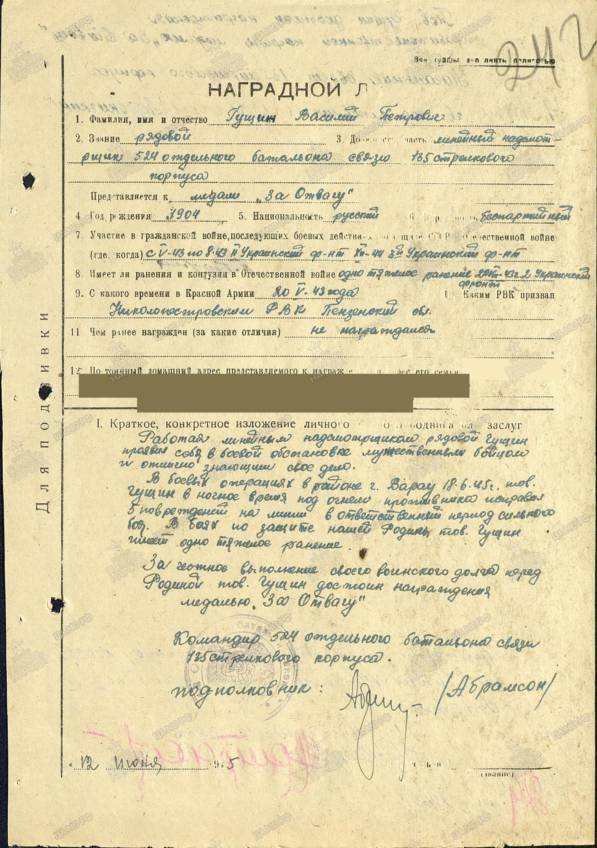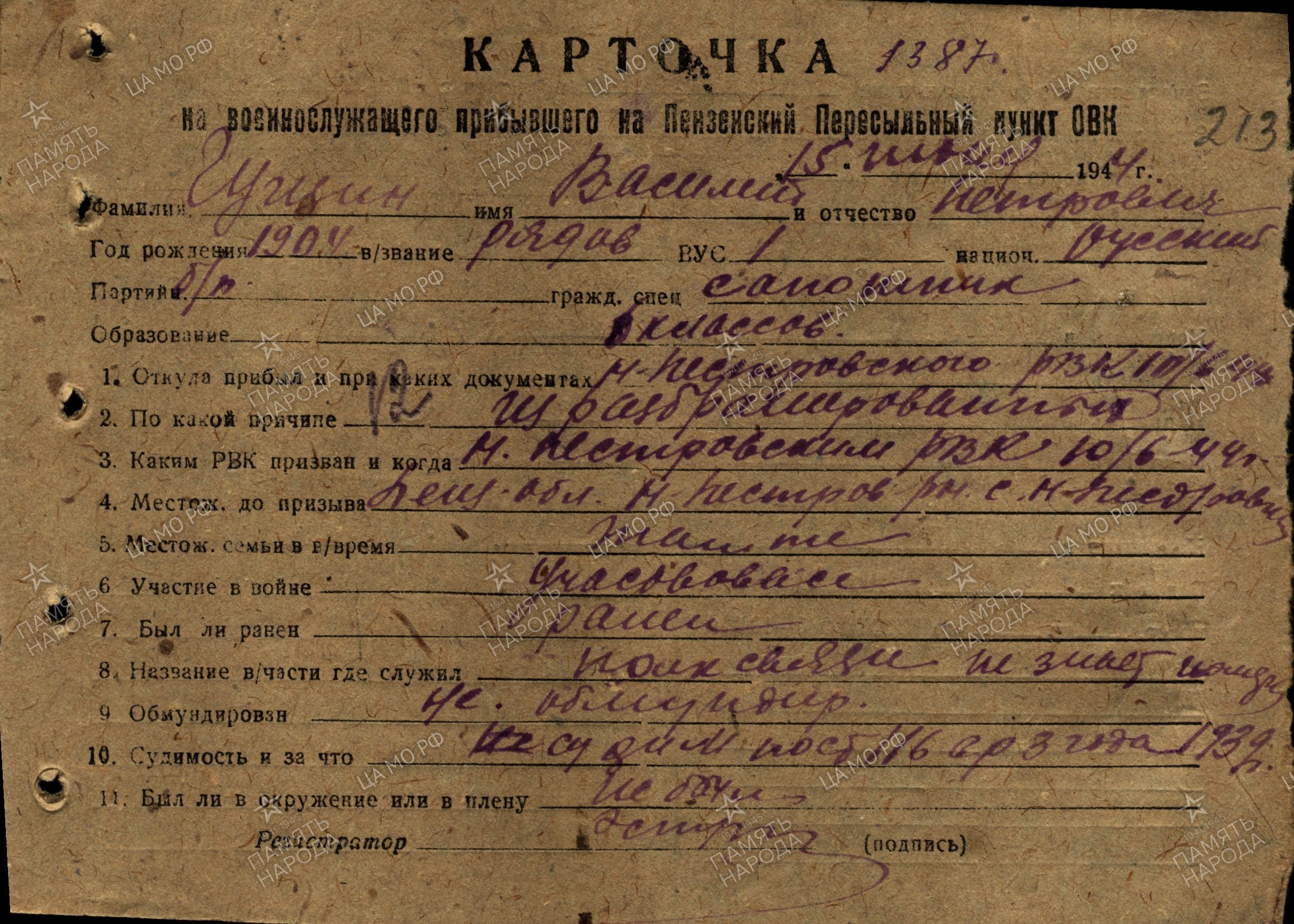 В РККА по архивным документам был призван в 1942 году. По имеющимся сведениям закончил войну в Германии. Имел ранение. Состоял в батальоне связи. По некоторым сведениям был участником похоронной команды. Получил за участие в ВОВ 2 медали: За отвагу и За победу над Германией в ВОВ. Медаль За отвагу получил в г. Ворау на территории современной Австрии 18.06.1945: "... в ночное время под огнем противника исправил 5 повреждений на линии в ответственный период сильного боя". Медалью За победу над Германий в ВОВ награжден 11.08.1945 в г. Нойзальц, недалеко от г. Дрезден. После войны вернулся к жене и двум детям в г. Киров где и скончался в 1957 году.