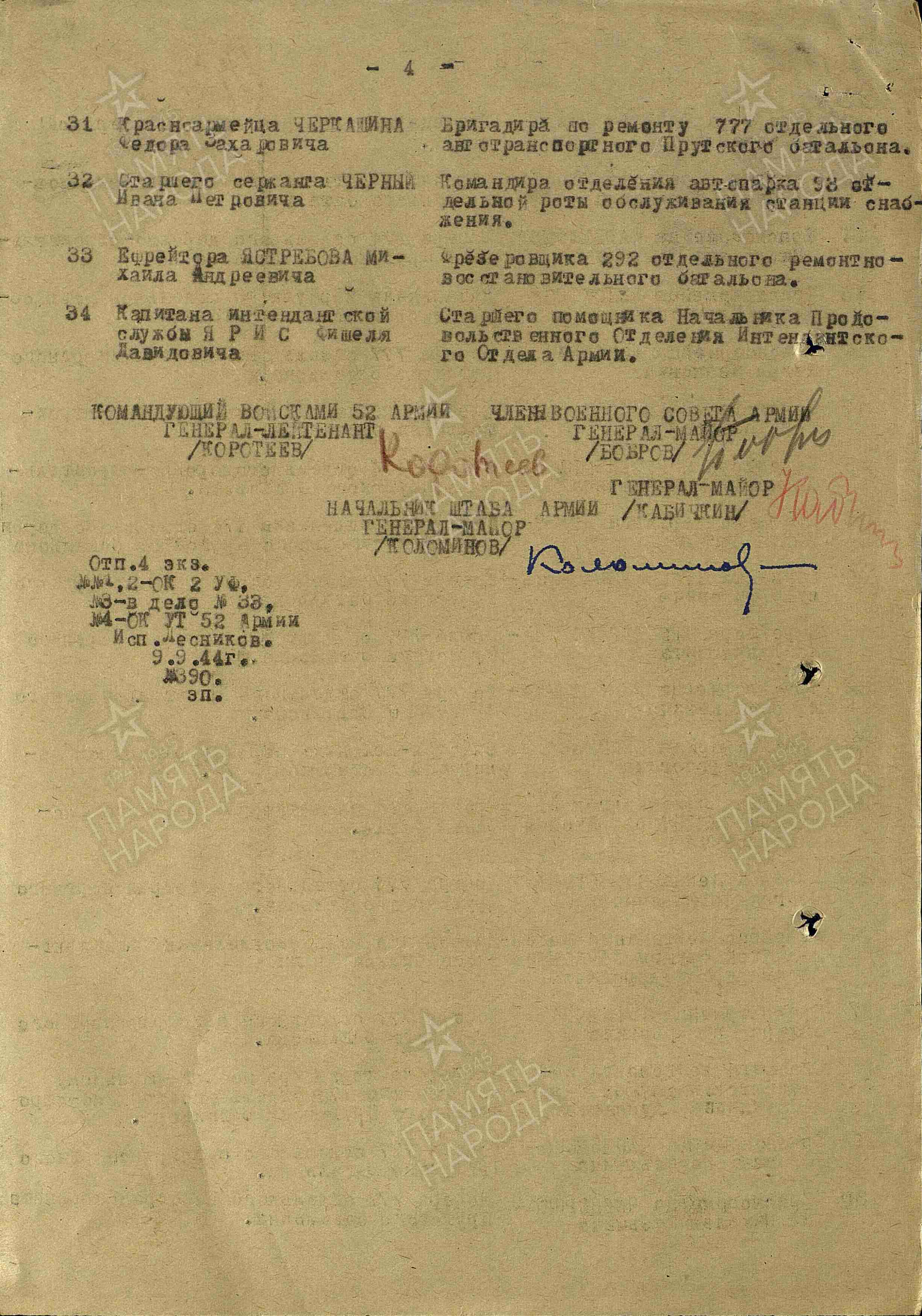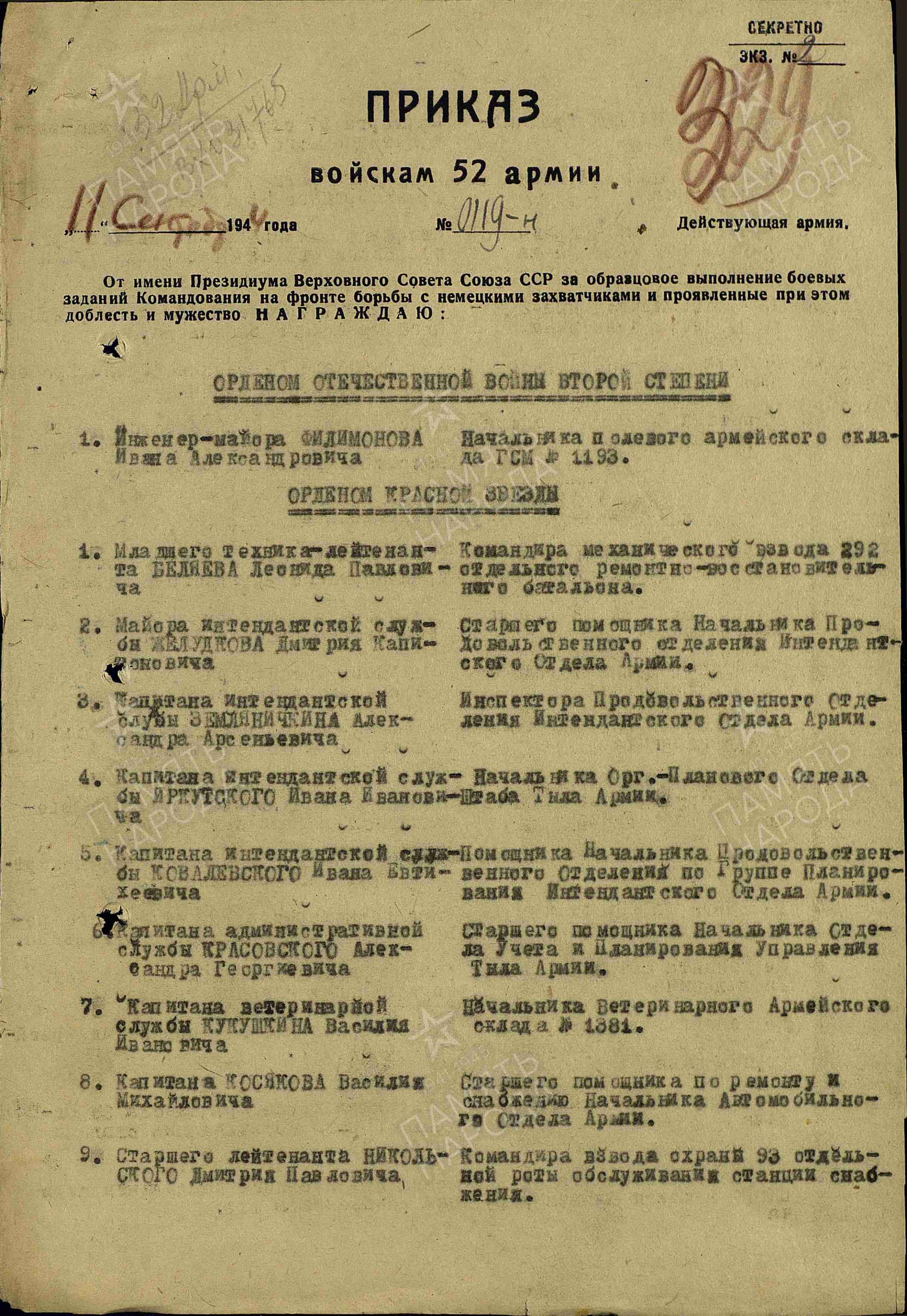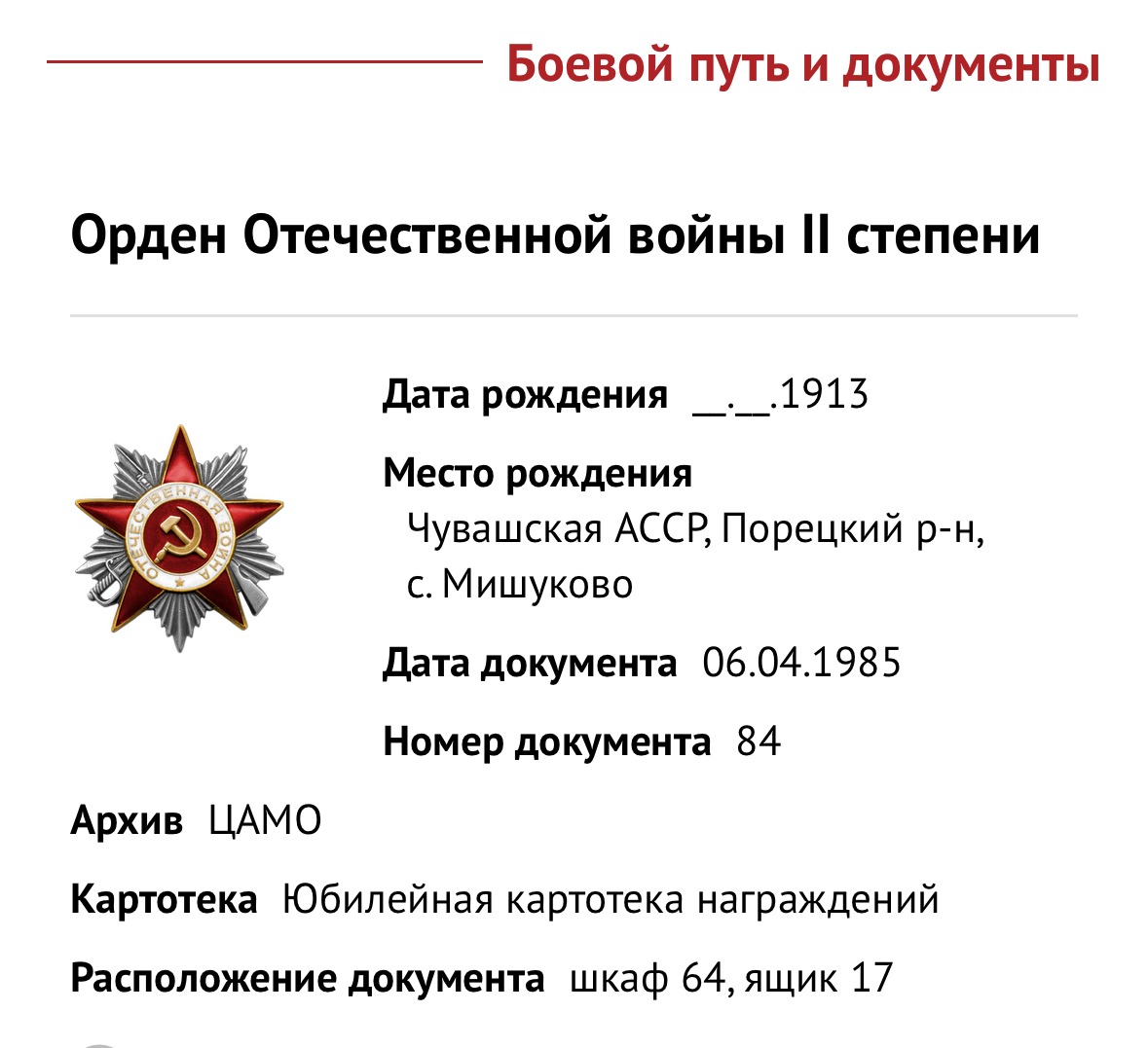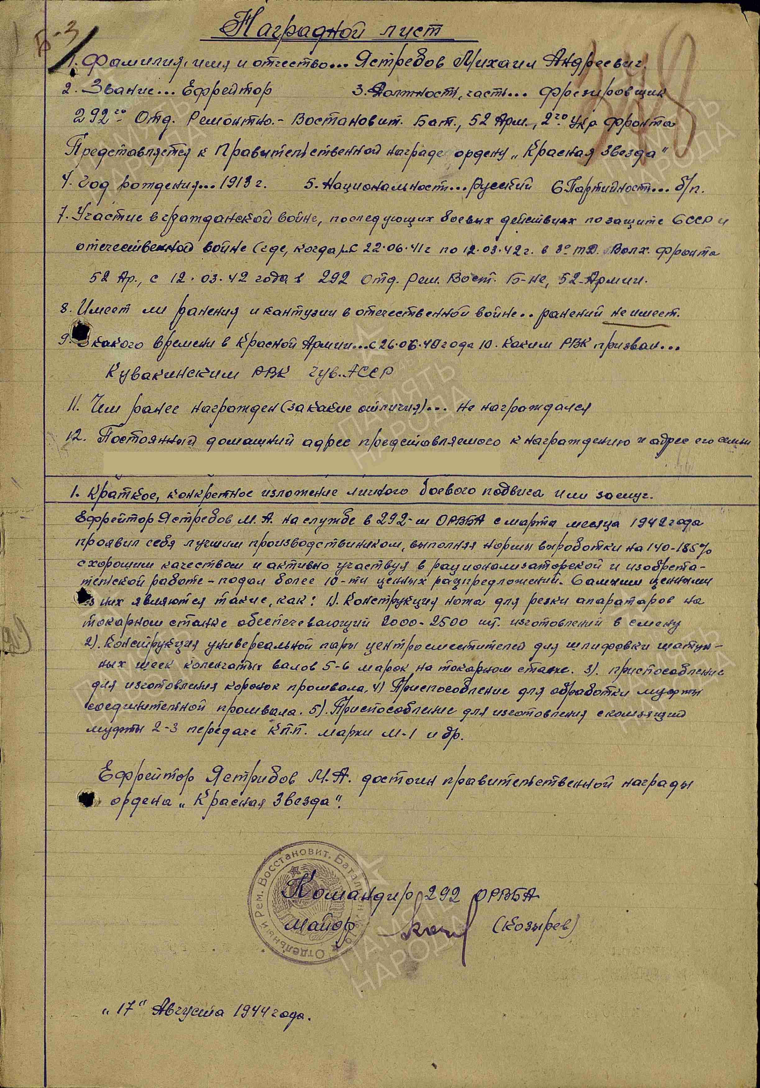 Медаль «За боевые заслуги» Орден Отечественной войны II степени Служба с 22.06.1941 по 13.03.1942 в 3й ТД (14.12.1941 года переформирована в 225-ю стрелковую дивизию) Волховского Фронта 52 Армии С 12.03.1942 в 292 отдельном ремонтно-восстановительном батальоне 52 Армии 2й Украинский Фронт