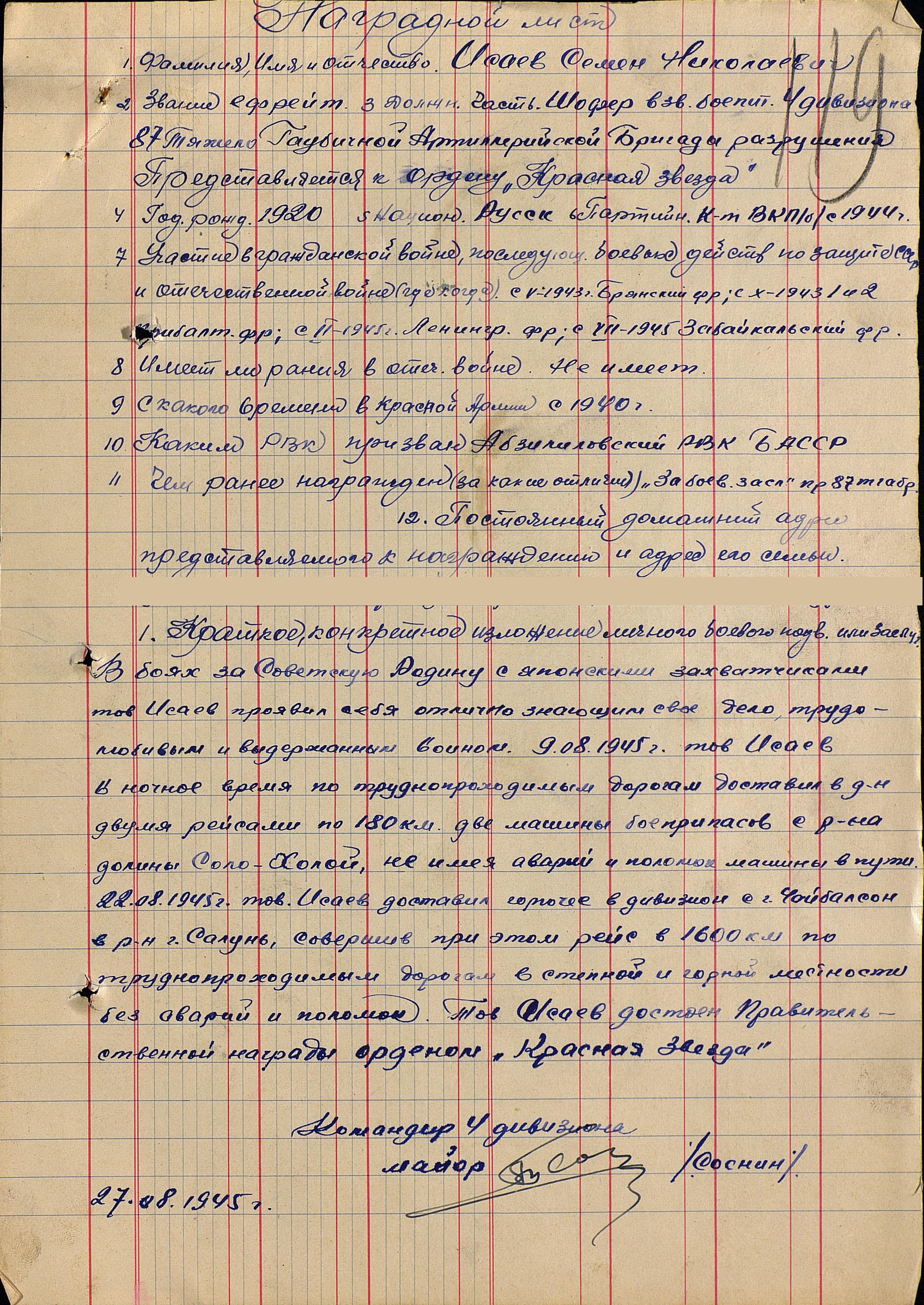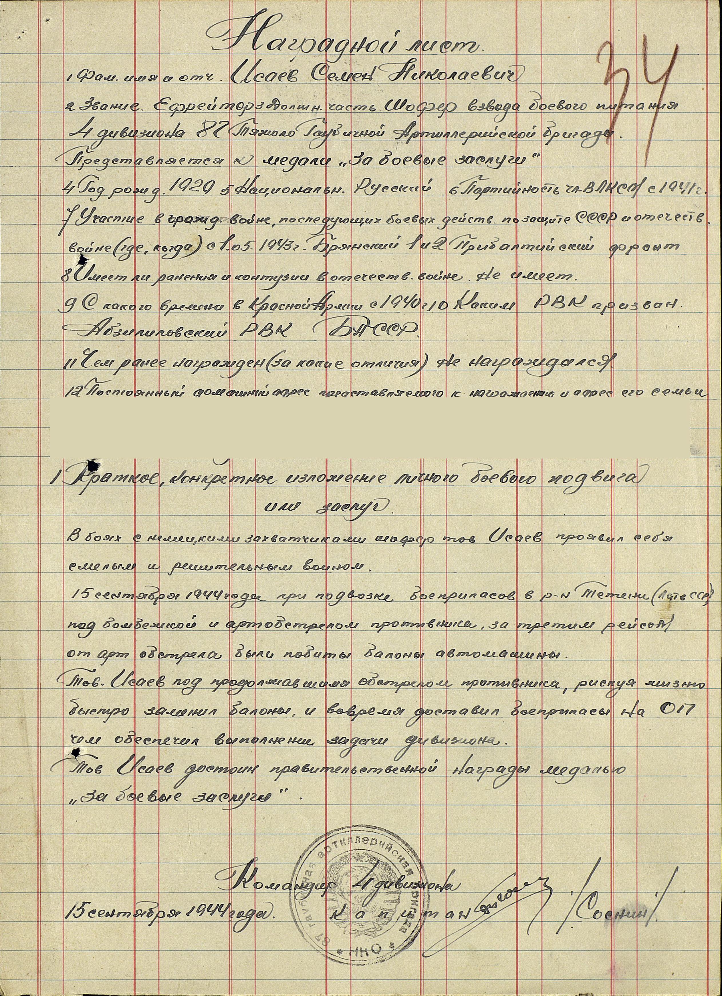 Исаев Семён Николаевич родился 15 ноября 1920 года. В 1940 году был призван в "Красную армию" на защиту родины. Место призыва: Абзелиловский РВК, Башкирская АССР, Абзелиловский р-н. Был награжден медалями: " За боевы заслуги" и "За отвагу" , представлялся к ордеру "Красная Звезда". В части Семён Николаевич занимал должность "Шофер взвода боевого питания".