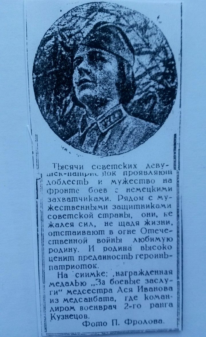 Моя бабушка Иванова Анастасия Гавриловна, родилась 27 декабря 1912 года в деревне Волково Великолукского района Псковской области (27.12.1912 - 31.05.1999).С первых дней войны оказывала помощь раненым бойцам в медсанбате 179-ой стрелковой дивизии, старший сержант медицинской службы. Награждена медалью "За боевые заслуги", орденом Отечественной войны II cтепени. В послевоенное время работала в городском Красном Кресте, а затем, вплоть до выхода на заслуженный отдых- массажистом в детском санатории "Великолукский", помогла десяткам детишек, которые перенесли полиомиелит. ПОМНИМ! ГОРДИМСЯ!