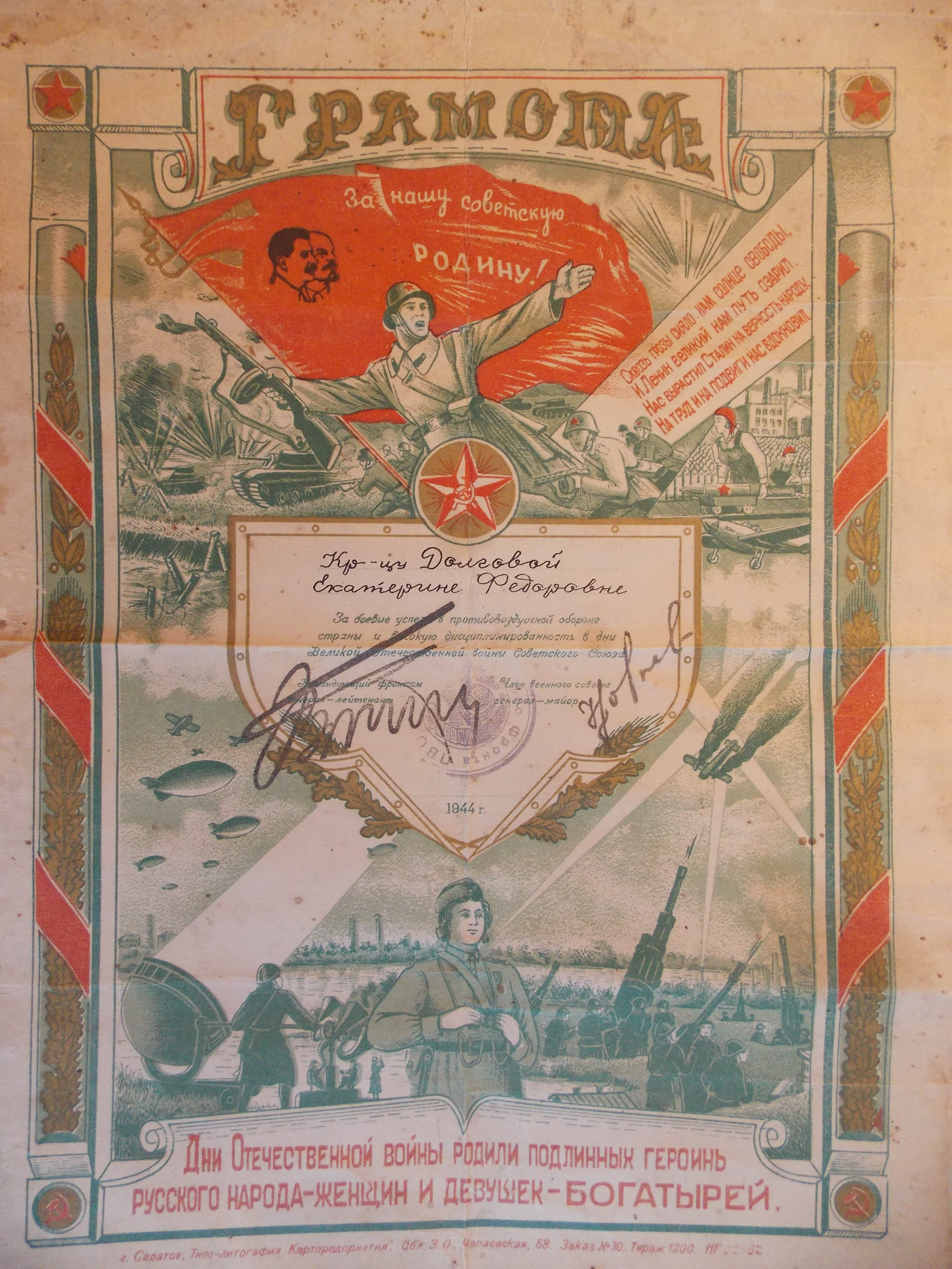 Иванова (Долгова) Екатерина Федоровна. В годы Великой Отечественной войны служила в войсках ПВО в звании ефрейтора. Награждена грамотой.