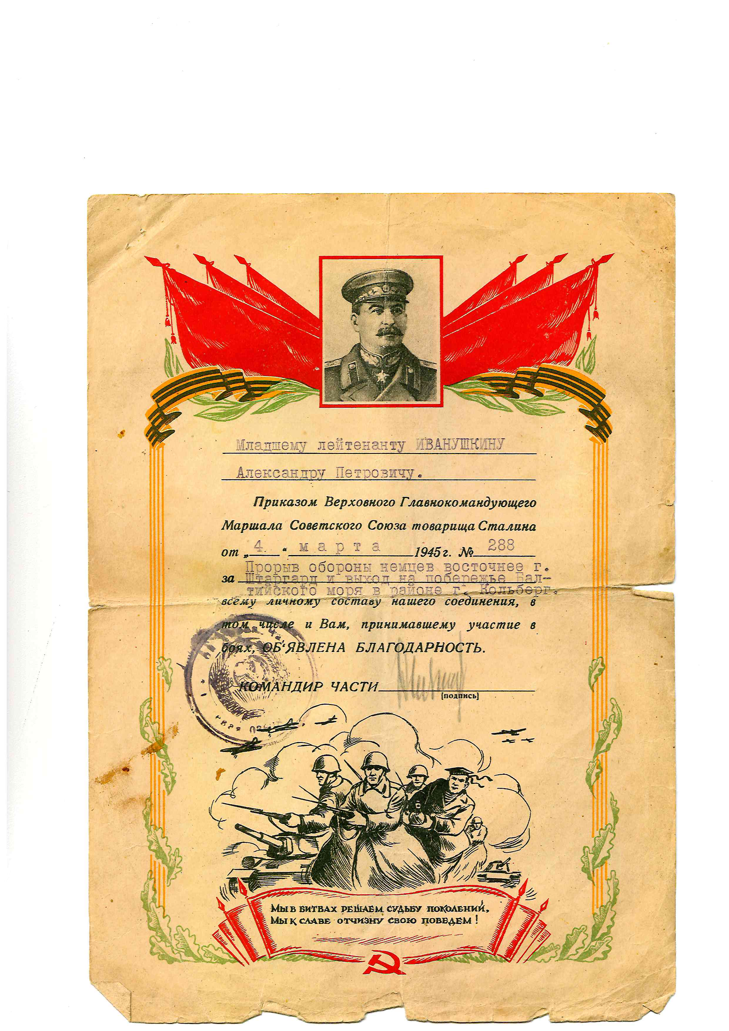 -в прорыве обороны немцев в восточном г.Штатгарде и выходе на побережье балтийского моря в районе г.Кольберг ( Благодрность от 04.03.1945 №288);