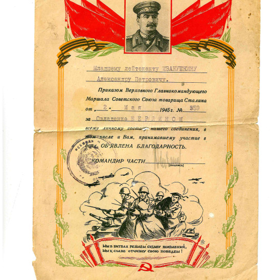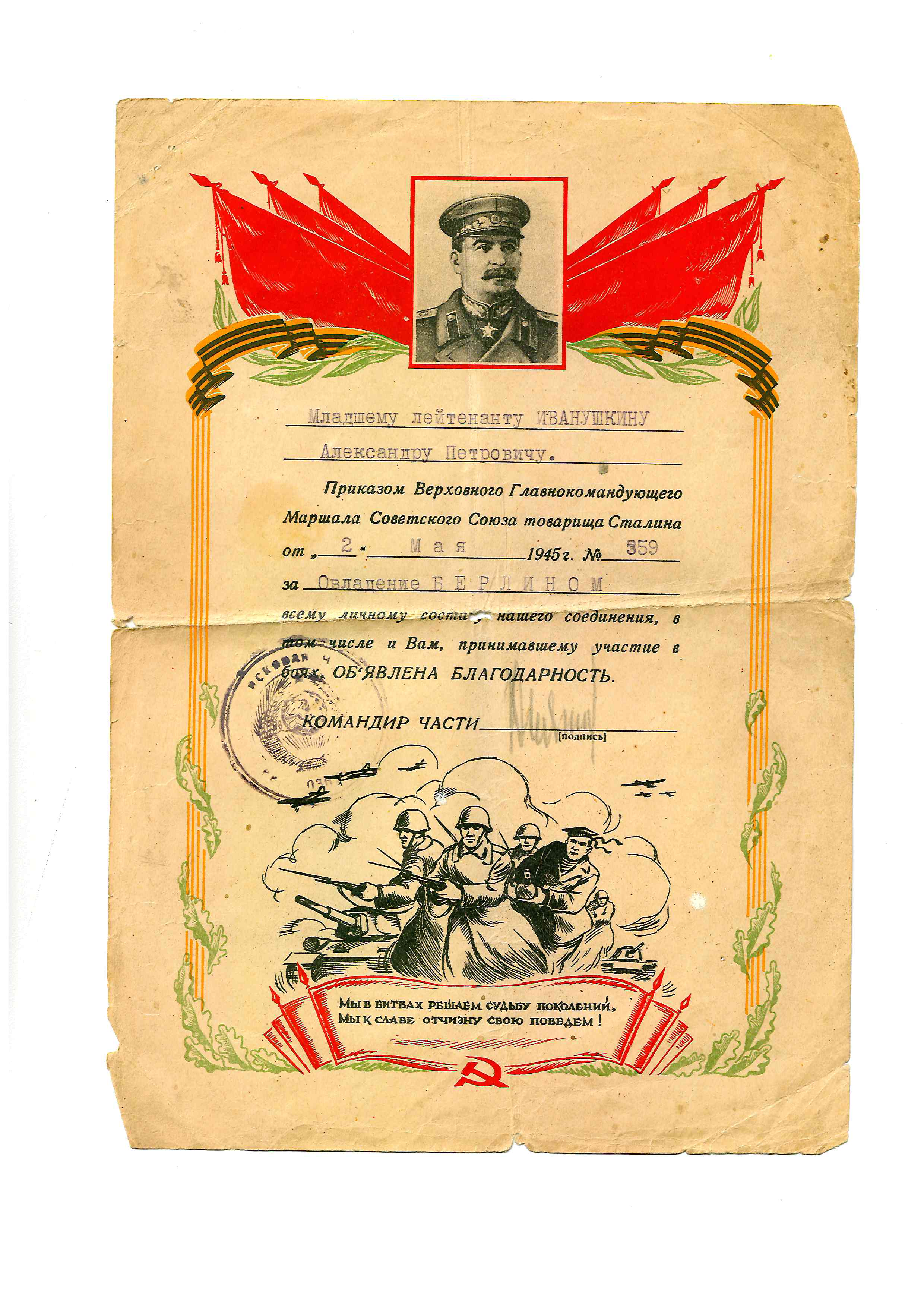 - овладение Берлином ( благодарность от 02.05.1945 г. № 359 ).
