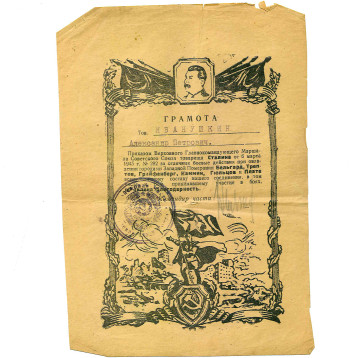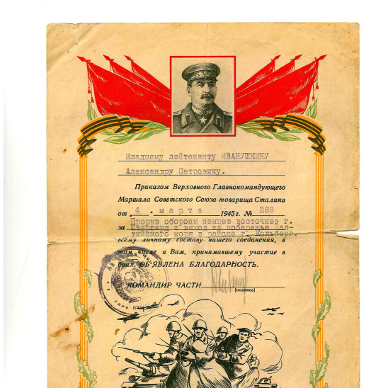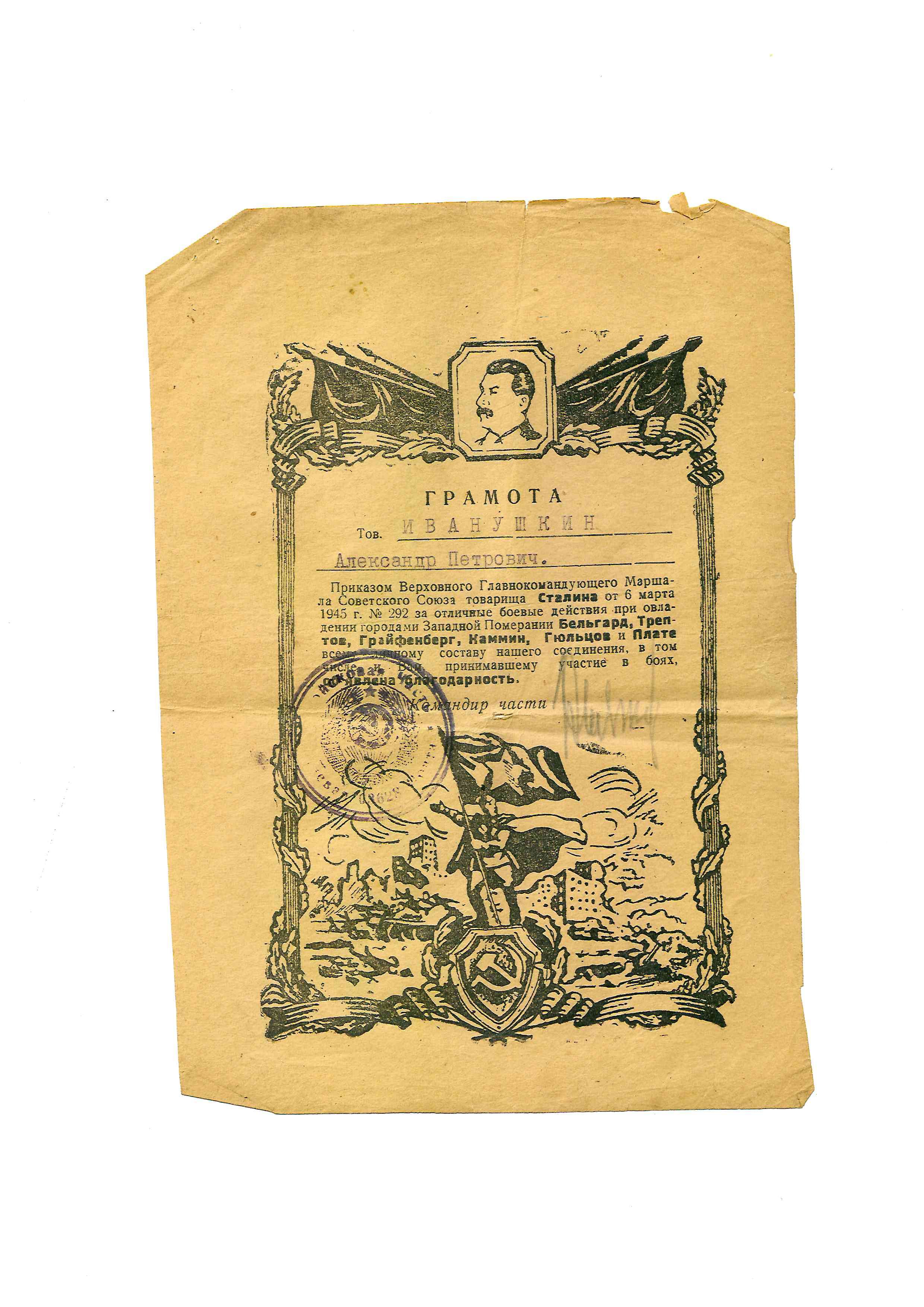 - овладении городами Западной Померании Бельград, Трептов, Грайфенберг, Каммин, Гюльцов и Плате ( Грамота от 06.03.1945г. №292);
