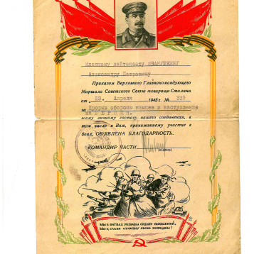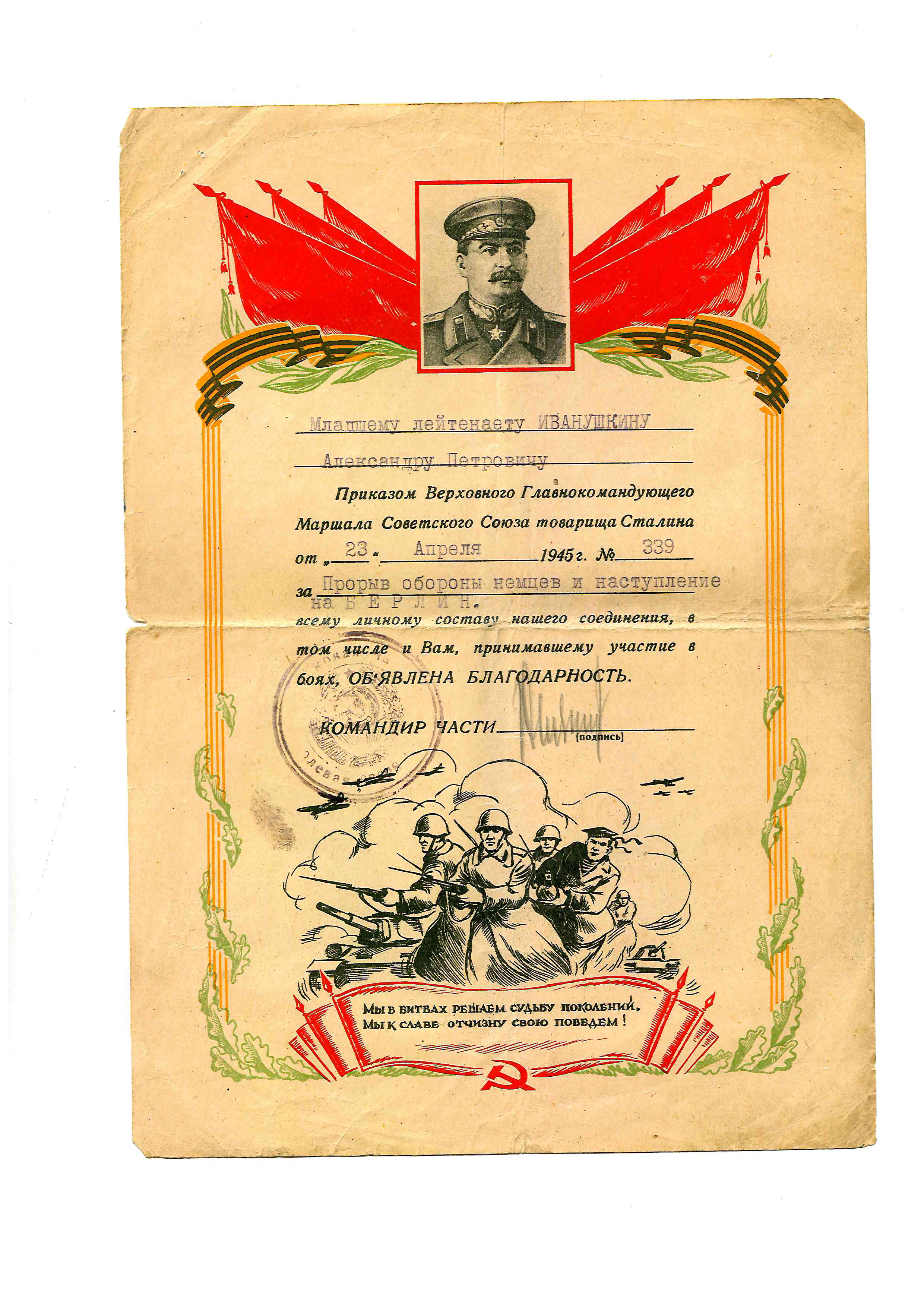 - прорыв обороны немцев и наступление на Берлин ( благодарность 23.04.1945г. №339 );