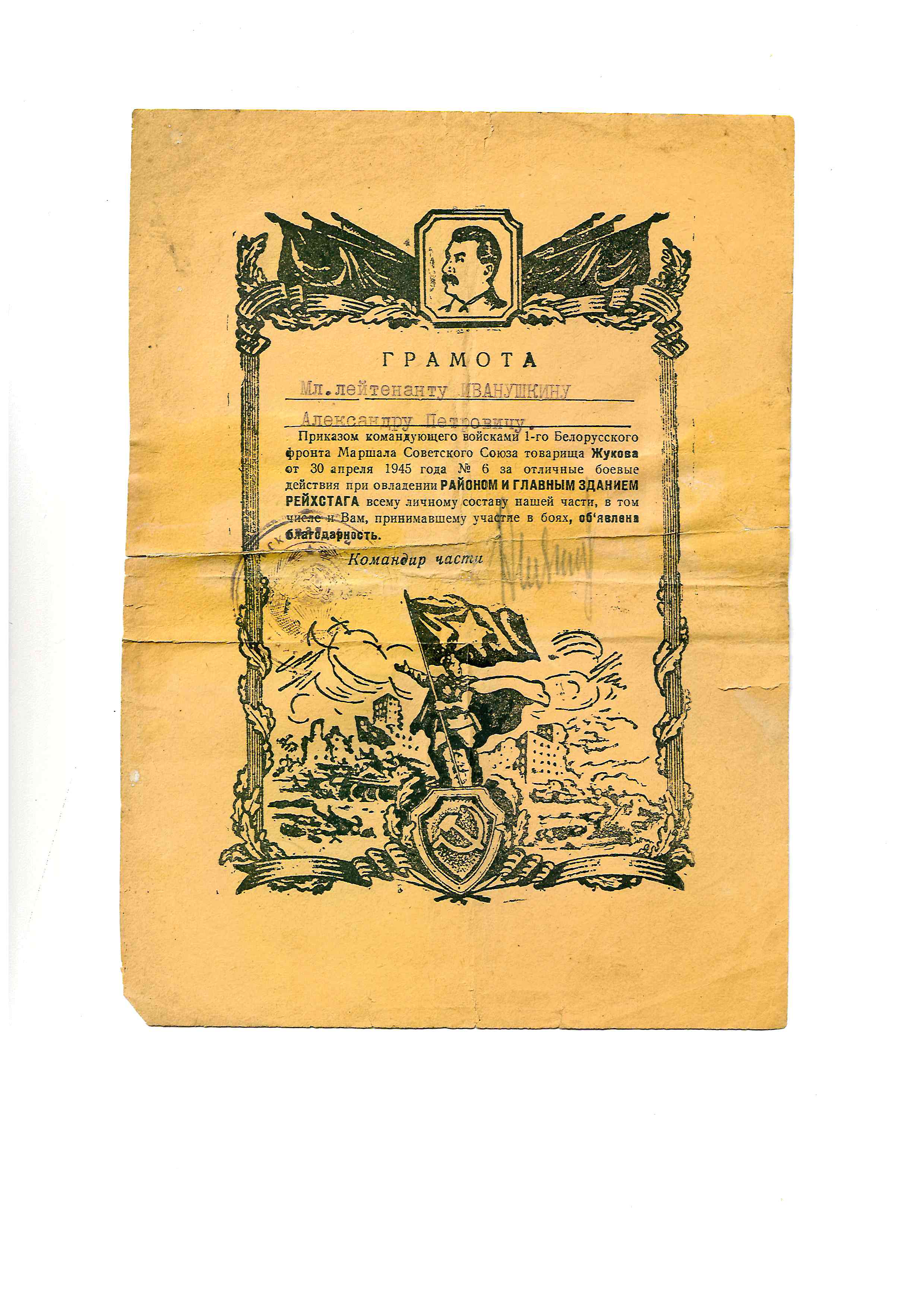 - овладение районным и главным зданием Рейхстага ( благодарность от 30.04.1945 г. №6 );