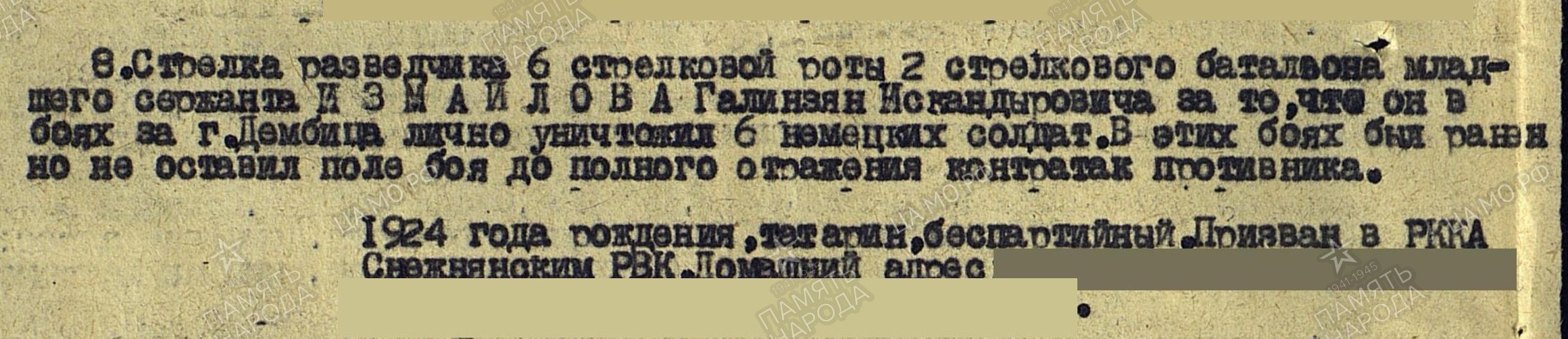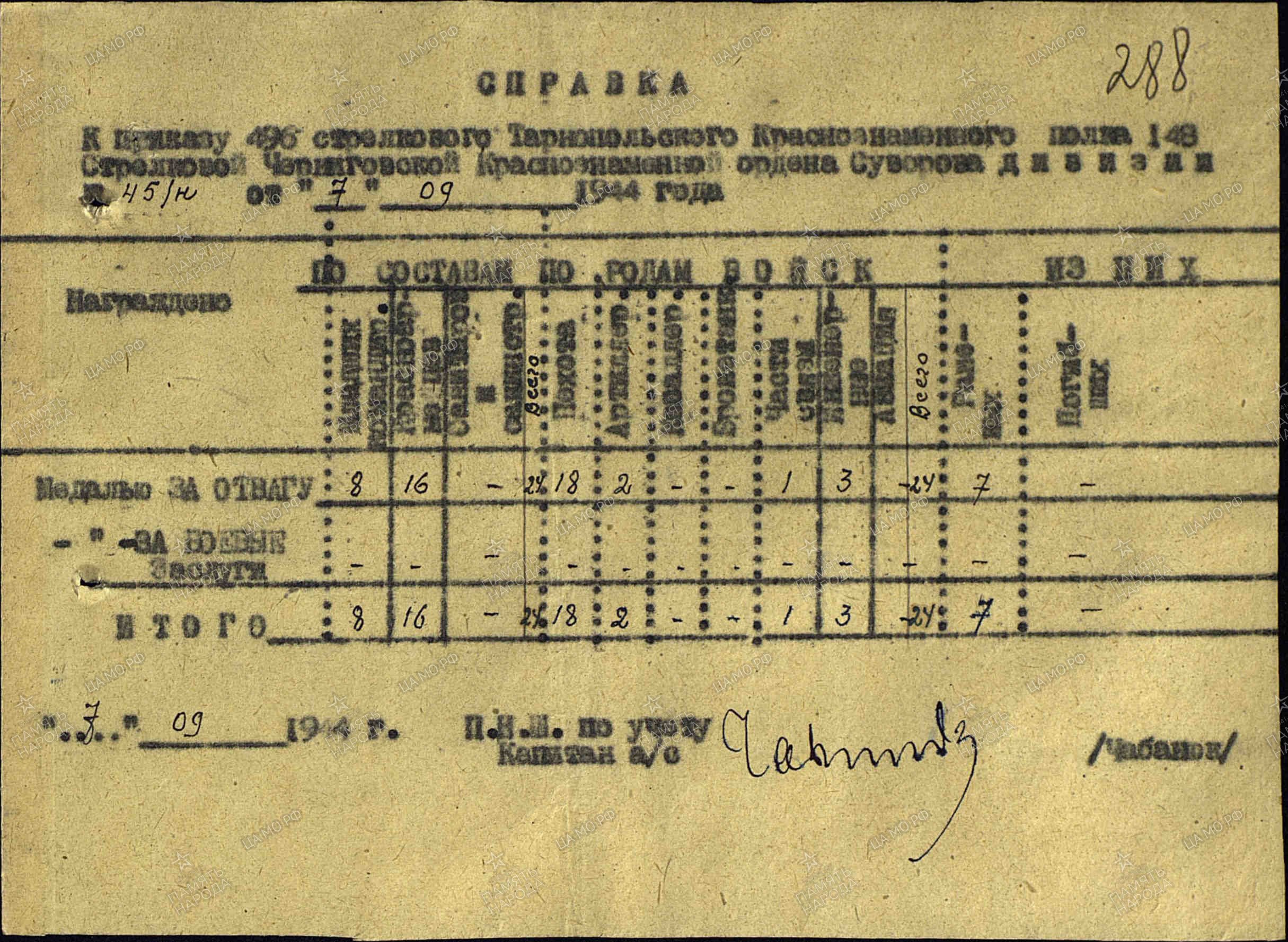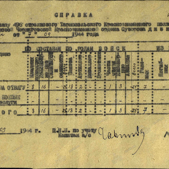 Боевой путь ветерана Приказ подразделения№: 45/н от: 07.09.1944Издан: 496 сп 148 сдАрхив: ЦАМОФонд: 33Опись: 690155Ед.хранения: 2380№ записи: 31631230., 496 сп 1 Украинского фронта*******************************************************************************Наименование награды Орден Отечественной войны II степени Архив ЦАМО Картотека Юбилейная картотека награждений Расположение документа шкаф 22, ящик 3 Номер документа 79 Дата документа 06.04.1985 Автор документа Министр обороны СССР