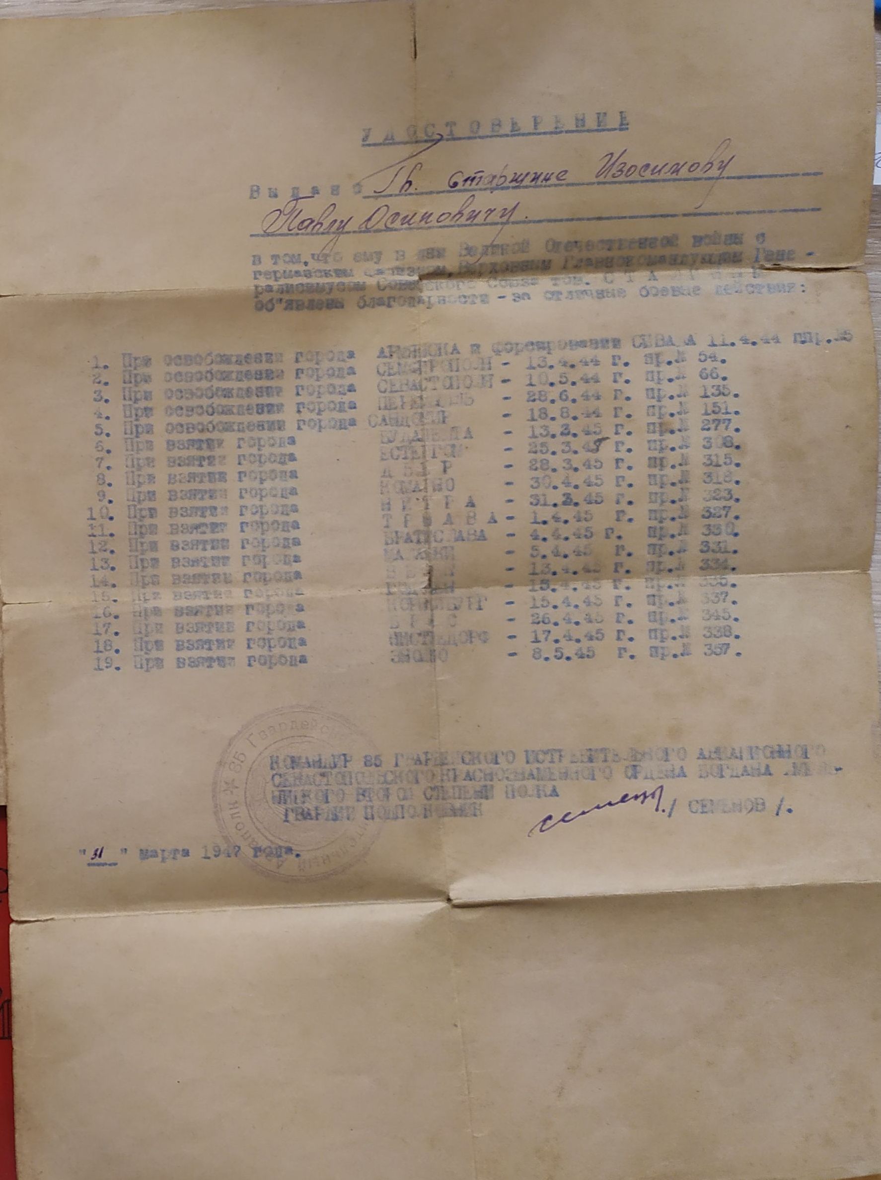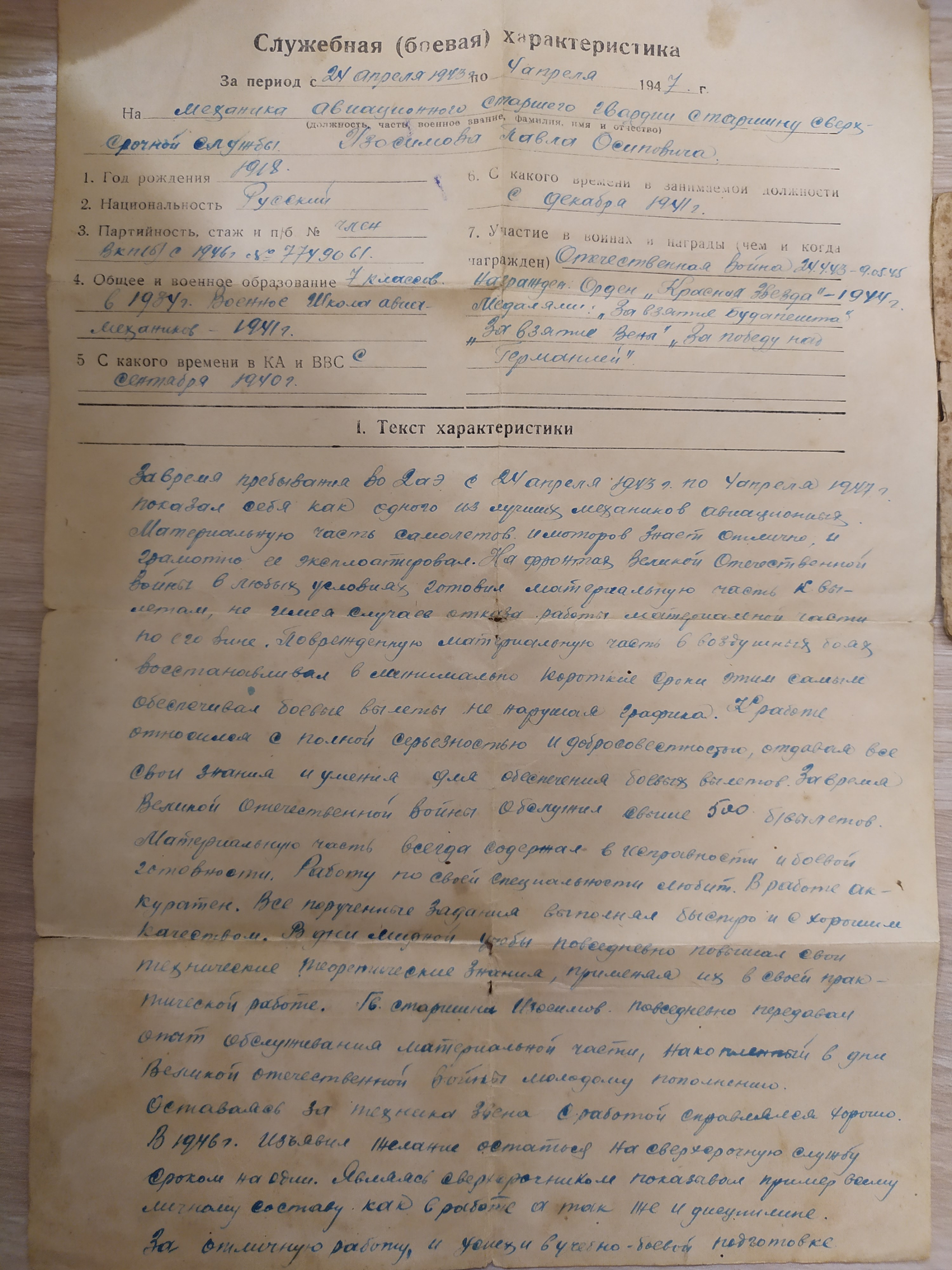 Изосимов Павел Осипович родился 13 февраля 1918 года в деревне Полищи в Окуловском районе Новгородской области. В 1940 году был призван на срочную службу, принял присягу в 219-ом дальнебомбардировочном авиаполку. В этом же году был направлен курсантом в Сталинградскую военную школу пилотов. В феврале 1941 года направлен в Вольскую военную школу пилотов. В ноябре 1941 года получил звание «старший сержант», проходил службу в должности механика. Работал на заводе № 292 старшим механиком. В апреле 1943 года направлен в 85-й гвардейский истребительский авиаполк, где проходил службу в должности механика по апрель 1947 года. Участвовал в боях в Великой Отечественной войне: на южных 1-4 Украинских фронтах в составе 85-го гвардейского истребительского авиаполка. Имеет благодарности за отличные боевые действия за освобождение и взятие различных городов: Севастополя, Будапешта, Братиславы, Вены и др. Боевые награды: орден «Красная Звезда» - 1944г.; медаль «За победу над Германией»; «За взятие Будапешта», «За взятие Вены» и др.