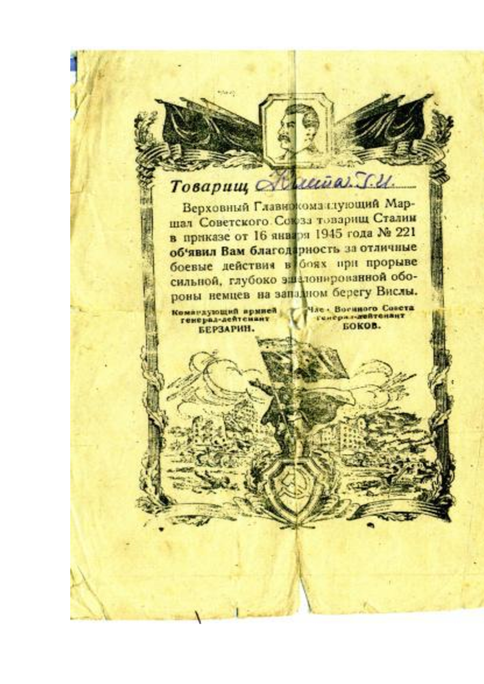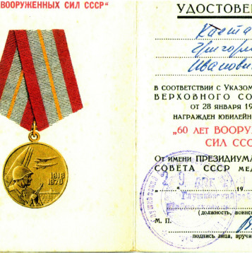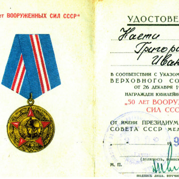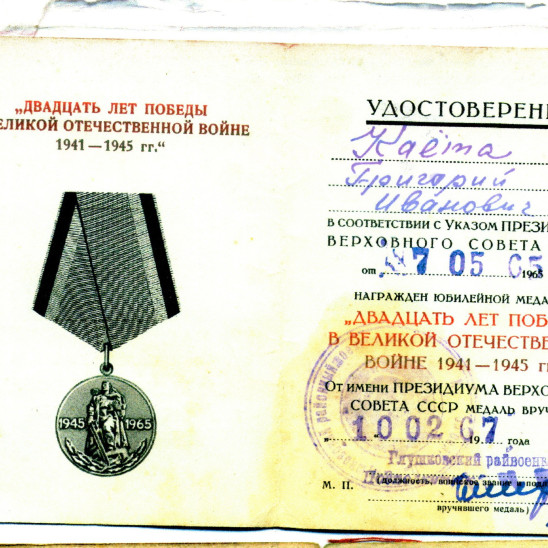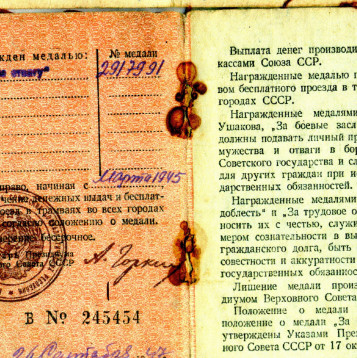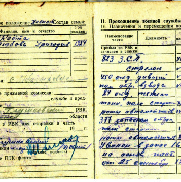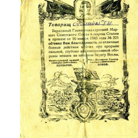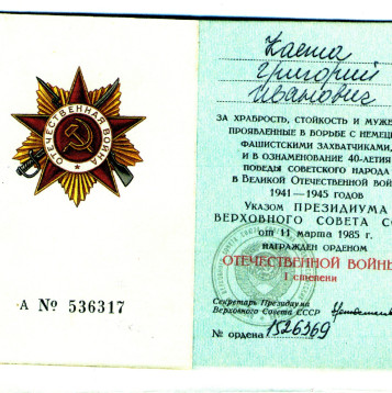 Боевой путь ветерана В составе РККА служил на Белорусском фронте с 1941 по 1945 гг. в звании Старшина роты автоматчиков. Стрелок. Занимался обеспечение роты продовольствием и боеприпасами. Со своей ротой победу встретил в городе Кенингсберг. За время войны был серьезно ранен в левую руку. Награды: Орден Отечественной войны I степени (№ записи 1521446383), Медали "За отвагу" (№ записи 45538466, 23969779, 1270217177), 20 лет победы в ВОВ 1941-1945г, 50 лет вооруженных Сил СССР, 60 лет вооруженных сил СССР, Медаль Жукова, За победу над Германией в ВОВ 1941-1945г..