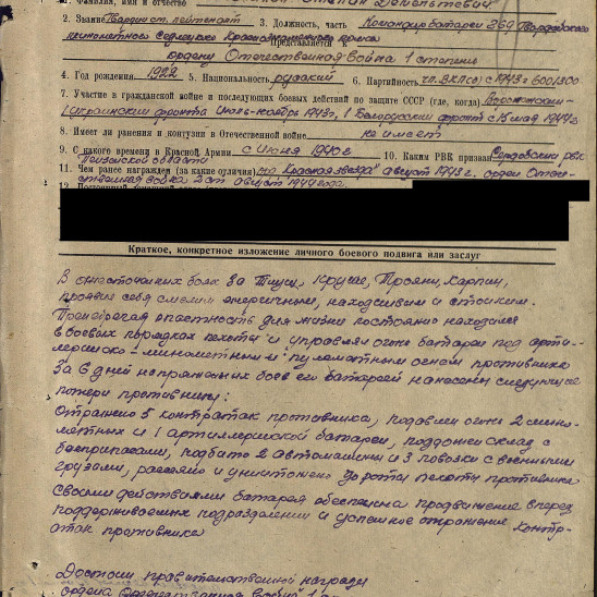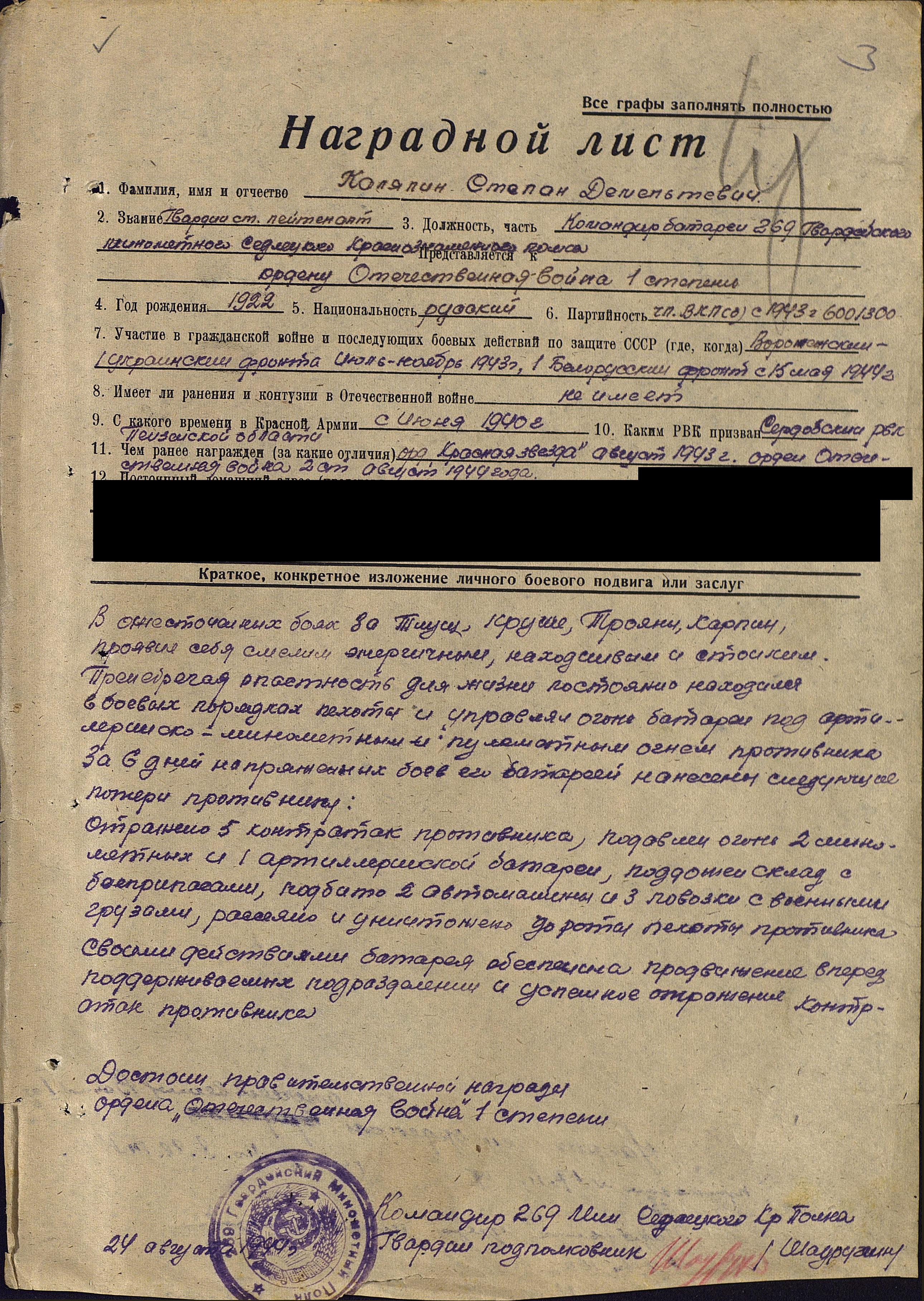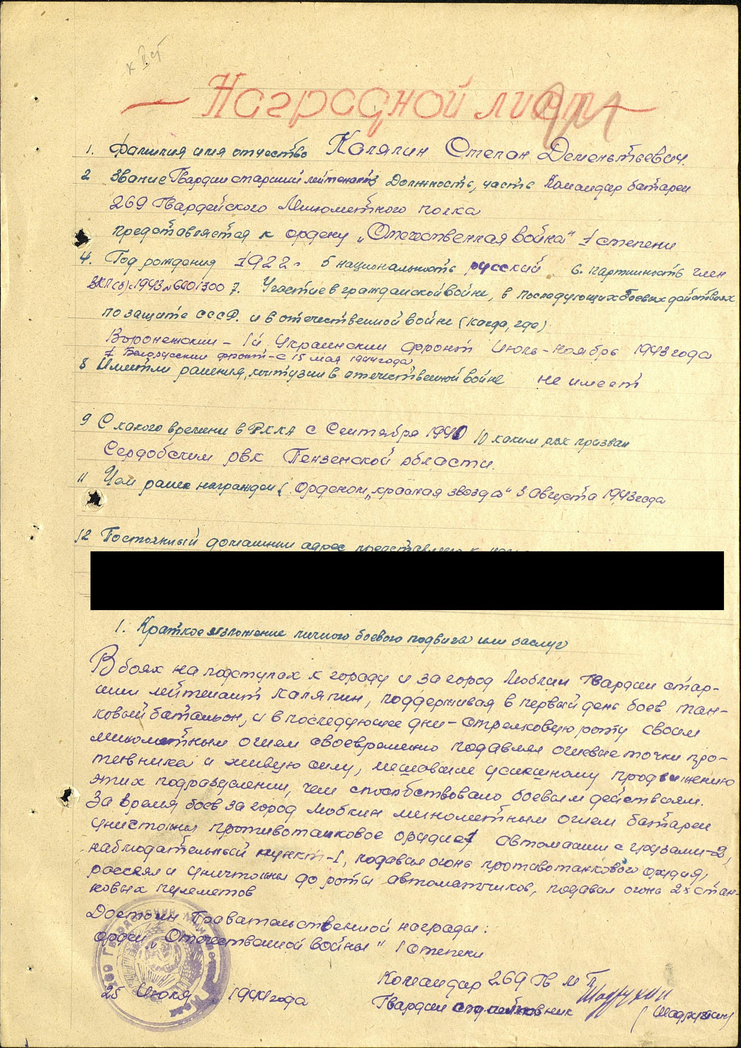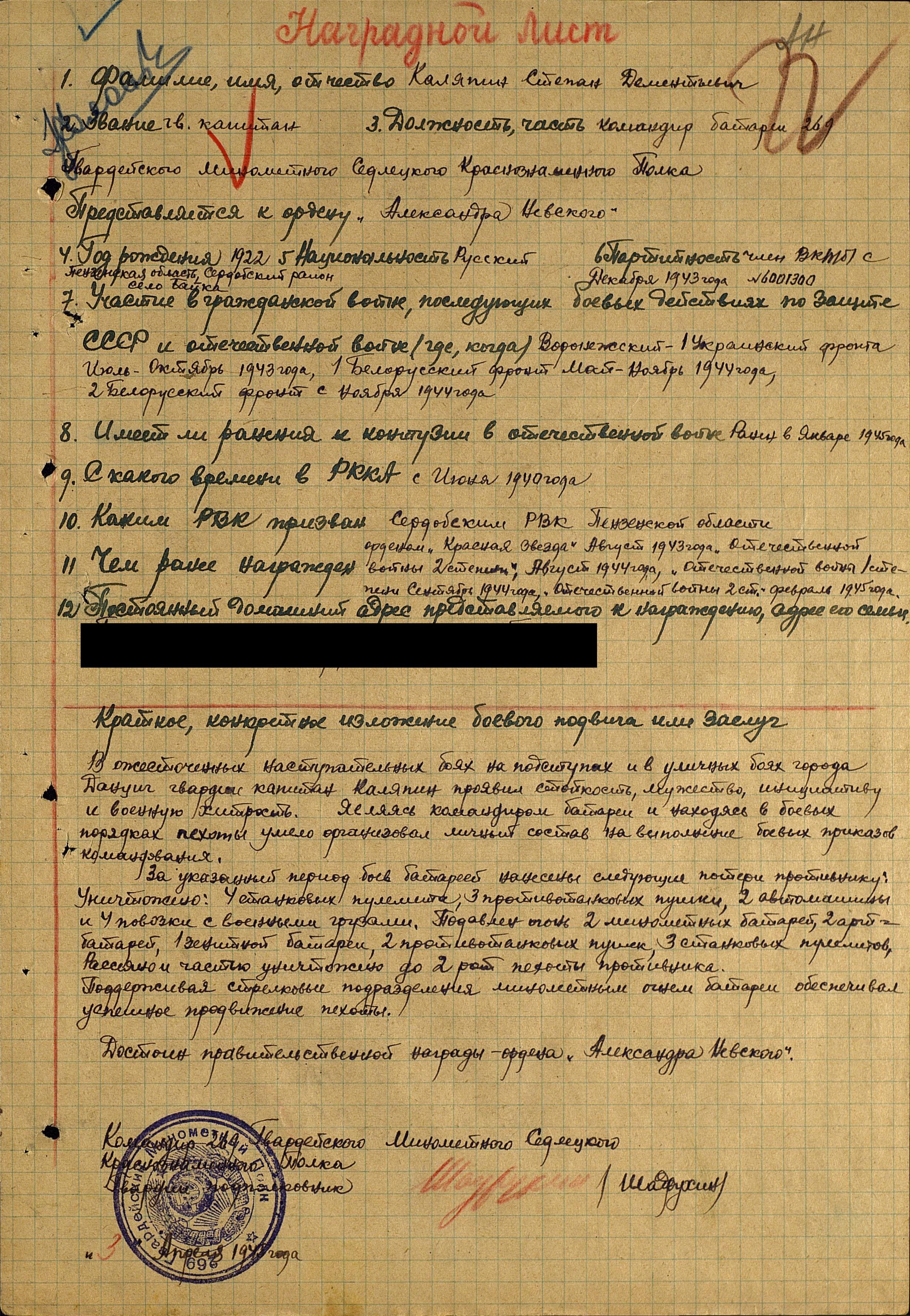 Награды: -Орден Александра Невского за бои в городе Данциг, апрель 1945г.-Орден Отечественной войны I степени за бои в городах Тиущ, Круше, Трояны, Харпин, сентябрь 1944г.-Орден Отечественной войны I степени, май 1985г.-Орден Отечественной войны II степени за бои в городе Люблин, август 1944г.-Орден Отечественной войны II степени за бои в Восточной Пруссии, февраль 1945г.-Орден Красной Звезды за бои на Курской битве под Прохоровкой, Сторожевое, Правороть, август 1943г.-Орден Красной Звезды за участие в Венгерских событиях, декабрь 1956г.-Медали "За боевые заслуги", "За Взятие Кенигсберга", "За победу над Германией" и 14 юбилейных медалей. Каляпин Степан Дементьевич после окончания I курса Сердобского зоотехникума добровольно вступил в Советскую Армию и в мае 1940г. поступил в Ташкентское военное училище им. В.И. Ленина. По окончании училища в августе 1941г. присвоено звание лейтенат командир взвода 1277 СП 389 СД где до лета 1943г. обучал курсантов Ташкентского училища. В марте 1943г. назначен командиром батареи 269 Минометного полка 8-го танкового корпуса. С 08.07.1943г. в составе 2-го танкового корпуса участвовал в боях на Курской битве.Всю Великую Отечественную войну прошел командиром 2-й батареи 269 гвардейского Минометного, Седлецкого, Краснознаменного орденов Кутузова и Александра Невского полка 8-го Краснознаменного танкового корпуса. В составе фронтов Воронежский, 1-й Украинский, 1-й и 2-й Белорусский участвовал в боевых действиях по освобождению Украины, Белоруссии, Польши (Люблин, Варшава), воевал в Восточной Пруссии. Был ранен в январе 1945г. В день Победы 9 мая 1945г. находился в г.Пренцлау, 70 км от Берлина в звании капитана, в возрасте 22,5 года. В 1947, 1948 годах служил в г.Саратове командиром батареи 151 батальона 10 отдельной стрелковой бригады. После присвоения звания майор был направлен на службу в Австрию (1950г.-1955г.) начальником полковой школы 654 минометного полка 13 мех. дивизии, где в 1954г. присвоено звание подполковник. В 1956г., 1957г. начальник дивизиона 1233 артиллерийского полка 13 мех.дивизии в Венгрии. с 1958го по 1968г. служил в Эстонии (г.Тала, г.Валга) на должностях начальник полковой службы, командир дивизиона РВСН, начальник штаба полка РВСН (в/ч23508). В 1968г. уволен в запас. С 1968г. по 1986г. работал в Саратовском Областном военкомате. В 1978г. присвоено звание полковника.