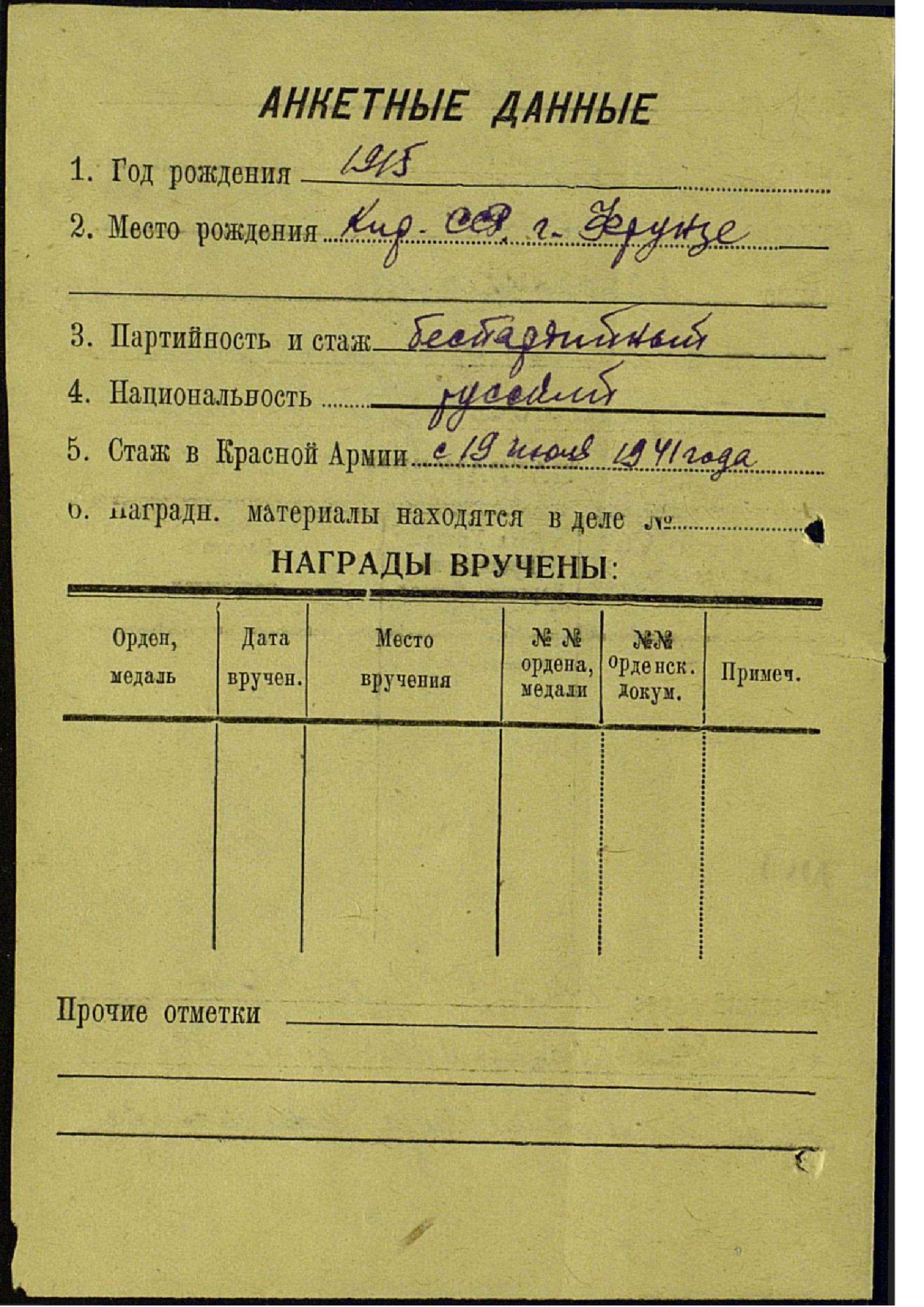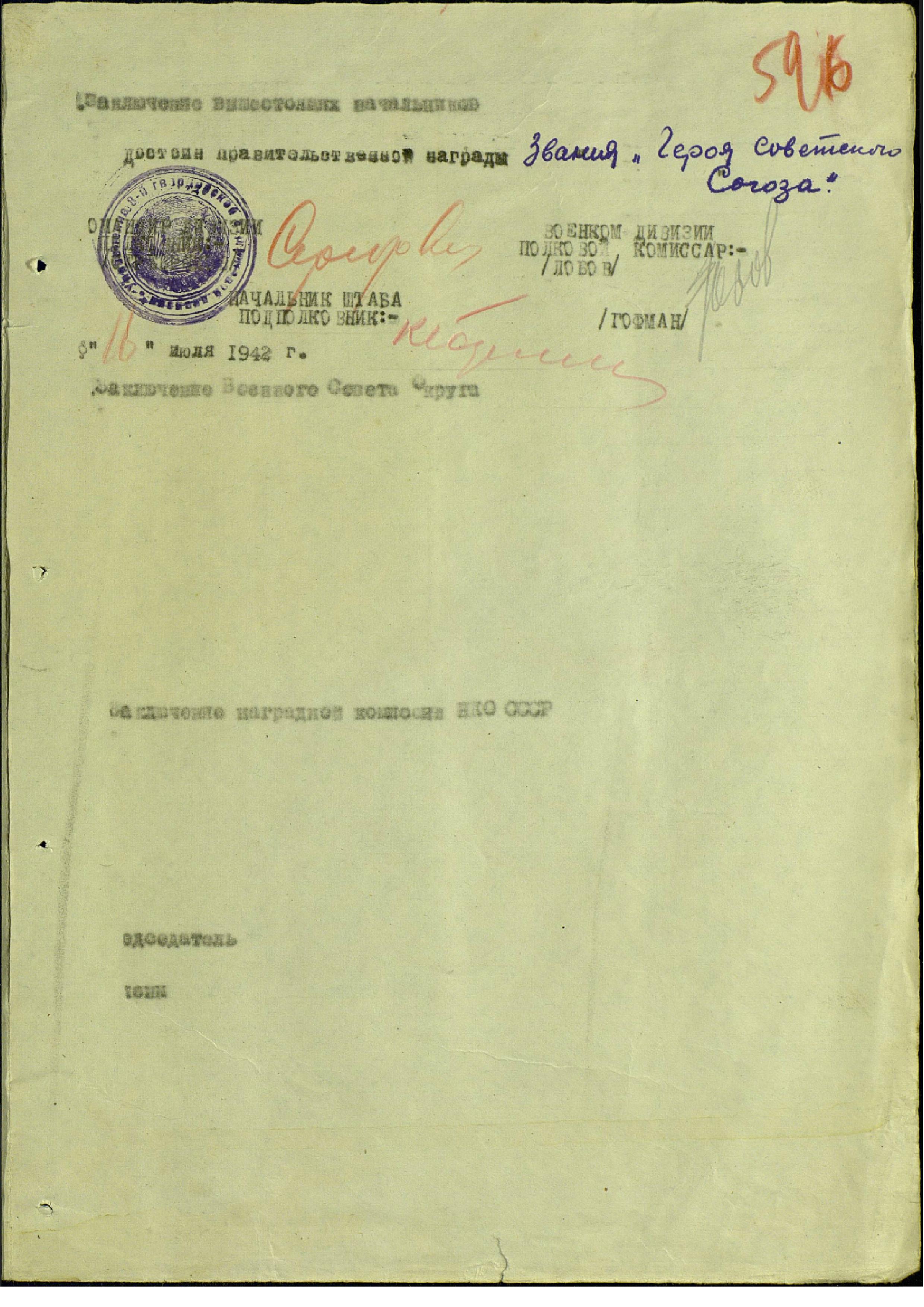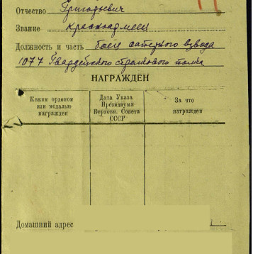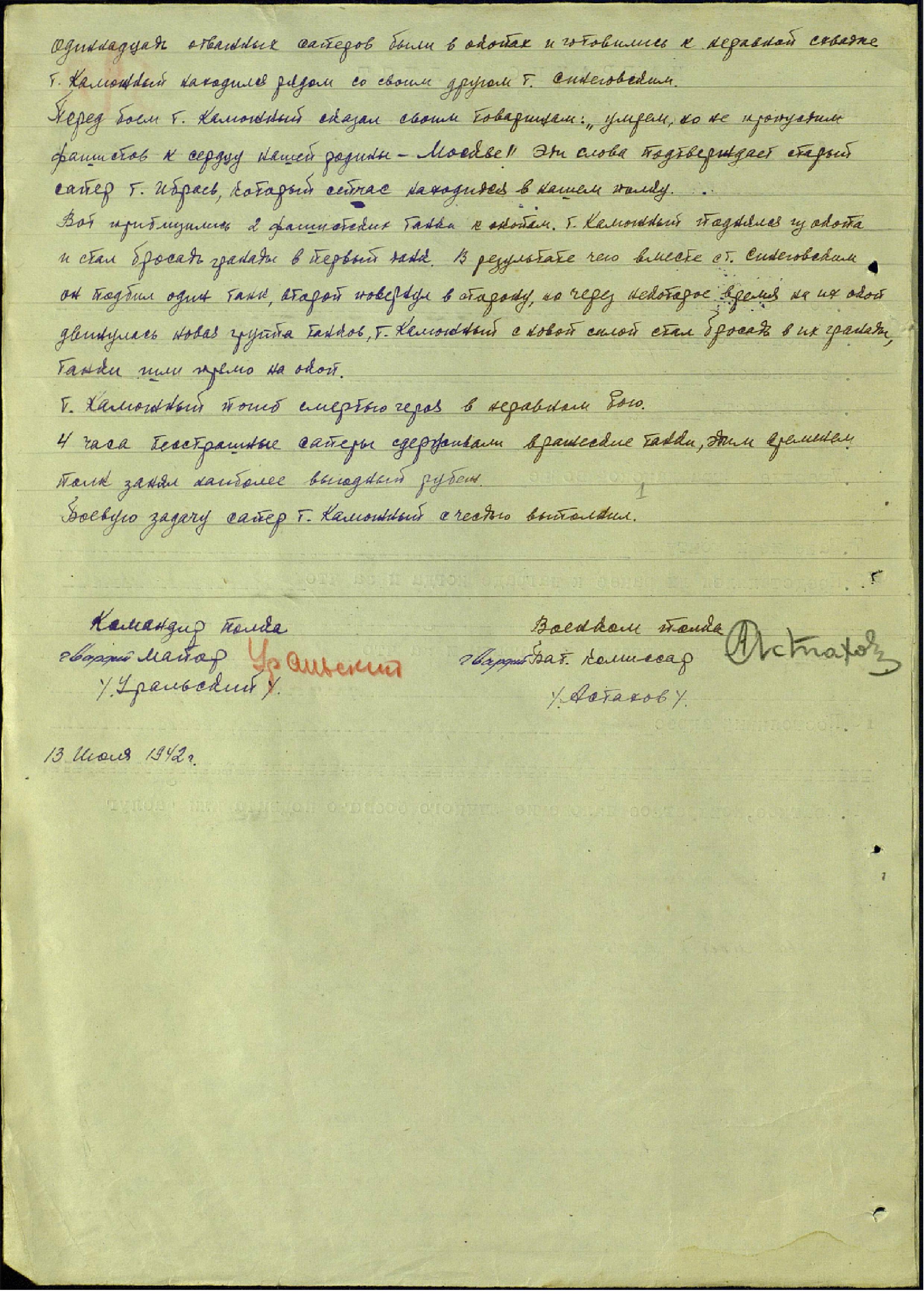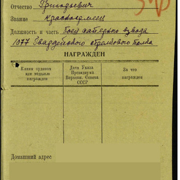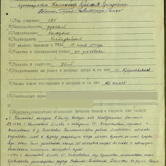01.11.1941 г. вместе с красноармейцем Синеговским под пулеметно-минометным огнем заминировал дорогу СОФЬИНО-ПОПОВКА, на минах подорвалась бронемашина противника.