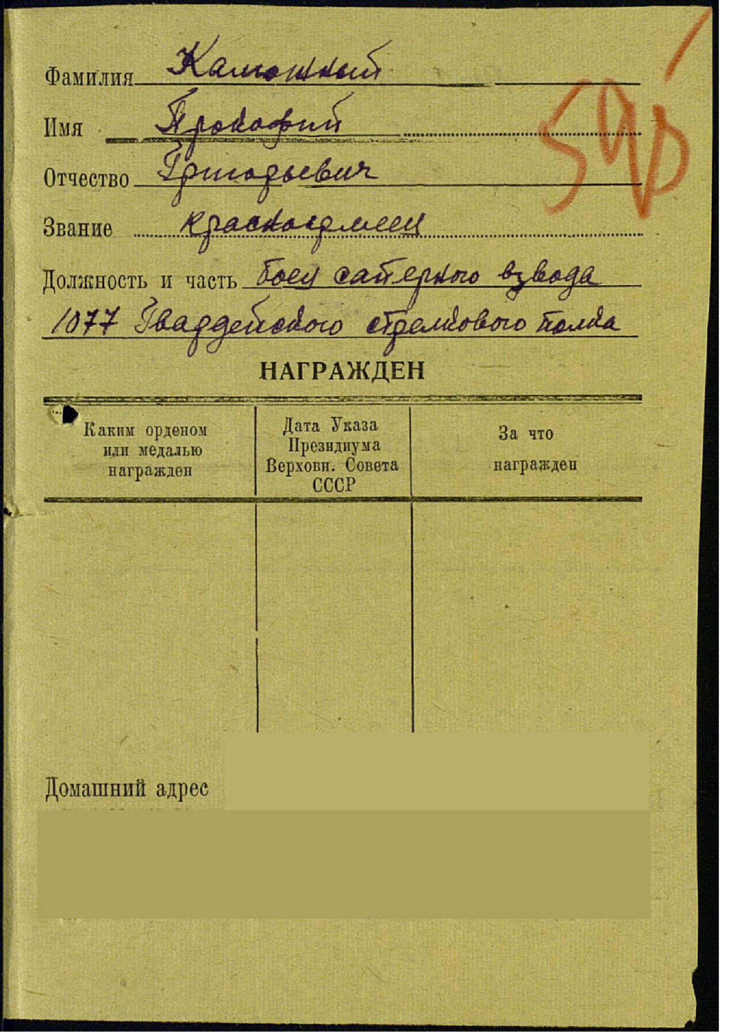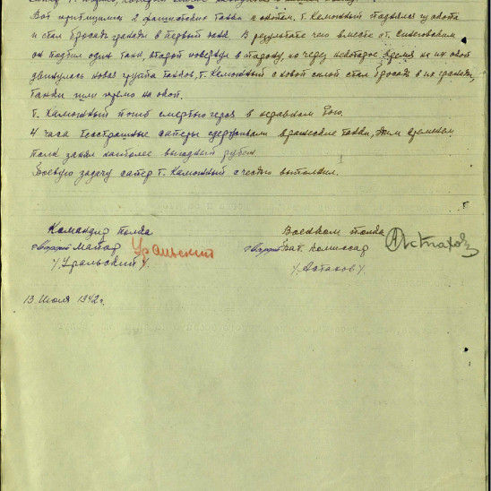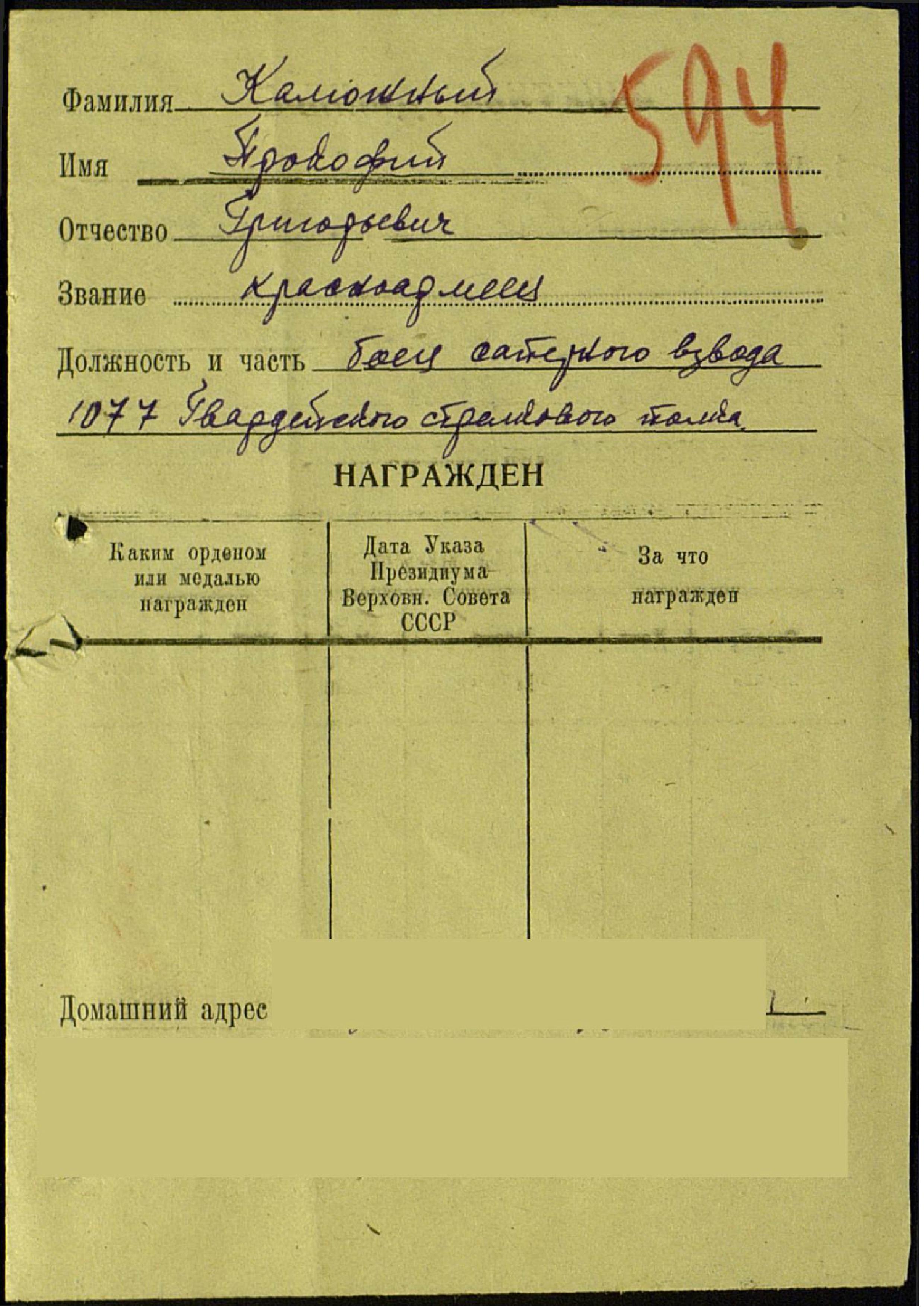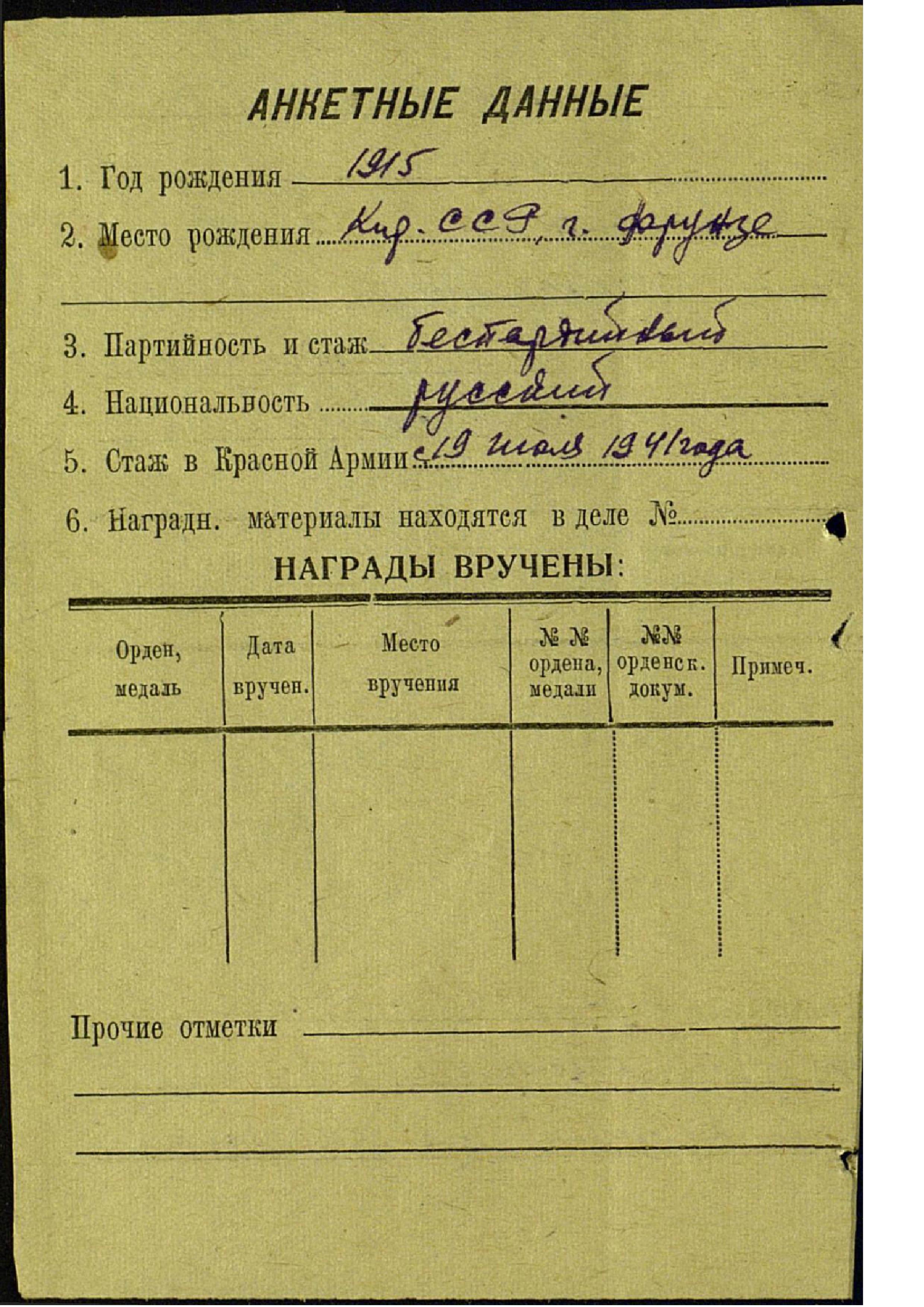 01.11.1941 г. вместе с красноармейцем Синеговским под пулеметно-минометным огнем заминировал дорогу СОФЬИНО-ПОПОВКА, на минах подорвалась бронемашина противника.