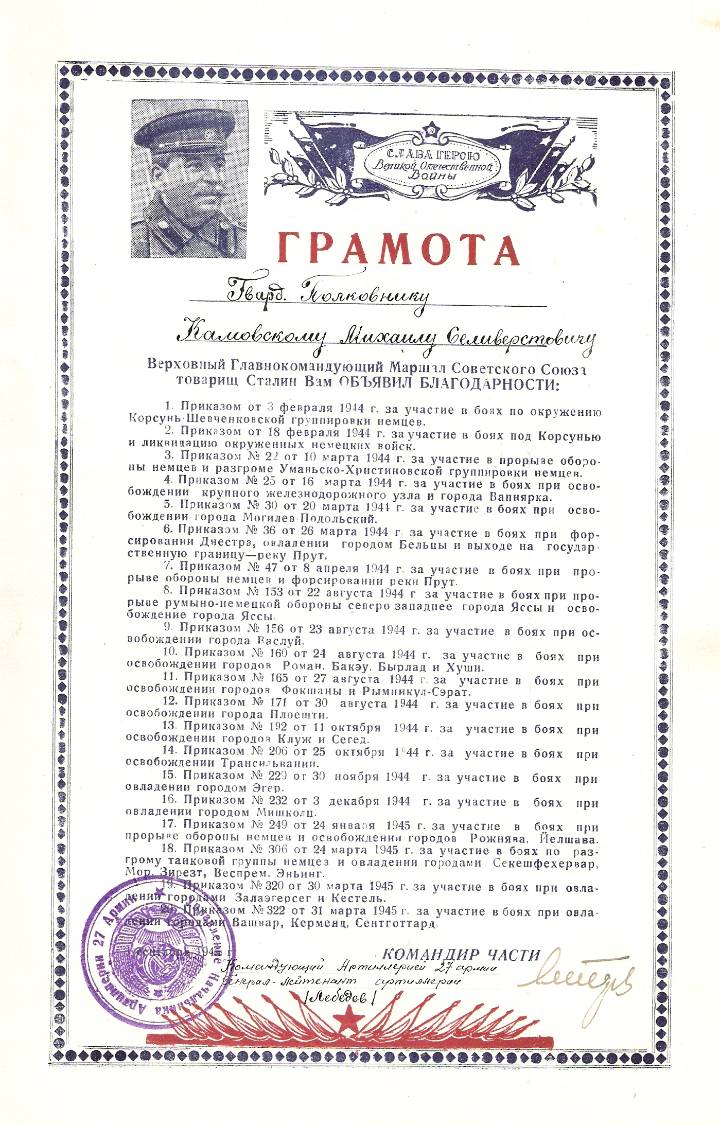 Это мой дедушка, 1905 года рождения, гвардии полковник, Камовский Михаил Селивёрстович. Закончил войну командующим артиллерии 206 Корсуньской, Краснознамённой, орденов Суворова, Кутузова и Богдана Хмельницкого стрелковой дивизии 9 мая на р.Мур у г.Брук, Австрия. Награждён: орденом Ленина, тремя орденами Красного Знамени, орденом Красной Звёзды,орденом Суворова, орденом Кутузова, медалями "За взятие Будапешта", "За победу над Германией" и другими. Грамотой Верховного Главнокомандующего Маршала Советского Союза т.Сталина с 20(!) благодарностями. Трижды был ранен.