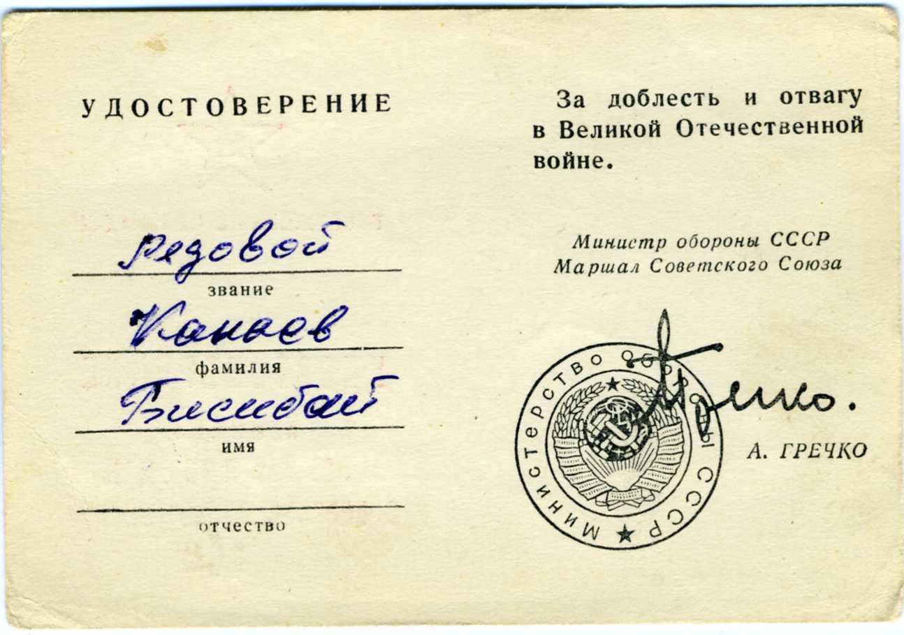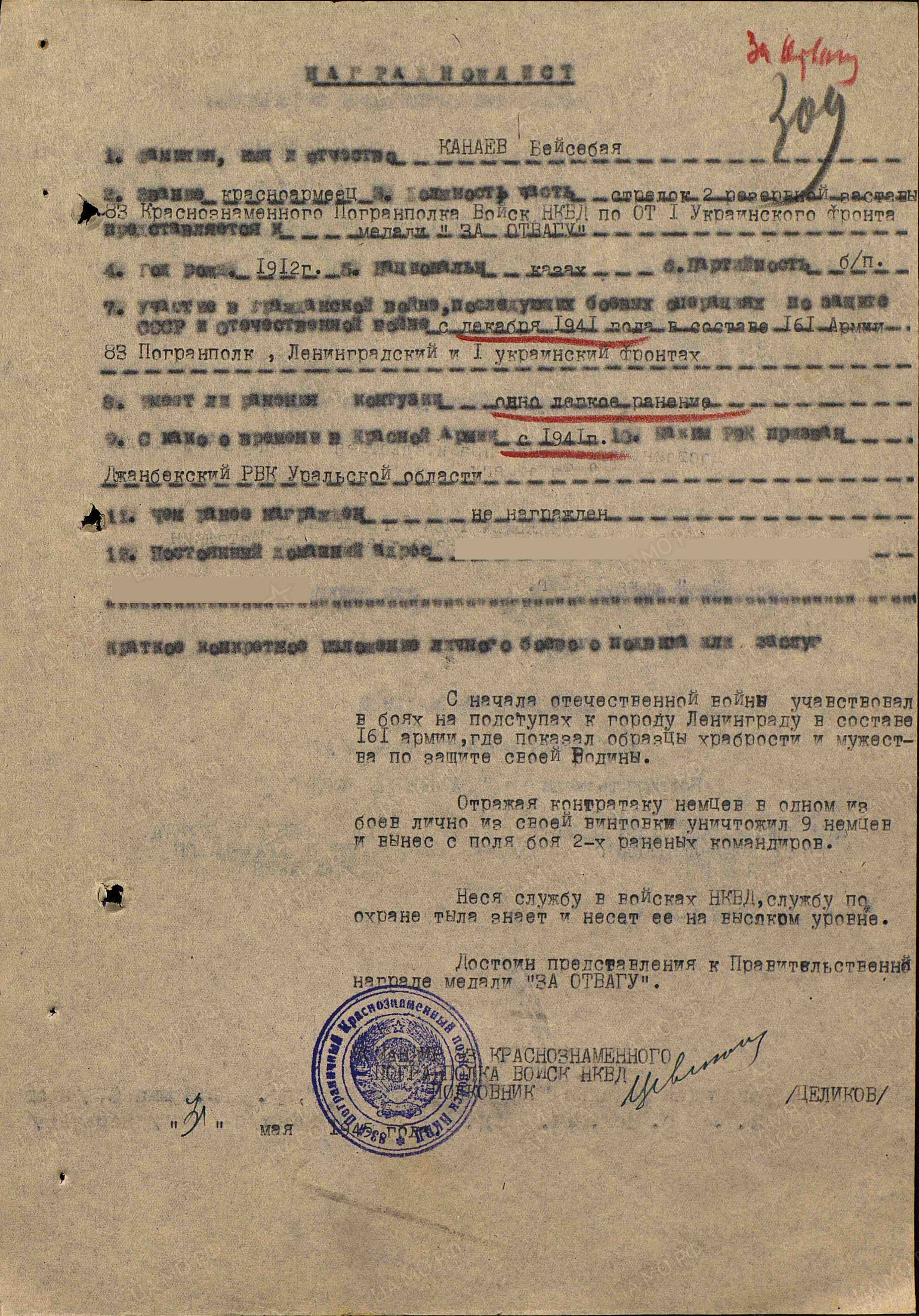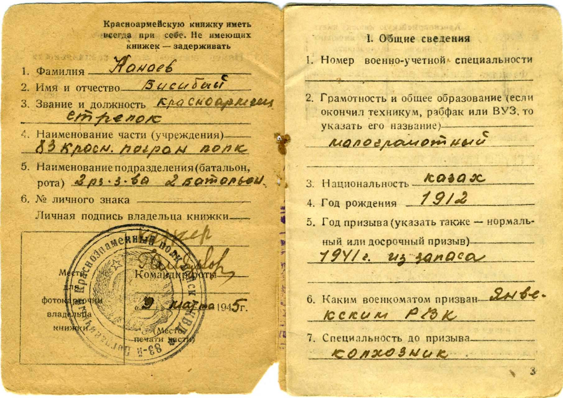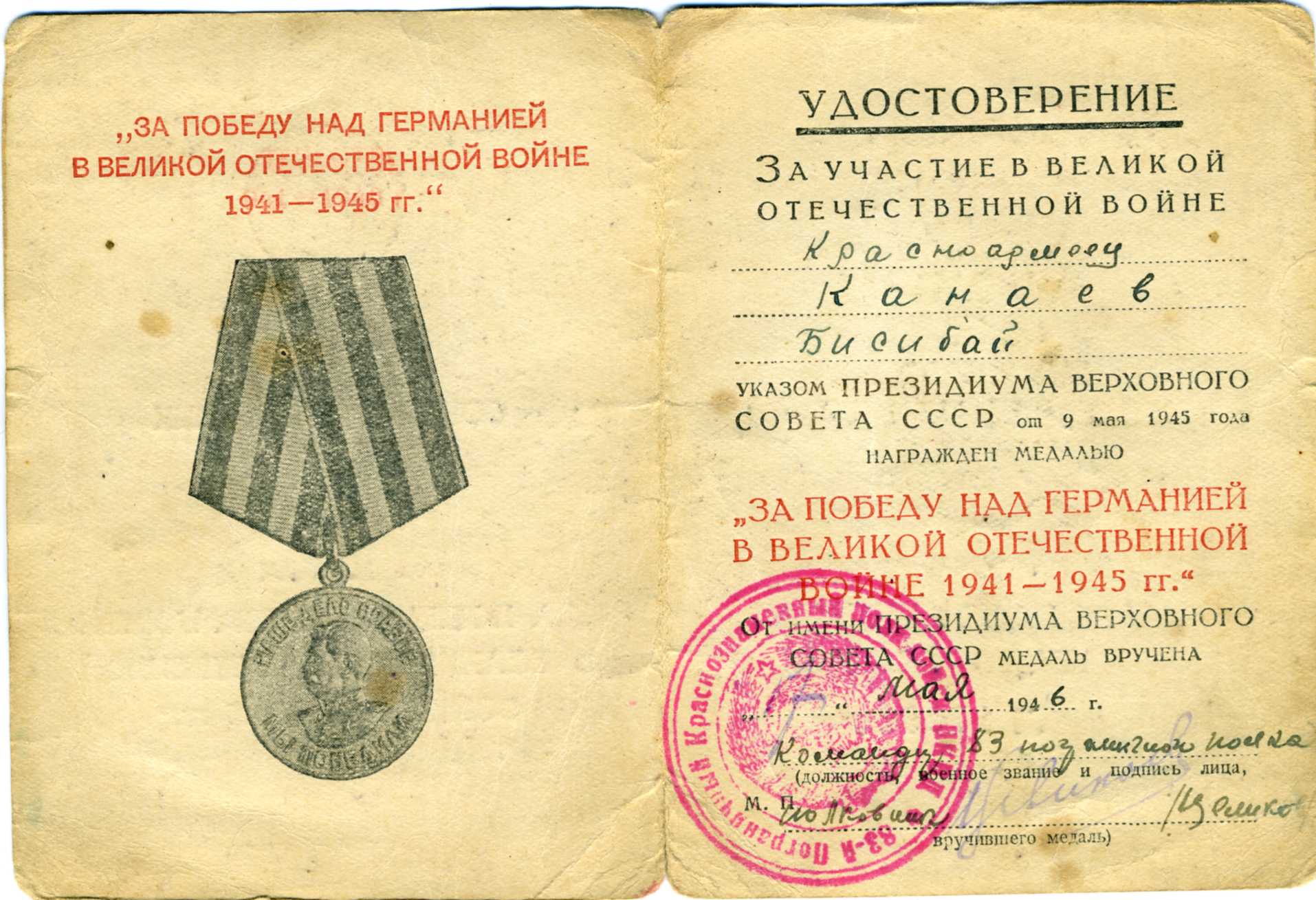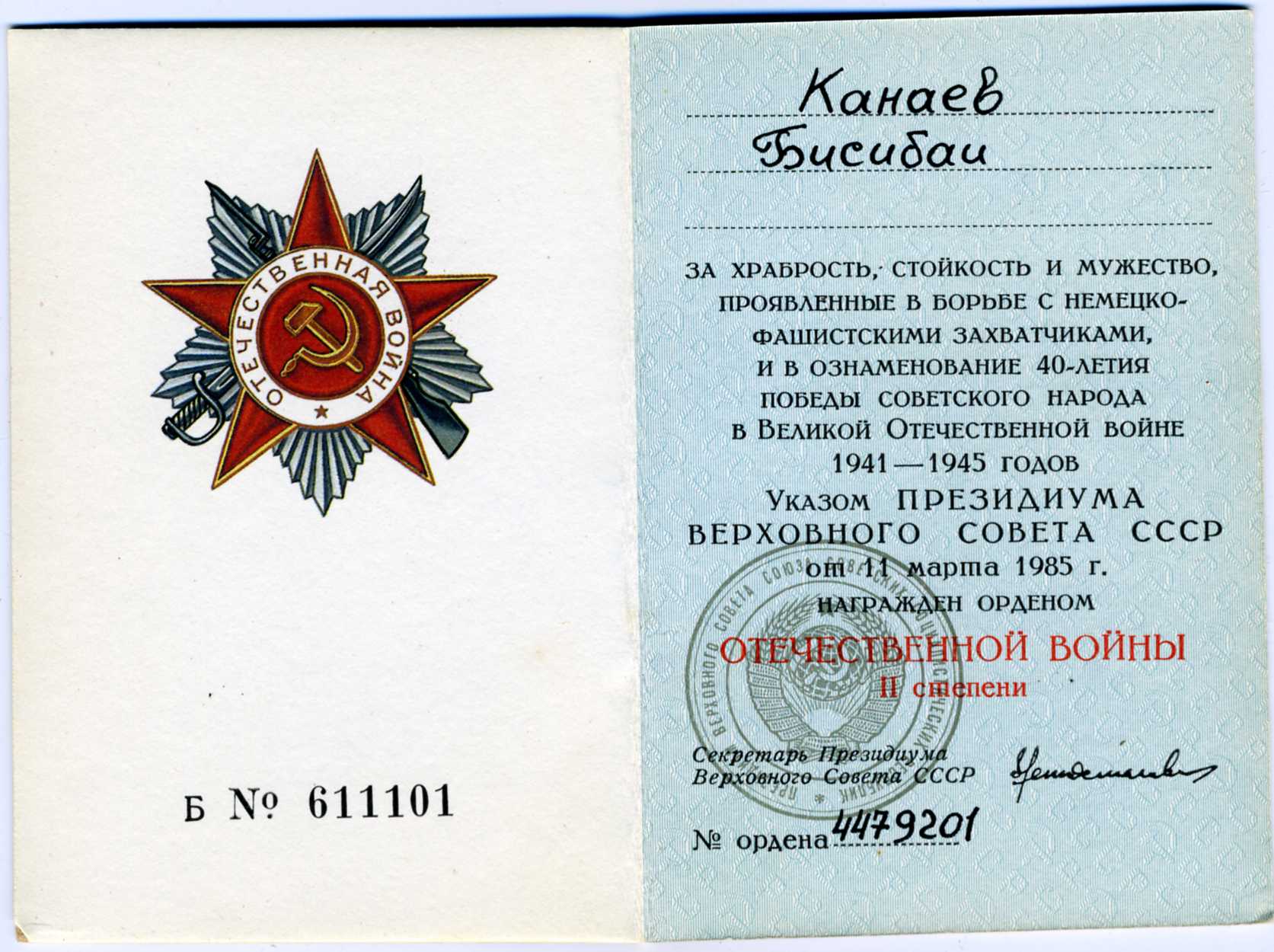 Родился в 1912 году (день и месяц не известны) на территории Западно-Казахстана России. Был призван в армию в 1934 году. Участник Великой Отечественной Войны с 1941 по 1945, Победу встретил в Германии в городе Зуль. Службу закончил в сентябре 1947 г. Перед войной проживал в с. Бирлик Бурсынского сельского совета Джаныбекского района Западно-Казахстанской области, откуда был призван 05.03.1941 года в армию из запаса. Служить начал рядовым в составе 83 Пограничного Краснознаменного полка войск НКВД. Снят с воинского учета по достижении предельного возраста 21.01.1963 года. После демобилизации проживал в Казахской ССР, а в 1953 г. переехал в с. Савинка (в настоящее время Палласовский район Волгоградской области). Был членом колхоза, реорганизованного в дальнейшем в совхоз им. Чапаева, работал в животноводстве. На пенсию вышел 05.05.1972 года. Был женат. Супруга Канаева Кульмай (1913-1992) работала также в сфере животноводства. Единственный сын – Ермек (1948-2023) – работал педиатром и рентгенологом в ГБУЗ «Палласовская ЦРБ» с 1973 по 2023 годы. Канаев Бисибай ушел из жизни 10.08.1989 г. в городе Палласовке. Похоронен в мусульманской части городского кладбища. Воспоминаний о войне не оставил. Удостоверение Ветерана Великой Отечественной войны от 21.10.1980 г. № 598664. Награды Канаева Бисибая: - медаль «За победу над Германией в Великой Отечественной войне 1941–1945 гг.» - Указ Президиума Верховного Совета СССР от 09.05.1945 - вручена 07.05.1946 полковником 83-го Пограничного Краснознаменного полка войск НКВД Целиковым (удостоверение Щ № 170380); - медаль «За боевые заслуги» – Указ Президиума Верховного Совета от 17.10.1938 г. Об учреждении медали «За боевые заслуги» - вручена 12.08.1946 г. (удостоверение № 763918, медаль № 2370480); Информация о награде Канаева Бисибая (с опечаткой в имени) отражена на сайте https://podvignaroda.ru/ : https://podvignaroda.ru/?#id=43966389&tab=navDetailManAward Выписка из Наградного листа: «Краткое конкретное изложение личного боевого подвига или заслуг: С начала отечественной войны участвовал в боях на подступах к городу Ленинграду в составе 161 армии, где показал образцы храбрости и мужества своей Родины. Отражая контратаку немцев, в одном из боев лично из своей винтовки уничтожил 9 немцев и вынес с поля боя 2-х раненых командиров. Неся службу в войсках НКВД, службу по охране тыла знает и несет ее на высоком уровне. Достоин представления к Правительственной награде медали «ЗА ОТВАГУ» Командир 83 Краснознаменного погранполка войск НКВД Полковник Целиков 31 мая 1945 года». А также: - орден Великой Отечественной войны II степени - Указ Президиума Верховного Совета СССР от 11.03.1985 г. (номер ордена № 4479201, удостоверение Б № 611101); - Знак «25 лет Победы в Великой Отечественной Войне» - № 34 - Приказ МО СССР (Гречко А.А.) № 59 от 17 марта 1970 года; - юбилейная медаль «30 лет Победы в Великой Отечественной Войне 1941–1945 гг.» от 08.05.1976 г. - Указ Президиума Верховного Совета СССР; - юбилейная медаль «40 лет Победы в Великой Отечественной Войне 1941–1945 гг.» от 07.05.1985 г. - Указ Президиума Верховного Совета СССР от 12.04.1985 г.; - юбилейная медаль «60 лет Вооруженных Сил СССР» - Указ Президиума Верховного Совета СССР от 28.01.1978 г.; - юбилейная медаль «70 лет Вооруженных Сил СССР» - Указ Президиума Верховного Совета СССР от 28.01.1988 г.