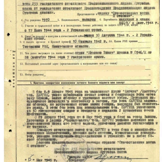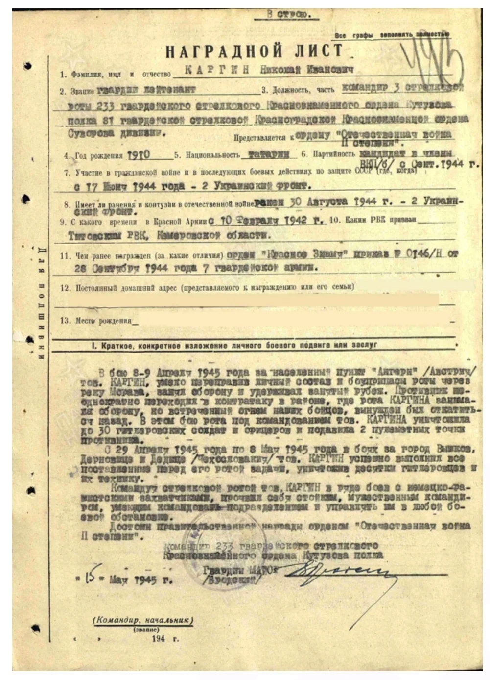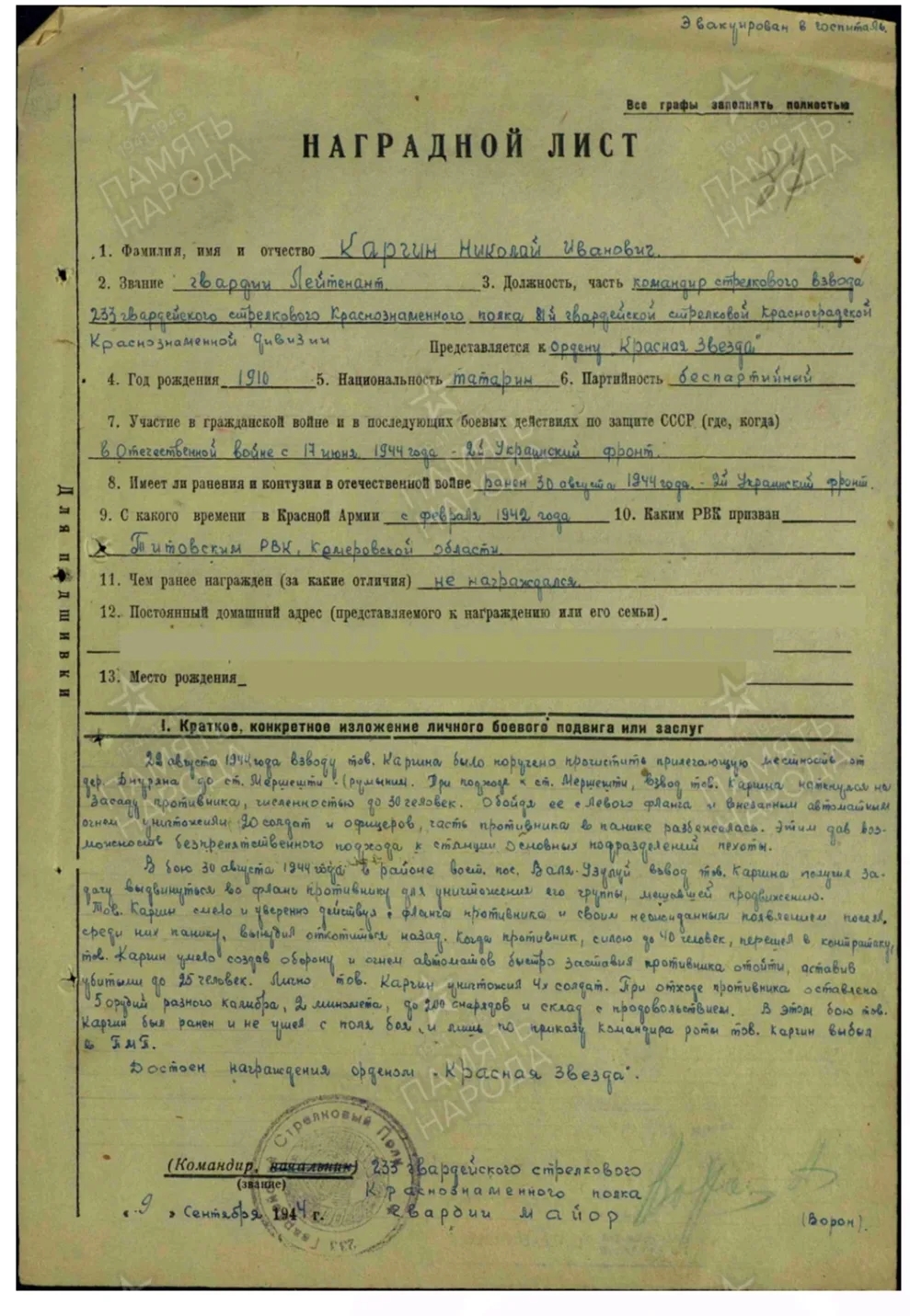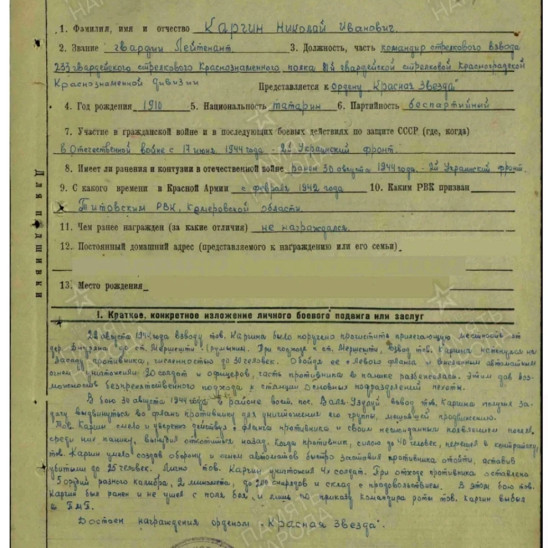 Николай Иванович в возрасте 32 года призвался 23.08.1942 В воинскую часть 233 гвардейский стрелковый полк 81 гвардейской стрелковой дивизии; 53 гвардейский стрелковый полк 18 гвардейской стрелковой дивизии; 18 гвардейский минометный полк; Центральный фронт; 7 гвардейская армия; 24 гвардейский стрелковый корпус. В наградном листе говорится о его подвиге следующее: «…В бою 30 августа 1944 года взвод товарища Каргина получил задачу выдвинуться во фланг противнику для уничтожения его группы мешавшей продвижению. Товарищ Каргин смело и уверенно действуя с фланга противника и своим неожиданным появлением посеял среди них панику, вынудил откатиться назад. Когда противник, силою до 40 человек, перешёл в контратаку, товарищ Каргин умела создал оборону и огнём автоматов быстро заставил противника отойти, оставив убитыми до 25 человек... В этом бою товарищ Каргин был ранен и не ушёл с поля боя и лишь по приказу командира роты товарищ Каргин выбыл в ПМП." Окончил службу 30.03.1946 После войны жил в Колхозе Им. Ильича, работал учителем младших классов. Ушёл из жизни в возрасте 58 лет.