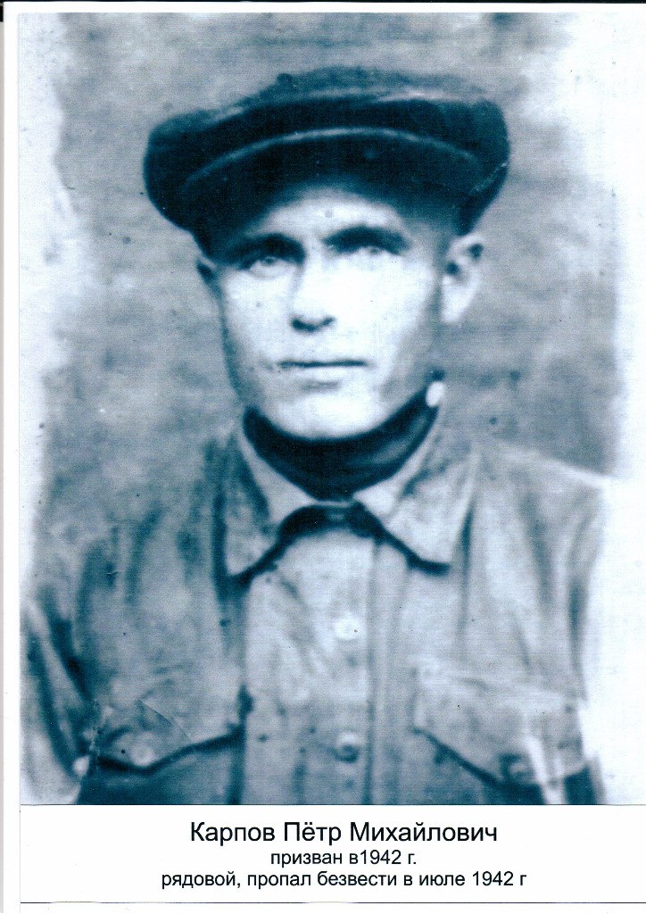 Боевой путь ветерана Карпов Петр Михайлович 1907г - 1942г. Уроженец деревни Коржавина, Слободо-Туринского района Свердловской области. До войны работал в сельском совете, затем учетчиком на ферме. Призван на фронт 5 января 1942г. Служил в 264 гвардейском полку(полевая почта №5). Пропал без вести в июле 1942г в Харьковском котле, где были разгромлены три армии. Жена Варвара Васильевна работала дояркой и одна воспитала четверых детей. Дочь Храмцова Валентина Петровна проживает в селе Храмцово Слободо-Туринского района, работала секретарем сельского Совета, сын Карпов Иван Петрович, закончил Суворовское училище, кадровый офицер, проживает в Белоруссии.