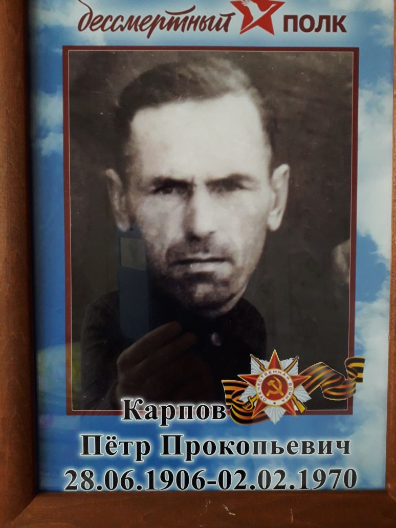 Карпов Пётр Прокопьевич. Младший сержант, санитар Медсанвзвода. Радиотелеграфист 24 мотострелкового пулеметного Батальон 24 танковой Бригады. Представлен к медали "За боевые заслуги", и медали "За отвагу". Прошёл всю Великую Отечественную Войну. Участник Западного и Прибалтийского фронта. В боях проявил смелость и отвагу. Дважды ранен. Будучи радистом, под сильным артиллерийско-минометным огнём противника обеспечивал всегда бесперебойную связь. В бою за деревню Сталина Витебской области 15.11.1943 года участвовал в отражении контратаки немцев лично уничтожив из своего автомата 4 немцев.20.08.1944 получил задачу эвакуировать группу раненых в количестве 7 человек. К ночи того же дня немцы отрезали путь эвакуации и замкнули его в кольцо. Он увёл раненых из под обстрела, и на вторые сутки вывел всех раненых из окружения.