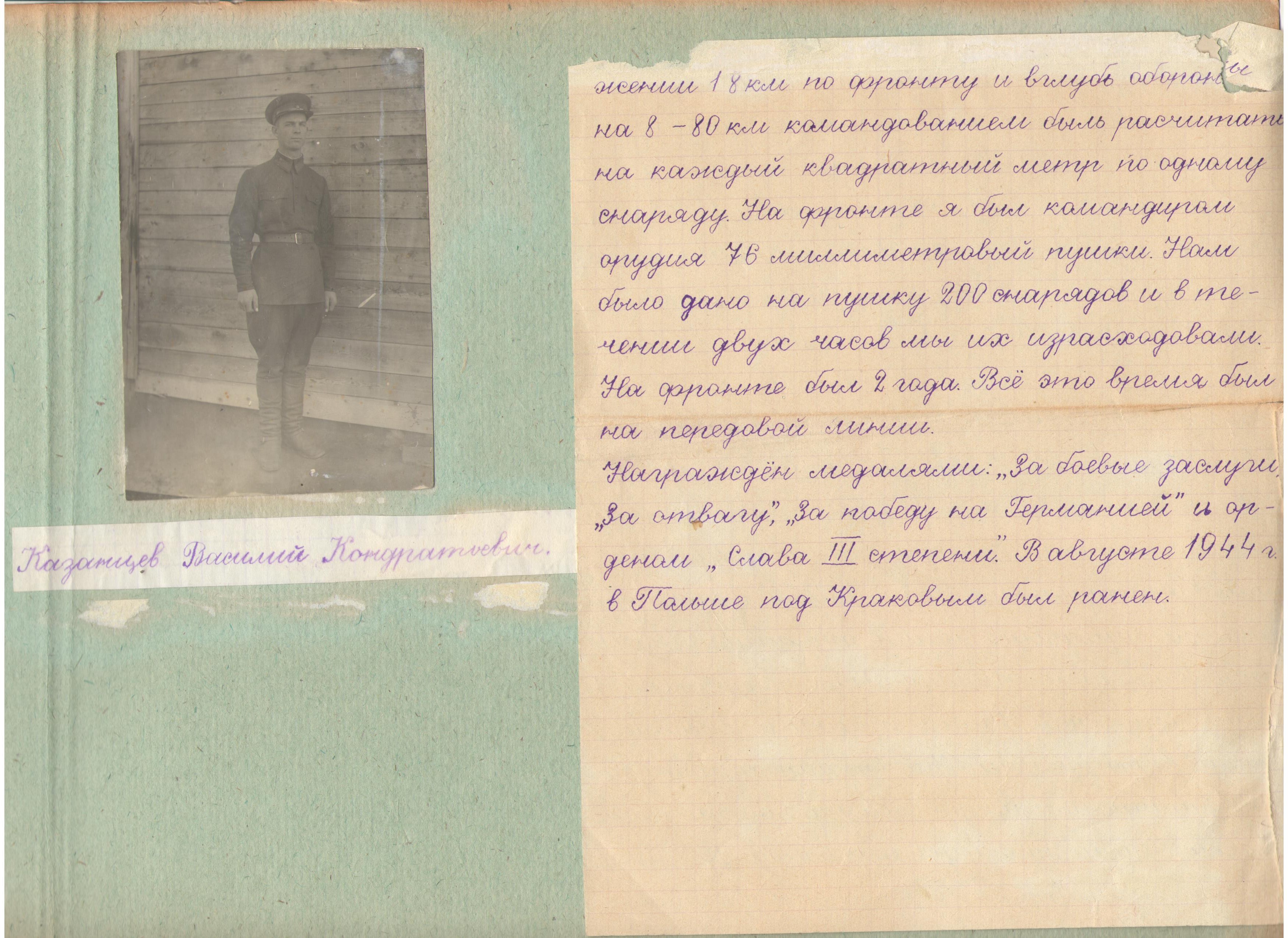 21.03.1944 Медаль «За отвагу» Подвиг: В боях за Социалистическую Родину проявил мужество и отвагу. 15 марта в бою за деревню Войница Ровенской области и при форсировании реки Иква, огнем своего орудия уничтожил танковый пулемет и до отделения автоматчиков противника, расстреливая их прямой наводкой. 02.09.1944 Орден Славы III степени Подвиг: Василий за время наступательных боев проявил себя мужественным и стойким командиром. Во время прорыва обороны 16.07.44 г., своим орудием прямой наводкой уничтожил 1 пулемет и 1 Двот. В бою за население Мункт Пустельники уничтожил своим огнем 1 пулемет и до наступления пехоты противника, этим самым обеспечил быстрой продвижение нашей пехоты. В РККА с 1939 года, место призыва: Невьянский РВК, Свердловская обл., Невьянский р-н. № записи - 21779754. Служил на Дальнем Востоке на границе. В 1943 году были отправлены в г. Елец Челябинской обл. для формирования и отправки на фронт. Зимой 1943 года прибыли в район Курской Дуги. Добирались в грузовых вагонах, из еды была только овсянка. Орудия везли с собой. С вокзала до передовой добирались 20 дней. Назначили Василия командиров орудия -75ки на конной тяге. Обслуживали пушку- 5 человек. Очень впечатляюще рассказывал про артподготовку перед битвой на Курской Дуге. 2 часа без перерыва бьют все орудия по намеченным целям. 3-4 дня не прерывно шел бой. сколько погибло народу немыслимо. Но они со своей пушкой всегда были в зади, вели бой с флангов. Еду в основном варили себе сами. Для Василия война закончилась под Краковым. Польша. По ранению он был комиссован и отправлен домой. День Победы справлял дома. Рассказ самого Василия: В 1943 году, в феврале наша армия сформировавшееся в Челябинской обл., прибыла в район Курской Дуги, где мы и держали оборону до июля месяца 1943 года. В июле месяце гитлеровская армия пошла в наступление на Курском и Белгородском направлениях. Наши войска держали оборону в течении 12 суток. Немцы на маленькие участки бросали 200 танков, большое количество самолетов и пехоты. Наши войска отбивали атаки. За это время немцы истребили основные силы. Теперь наша армия пошла в наступление. Ночью наша армия пришла на передовую линию фронта. В 8 часов утра начали артиллерийскую подготовку. Вели огонь 2 часа. Наши танки и пехота пошли в наступление. На вторые сутки удалось занять немецкую оборону. Дальше наши войска стали преследовать врага. Для того, чтобы прорвать линию обороны на протяжении 18 км по фронту и вглубь обороны на 8-80 км командованием было рассчитать на каждый квадратный метр по одному снаряду. На фронте я был командиром орудия 76 миллиметровой пушки. Нам было дано на пушку 200 снарядов и в течении 2 -х часов мы из израсходовали. На фронте был два года. Все это время был на передовой линии. В августе 1944 года в Польше под Краковым был ранен.