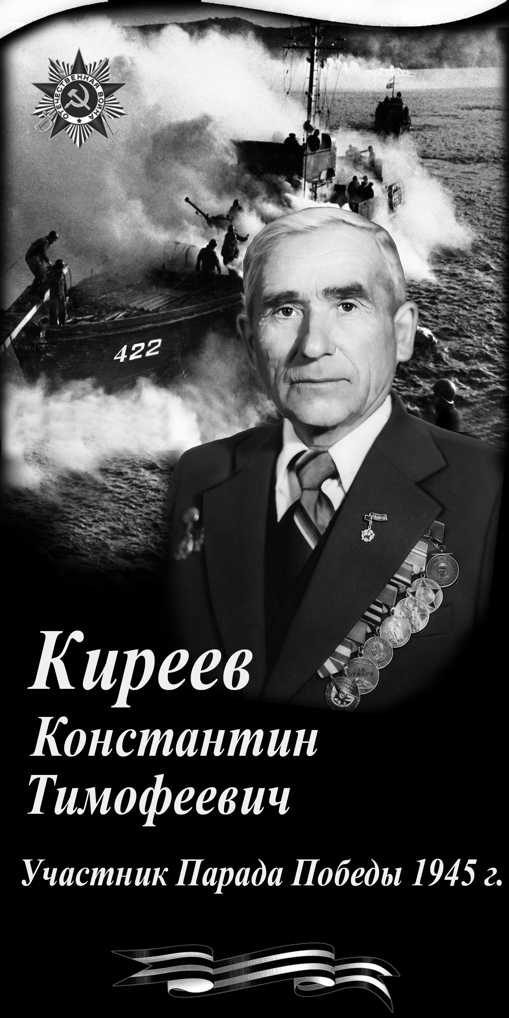 Родился 13 мая 1918 года ПРОШЕЛ ВСЮ ВОЙНУ Служил с 1939 по 1944 на Северном Флоте, с 1944 по 1946 на Черном море, командиром отделения минеров и пулеметчиков. Лично сбил фашистский бомбардировщик, лично разминировал около полусотни морских мин. Участвовал в освобождении Болгарии и Румынии. За проявленный героизм награжден Орденом Боевого Красного Знамени, Орденом Отечественной войны 1-й степени, медалью Ушакова, медалью За отвагу и другими медалями Удостоин высокой чести в составе сводного полка Военно-морского Флота маршировать в день Великого Парада Победы по Красной площади 24 июня 1945 года. .Службу он проходил в составе ОВРа (охрана водного района) на Баренцевом море в составе Северного Флота в подразделении дивизиона морских охотников на катере МО-422 в должности командира отделения минеров и пулеметчиков в звании старшина первой статьи. Служба подходила к концу, когда страшное слово «война» обрушилось 22 июня 1941 года в бухте Североморска бомбами немецких самолетов. Это в первый день не различали, кто свой, а кто чужой, но через неделю уже разобрались. Шел седьмой день войны, когда случился тот налет вражеских самолетов, где в упор сошлись за пулеметом старшина Киреев и ас Люфтваффе за штурвалом Мессера. Сыпались бомбы, пулеметные очереди прошивали море, казалось, что оно кипит, но и пулемет Константина не молчал. И вот задымившись, самолет рухнул в воду, но и сам матрос получил тяжелое ранение в голову. Без сознания старшину доставили в госпиталь. Наградой за подвиг была главная медаль войны- Медаль « За Отвагу» за № 27742. Потом было еще много боевых походов, высадки десантов в норвежские фьорды, сопровождений транспортов, охота за немецкими подводными лодками и вновь бои, бои, бои. Грудь украсила еще одна высокая награда «Медаль Ушакова» за № 3640, а на теле прибавилось шрамов от ран да навсегда 26 осколков в левой ноге. После одного из тяжелейших походов и лечения после ранения, в июле 1943 года в разгар войны ему был предоставлен десятидневный отпуск на родину. Свою Смоленщину Константин не узнал. Братья воевали , сестру угнали в Германию, младший брат попал в концлагерь, но только крепче росла ненависть к врагу. Война продолжалась. Не единожды пришлось отцу встречаться лицом к лицу со смертью. В 26 лет отец мой поседел почти полностью, потому что приходилось собственноручно разминировать морские мины, а делал он это мастерски (ведь не случайно говорят ,что сапер ошибается только один раз) а он не ошибся ни разу, хотя около полусотни этих рогатых громадин ему пришлось усмирить. Обычно после команды на уничтожение, мину пробовали расстрелять из пулемета, но когда на море качка, а она там всегда, о каком прицельном огне может идти речь. Тогда принимается решение об использовании малого заряда для подрыва мины. А как это сделать, как прикрепить, как взорвать и себя не покалечить. Вот здесь и приходилось моему отцу принимать решение - кто пойдет к мине, и как командир отделения не смог он посылать никого , а садился в шлюпку всегда сам и только на веслах кто-то из друзей. Выставив вперед руки, лежа на корме шлюпки приходилось ему встречаться с «рогатиной» Сразу не определишь, что за мина - магнитная или обычная. И вот здесь самый страшный момент –момент первого прикосновения к мине ( это когда седеет волос, это когда противный холод пронзает все тело), а д