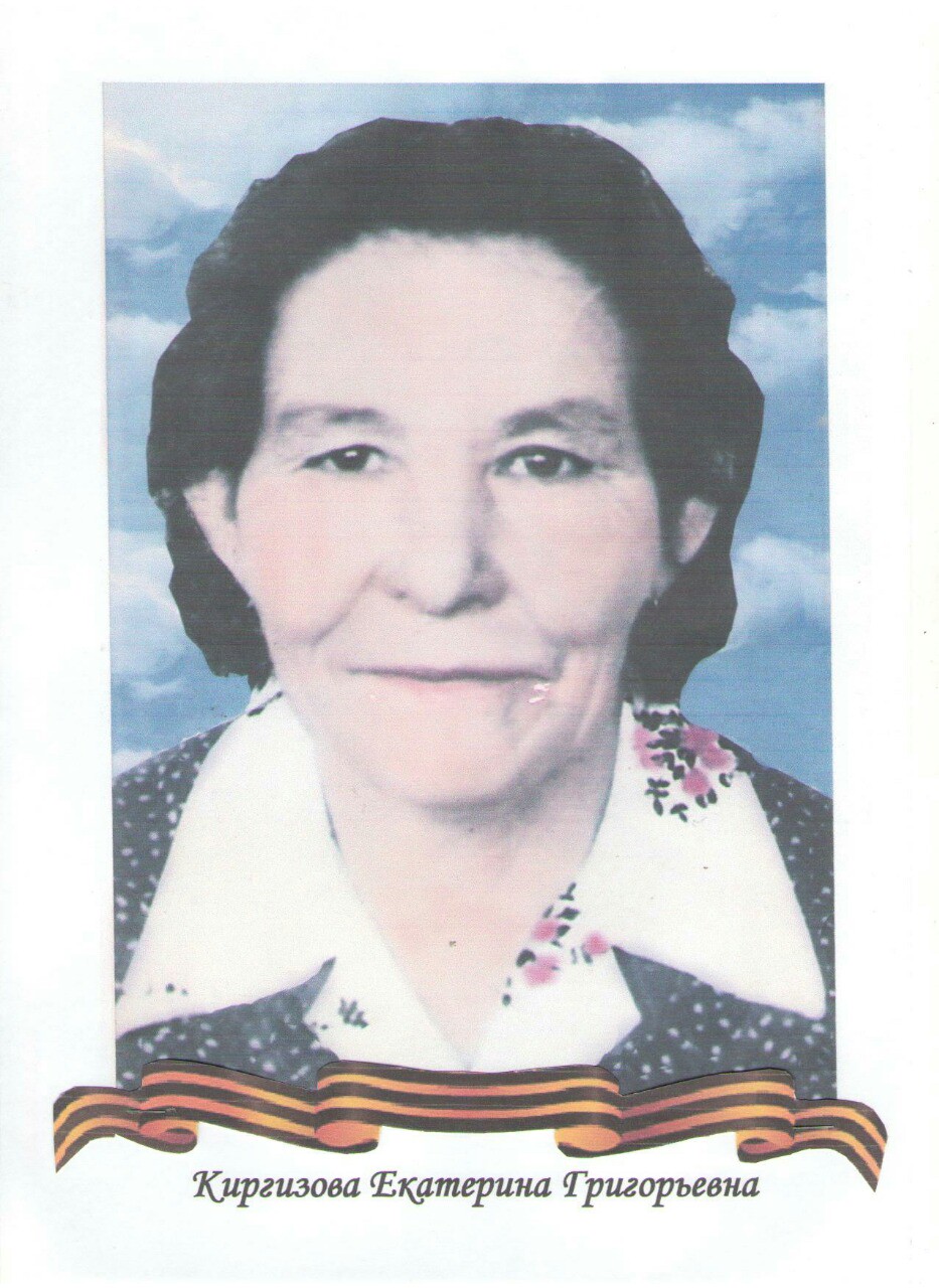 Когда началась Великая Отечественная война, Екатерине было 12 лет, Отец Григорий Алексеевич вместе с сыновьями Алексеем и Константином ушли на фронт. Мама, Киргизова Степанида Борисовна осталась с младшими детьми в поселке Поворот Бурятской АССР. В тяжелые, голодные военные годы дети много работали на сельхозработах, чтобы прокормить семью и помочь продовольствием фронтовикам. Лозунг "Все для фронта, все для для Победы!" был жизненным девизом от мала до велика. Маленькая Катя с раннего утра и до позднего вечера работала на ферме: пастухом на пастбище крупного рогатого скота, ухаживала за овцами в колхозе. Дети в суровых сибирских условиях работали до снега на сельских полях: убирали картофель, собирали колоски пшеницы в поле, оставшихся за комбайном. Потом, уже в мирное время, Екатерина Григорьевна со слезами на глазах вспоминала свое голодное военное детство. Что составляло рацион питания детей военного времени не возможно даже представить сейчас нашему поколению. Не смотря на все трудность Екатерина Григорьевна была очень добрым и отзывчивым человеком. Вырастила троих детей, помогала всем своим внукам. В поселке все жители относились к ней с уважением. Ребенок войны, труженица тыла, в 2003 году получила удостоверение ветерана ВОВ, а в 2005 году Екатерины Григорьевны не стало.