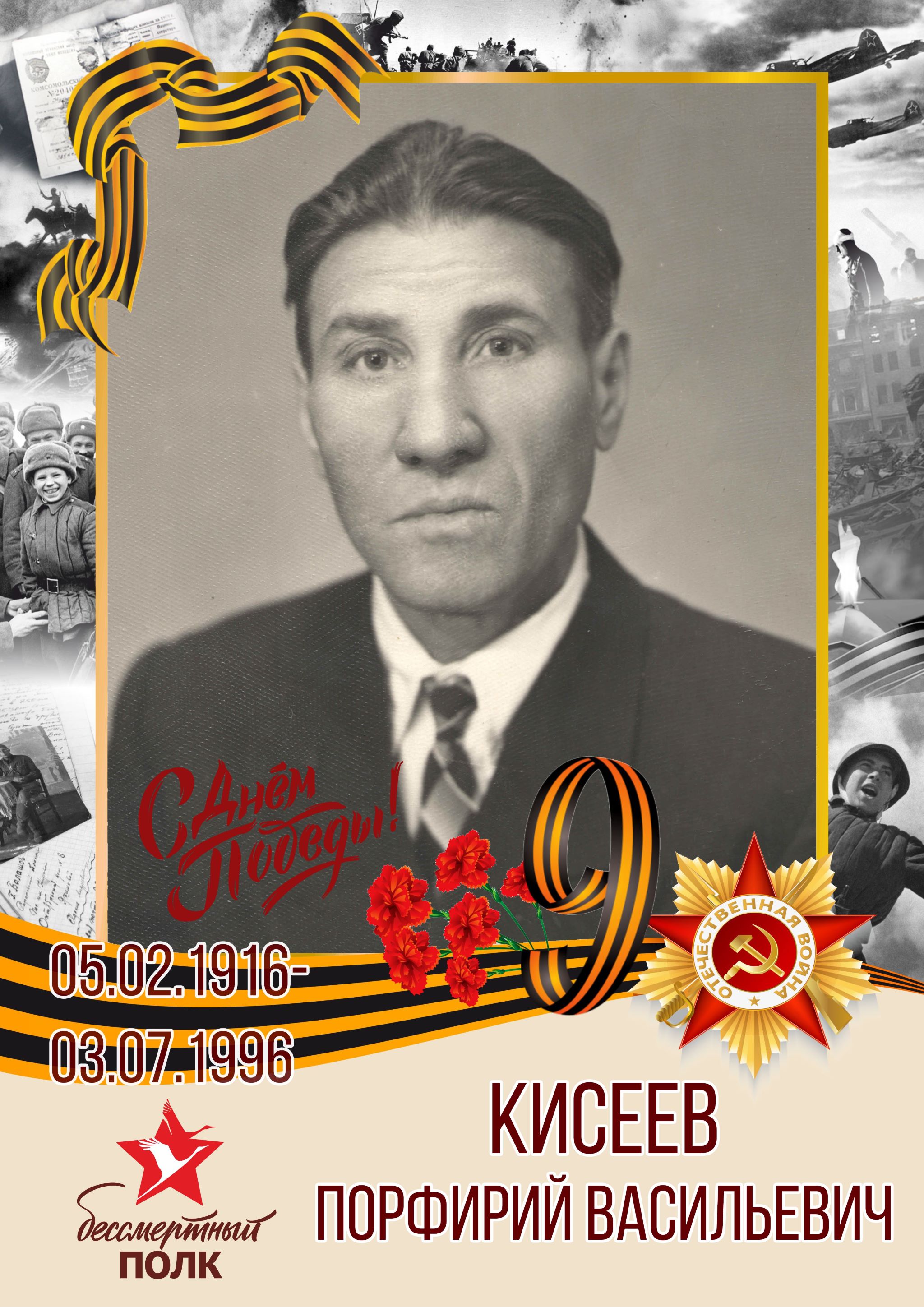 Мой дедушка, Кисеев Парфирий Васильевич родился 5 февраля 1916 года в деревне Апак-Джанкой Крымской области. В 1938 году призвали в Армию. В 1939 году началась Советско - Финская война, на которой он воевал 2 года. В сентябре 1941 года призвали в 827 отдельный строительный батальон 51 Приморской армии. Воевал в Севастополе, на Керченском полуострове, участвовал в освобождении Севастополя и Кубани. В октябре 1944 года попал в плен в Сборный лагерь ЗЕННЕ № 1 Шталаг-326 VI-K. После 4-х месяцев нахождения в лагере дедушка и ещё несколько человек бежали, но были пойманы и возвращены для тяжёлых работ. 2 апреля 1945 года военнопленные были освобождены американскими танковыми частями. После плена, когда началась Японская война, дедушку отправили на войну с японцами. По окончании войны дедушка вернулся домой с наградами.