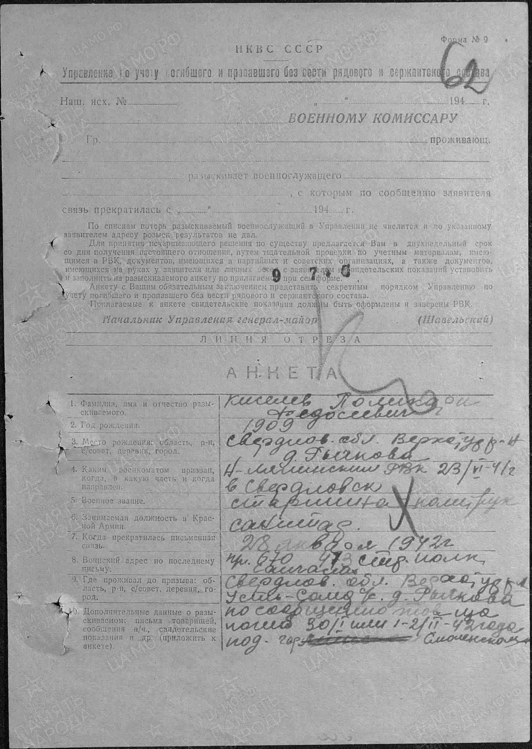 Киселёв Поликарп Федосеевич родился в 1909 году. В семье Киселёвых было 7 детей: пять сыновей и две дочки. Жили они в д.Рычкова. Поликарп Федосеевич был старшим в семье. В довоенное время он возглавлял колхоз им. Осоавихима, был членом ВКП(б). Началась война, на фронт стали забирать мужчин, а Поликарпа Федосеевича не брали, поскольку он работал председателем и должен был остаться на трудовом фронте. Но запретить идти на фронт тоже никто не мог. Прадед посчитал, что оставаться в тылу неправильно и отправился добровольцем. Ушёл на войну в июле 1941 года. Дома осталась жена с тремя детьми. Старшему было 10 лет, среднему- 6 лет, младшему- 2 года. Уходя сказал: "Старший Виктор меня запомнит, средний Пётр забудет, а младший сын Михаил и знать не будет" Эти слова оказались пророческими. Будто он чувствовал, что не вернётся с войны. Последнее письмо семья получила в декабре 1941 года. Адрес отправителя: полевая почта 670, 473 стрелковый полк. В апреле 1942 года родным пришло известие, что старшина, младший политрук Киселёв Поликарп Федосеевич пропал без вести под Смоленском. По сообщению боевого друга погиб в бою 30 января или 1-2 февраля 1942 года.
