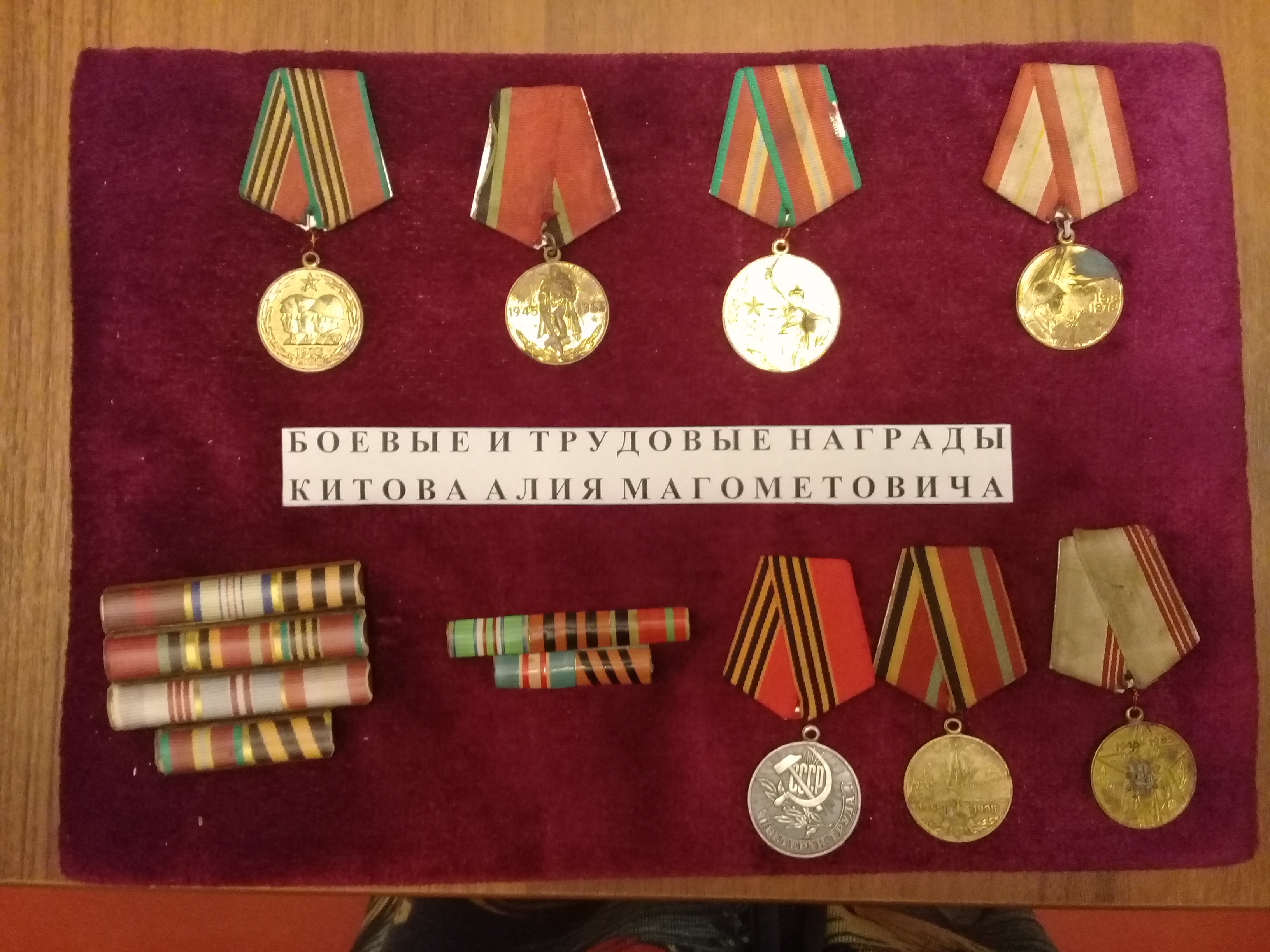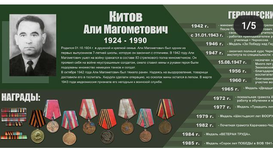За долголетний добросовестный труд от имени Президиума Верховного Совета СССР, решением исполкома Карачаево-Черкесского областного Совета народных депутатов от 26 сентября 1984 года Китова Али Магометовича наградили медалью "Ветеран труда".
