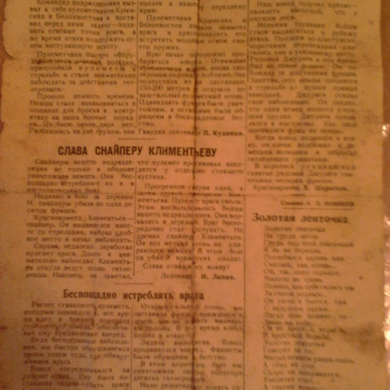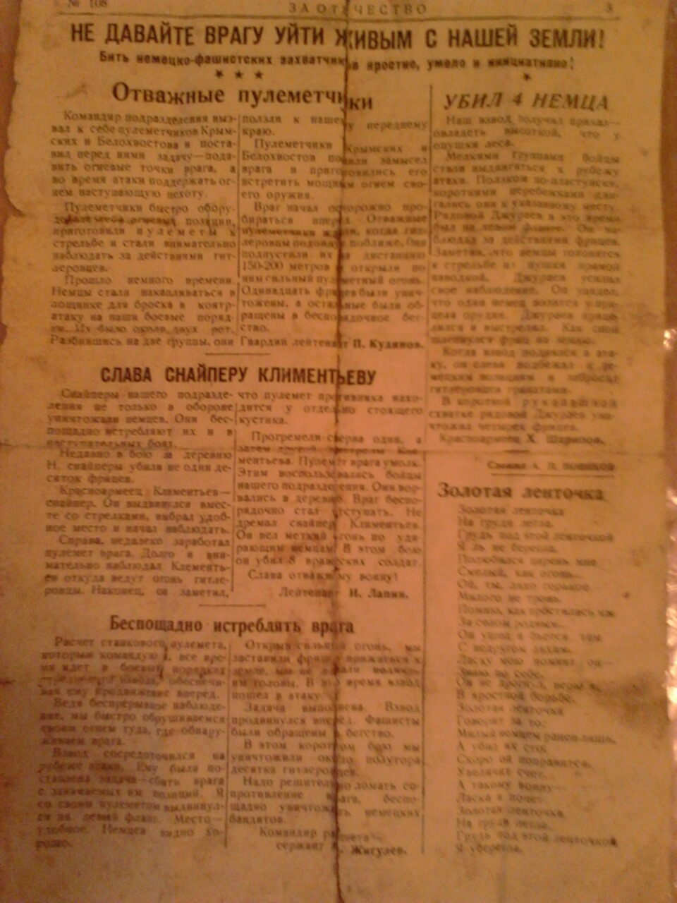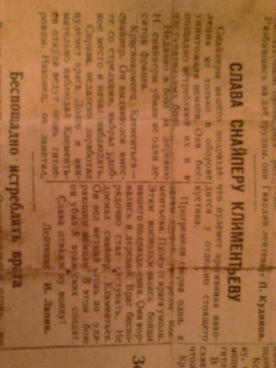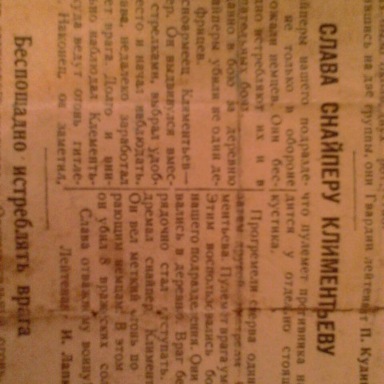 По рассказам дед охотился только за "дубками" на погонах. После выхода статьи в полевой газете (нашей) за ним началась "охота"..... после Манжурия...и после войны дед охотился на крупных хищников...